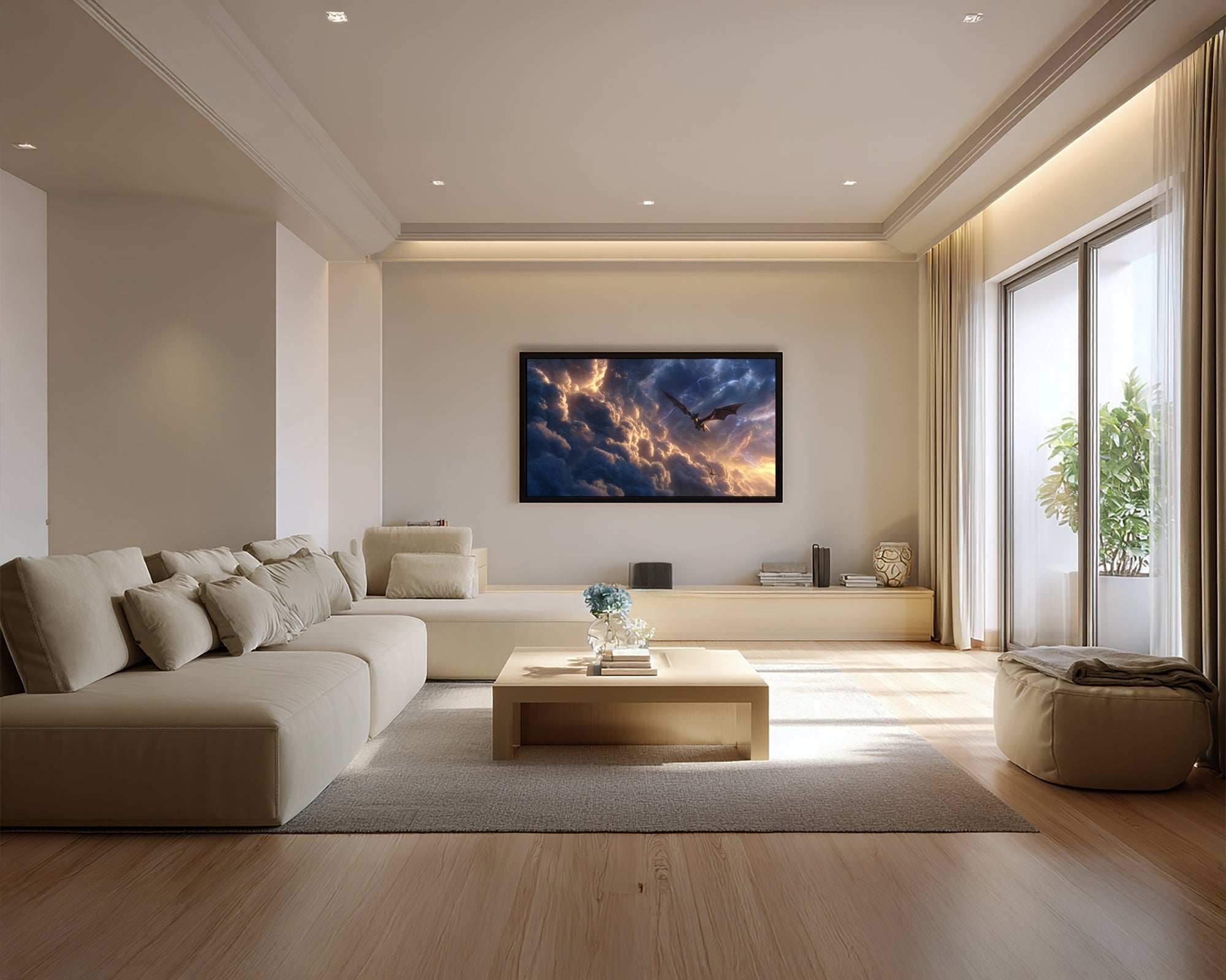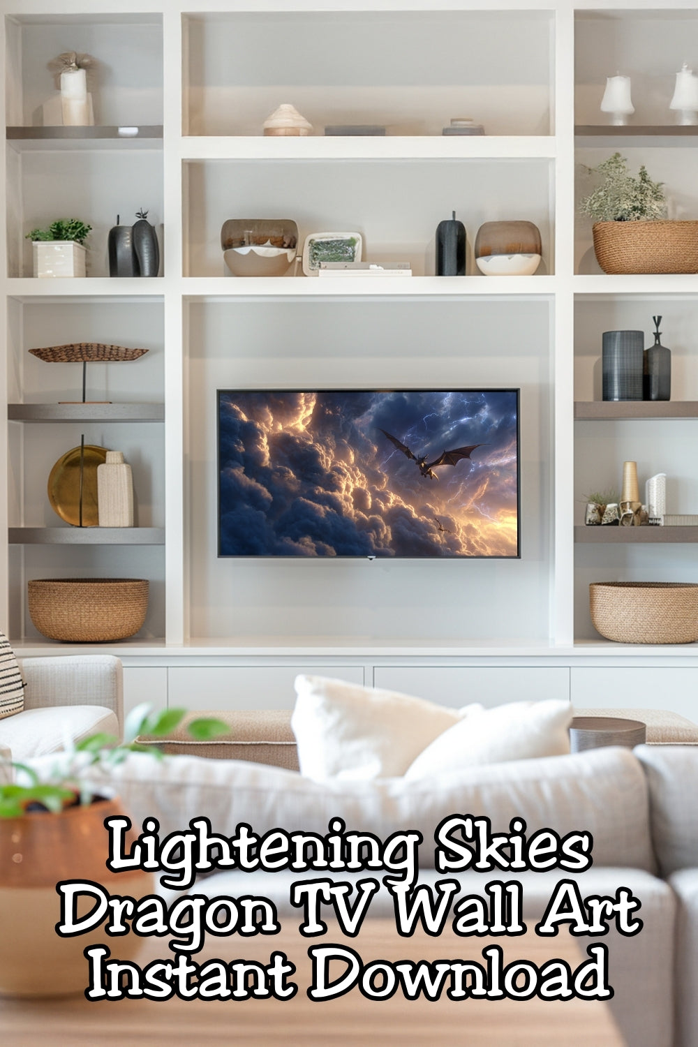 A fierce black dragon soars through lightning-filled storm clouds, glowing against a cinematic fantasy sky. This piece instantly transforms your space into a fantasy escape, making it perfect for reader bedrooms, cozy reading nooks, dark academia shelves, or statement TV wall art. Displayed as Frame TV art or Samsung Frame TV art, it looks like a moving painting straight out of a fantasy book cover.