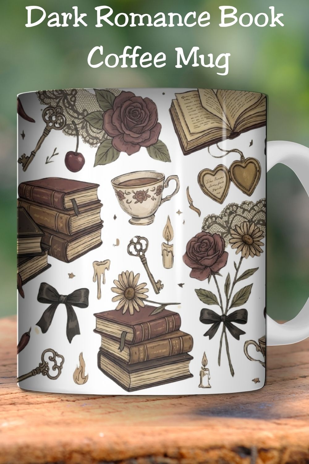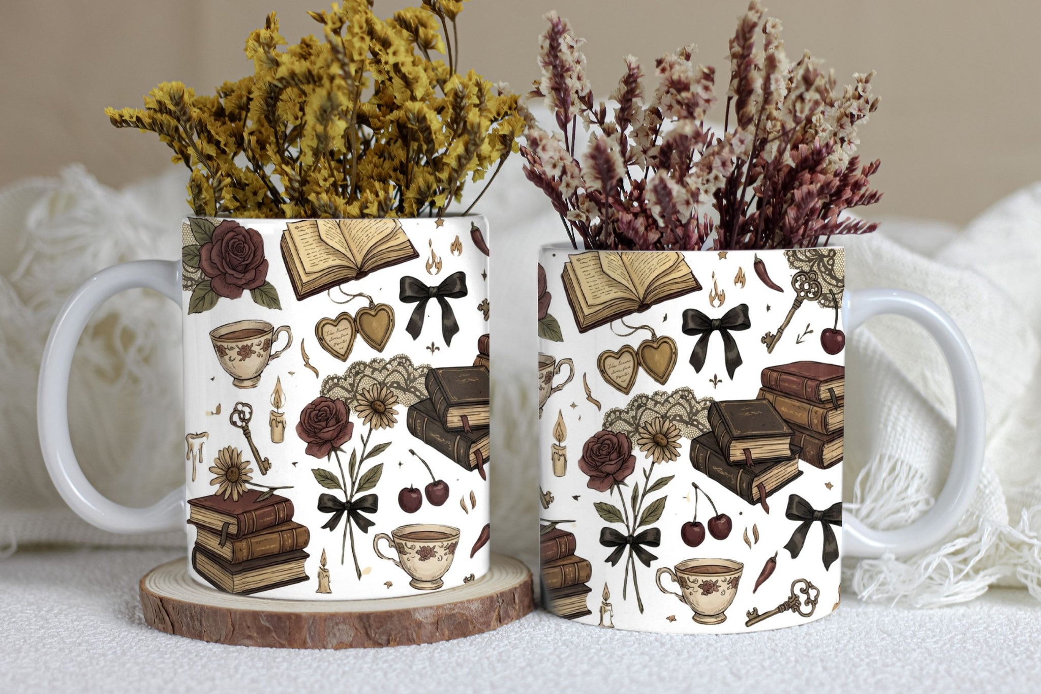 For readers who love dark romance, gothic aesthetics, and cozy late-night chapters, this Dark Romance Book Mug brings BookTok energy straight to your coffee routine. Featuring vintage stacked books, moody roses, candles, lace details, cherries, keys, and subtle flame accents, this design captures the perfect dark academia romance vibe readers can’t get enough of.