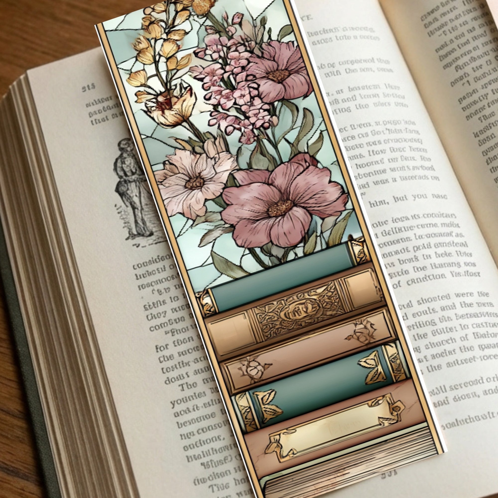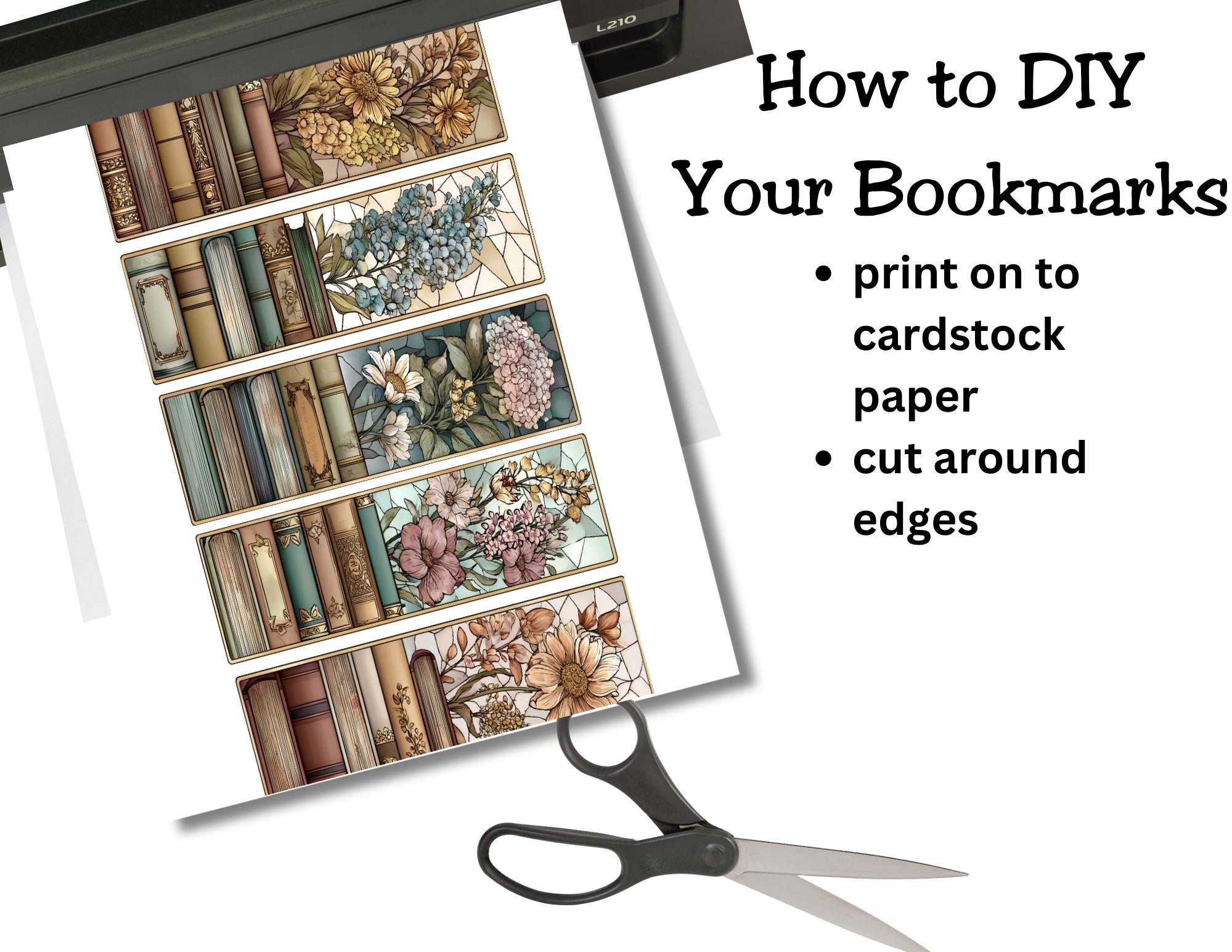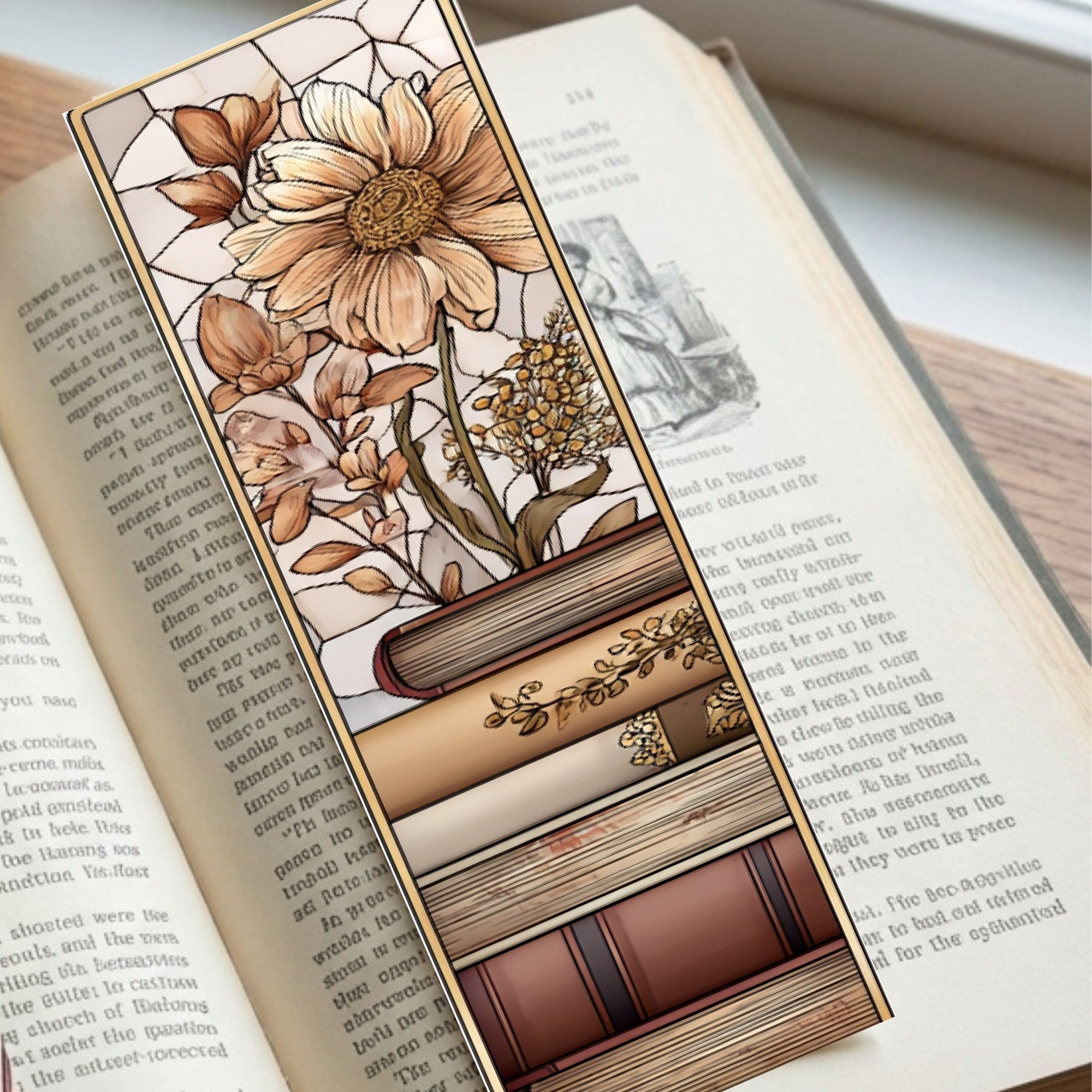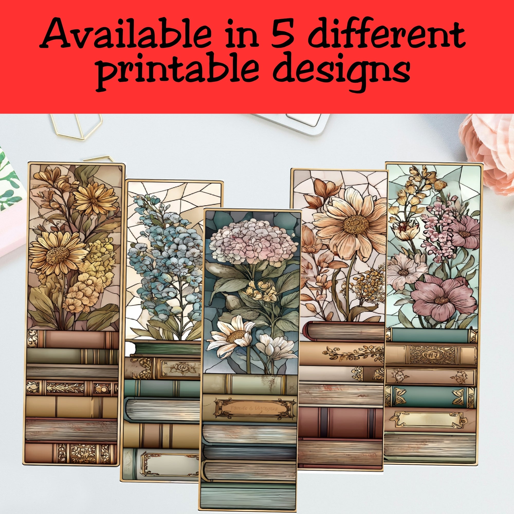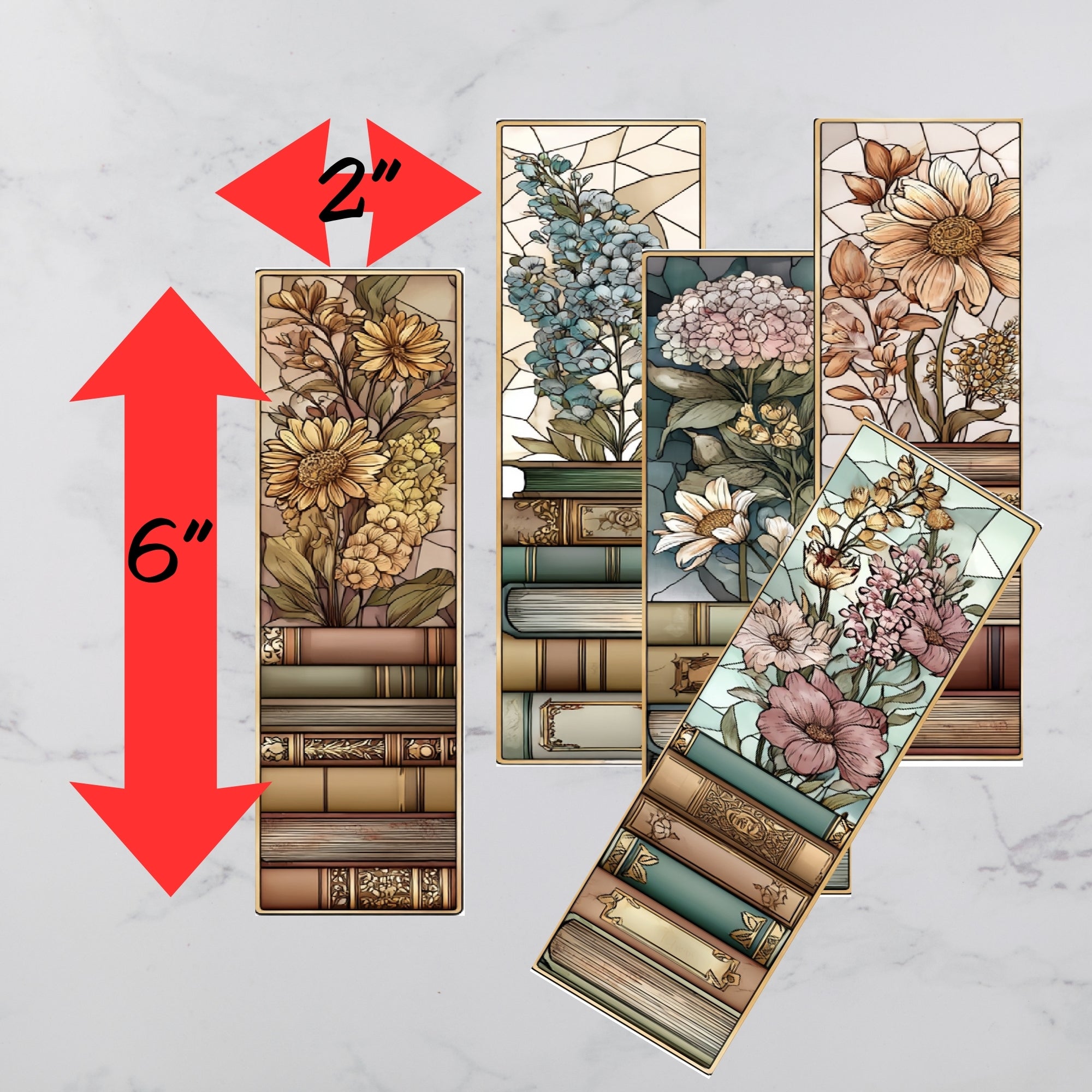 This printable page includes five coordinating 2×6 inch bookmarks, each featuring antique books and soft wildflowers in a stained glass–inspired, light-academia style. They match as a set but each design is unique—so every book gets its own little piece of art.