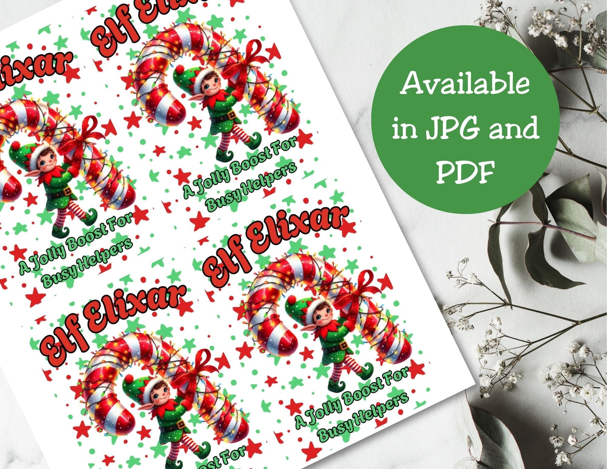 Each label features a white background with red and green stars and a cute elf holding a big candy cane. Above reads “Elf Elixar” and below reads “A jolly boost for busy helpers.” It’s the perfect way to add playful Christmas cheer to your party drink table!