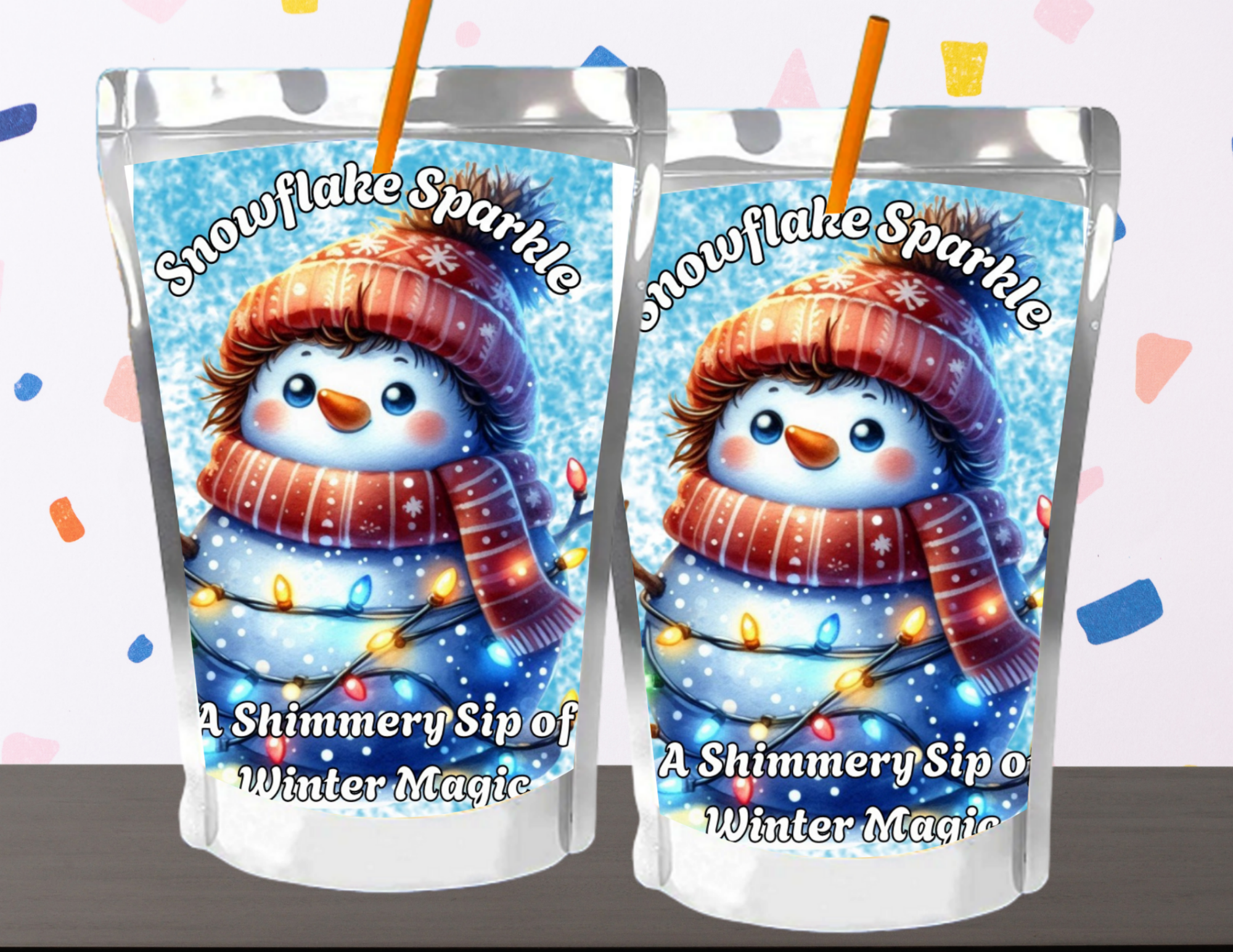Bring a frosty glow to your holiday celebration with these Snowman Sparkle Capri Sun labels! Featuring a happy snowman wrapped in colorful Christmas lights against a snowy blue background, these printable drink pouch stickers add instant festive charm to any party. The top reads “Snowman Sparkle” and the bottom sparkles with “A shimmering sip of winter magic.” ❄️✨