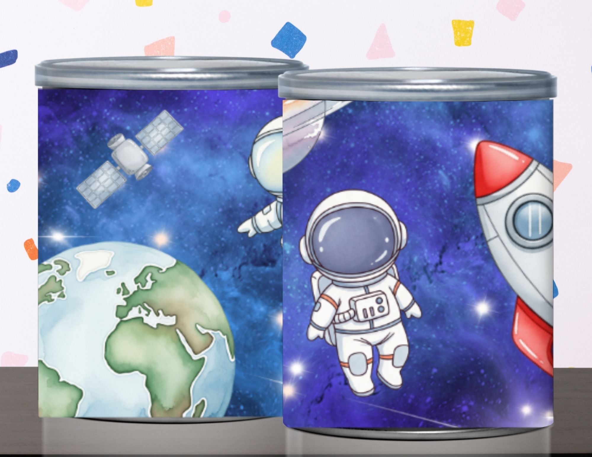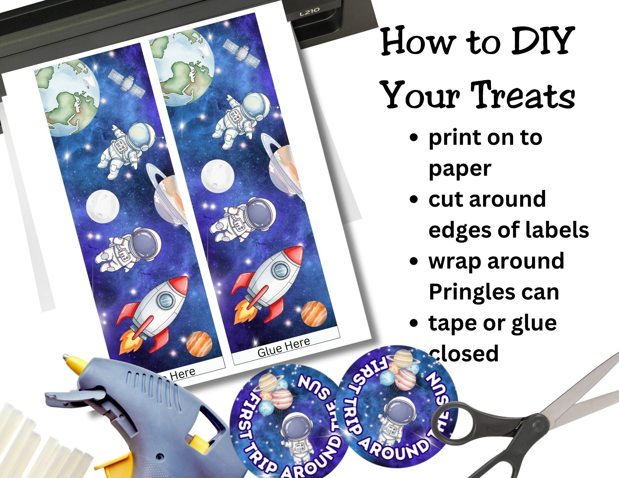 These labels make it easy to turn ordinary snack cans into coordinated first birthday party favors that look adorable on treat tables, favor stations, and in keepsake photos. A favorite for parents planning an astronaut party or outer space birthday theme.