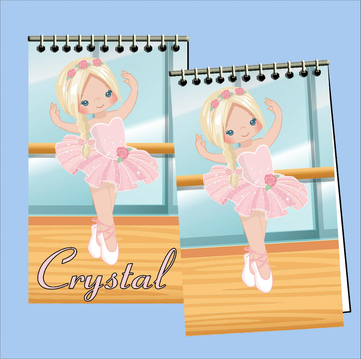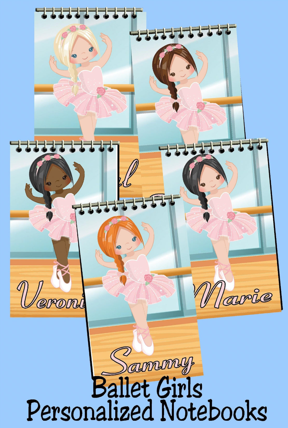 Front of notebook has been replaced with one of 5 custom ballerinas standing in front of mirrors and a ballet bar. Below each girl is her name or your custom saying in a soft pink color with black outlined script font.