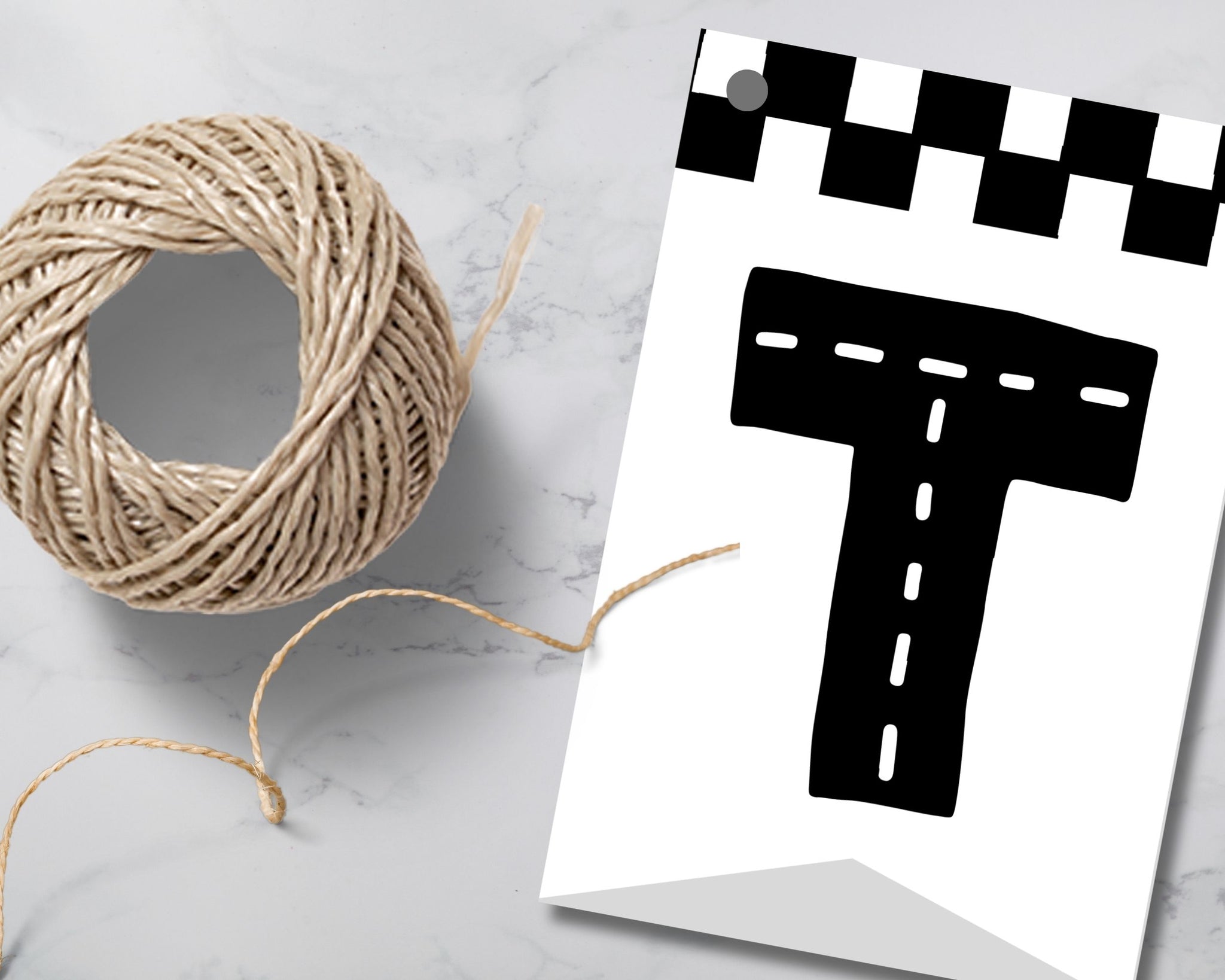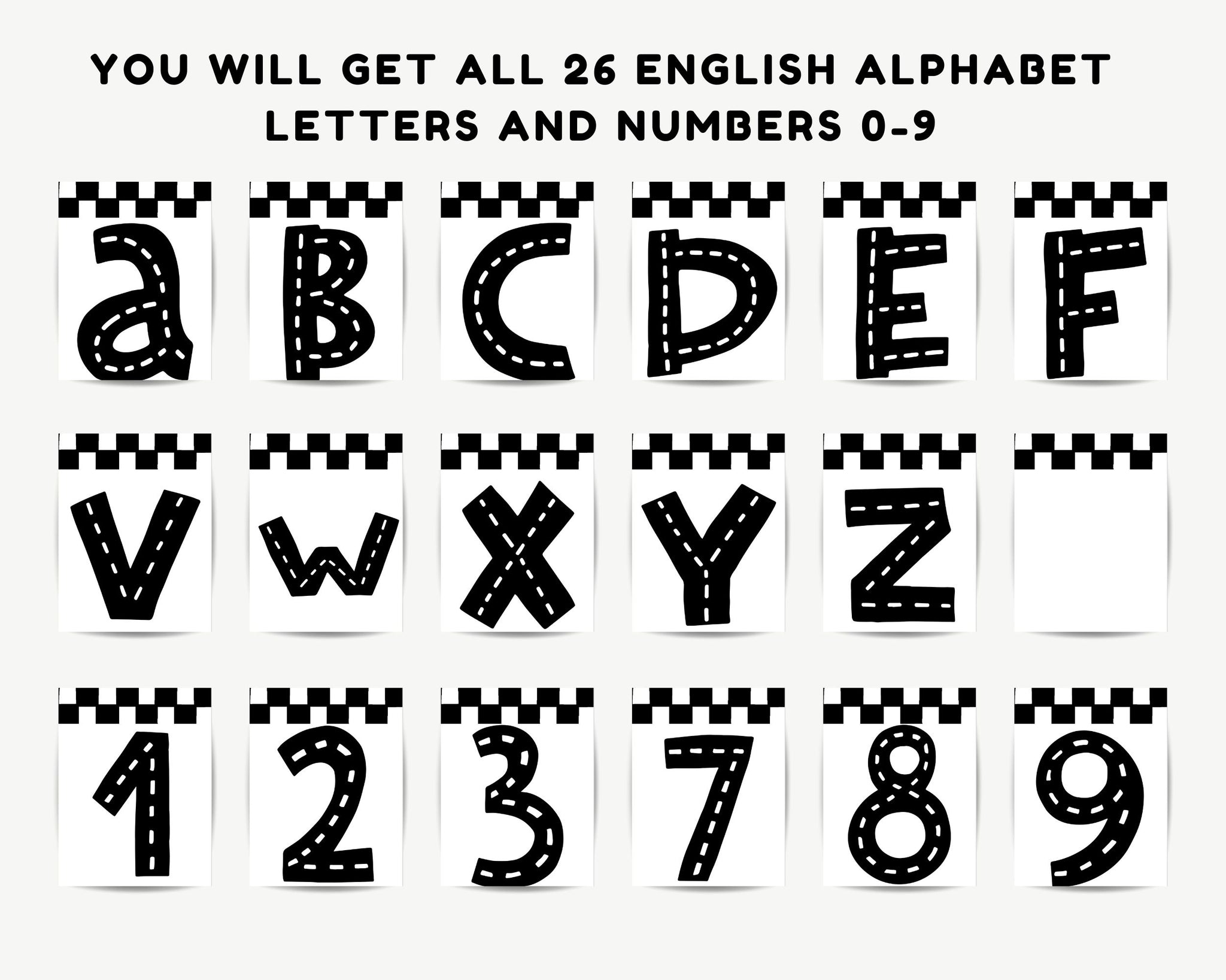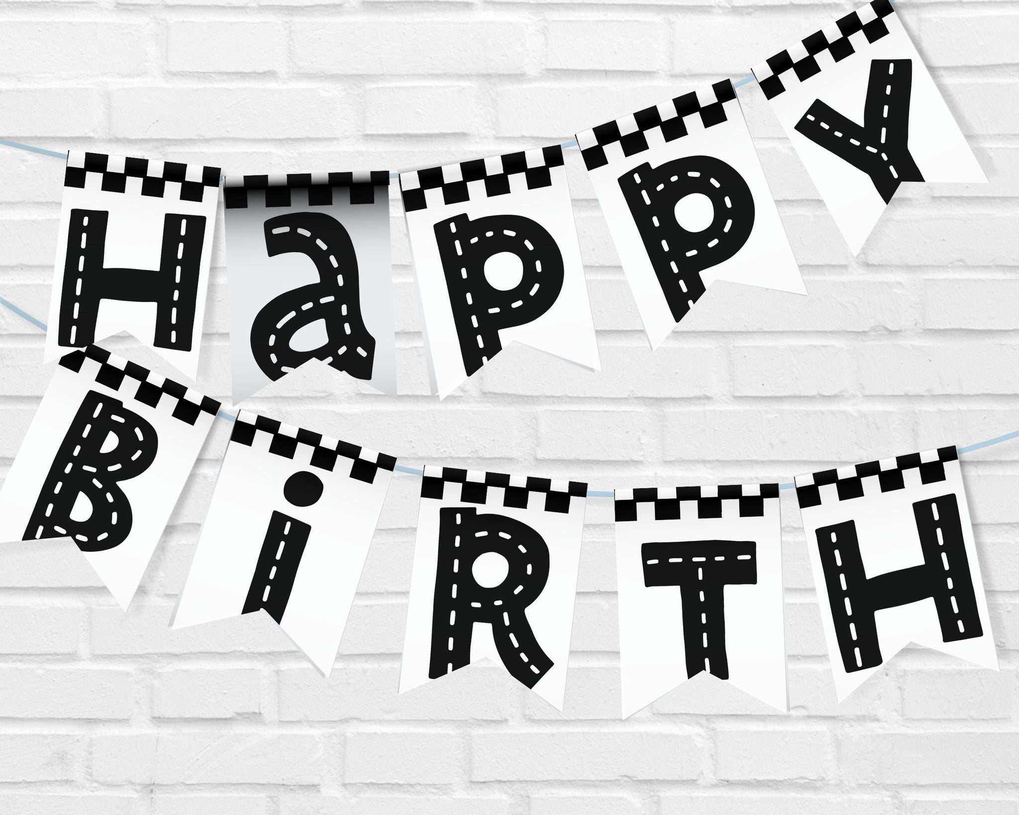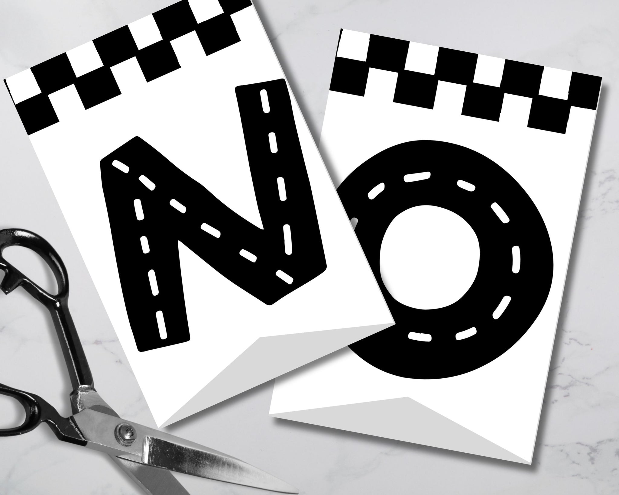 Each pennant features a white background with bold flag black and white checkered stripes along the top and bottom, while the letters and numbers look like roads complete with white dotted lines.