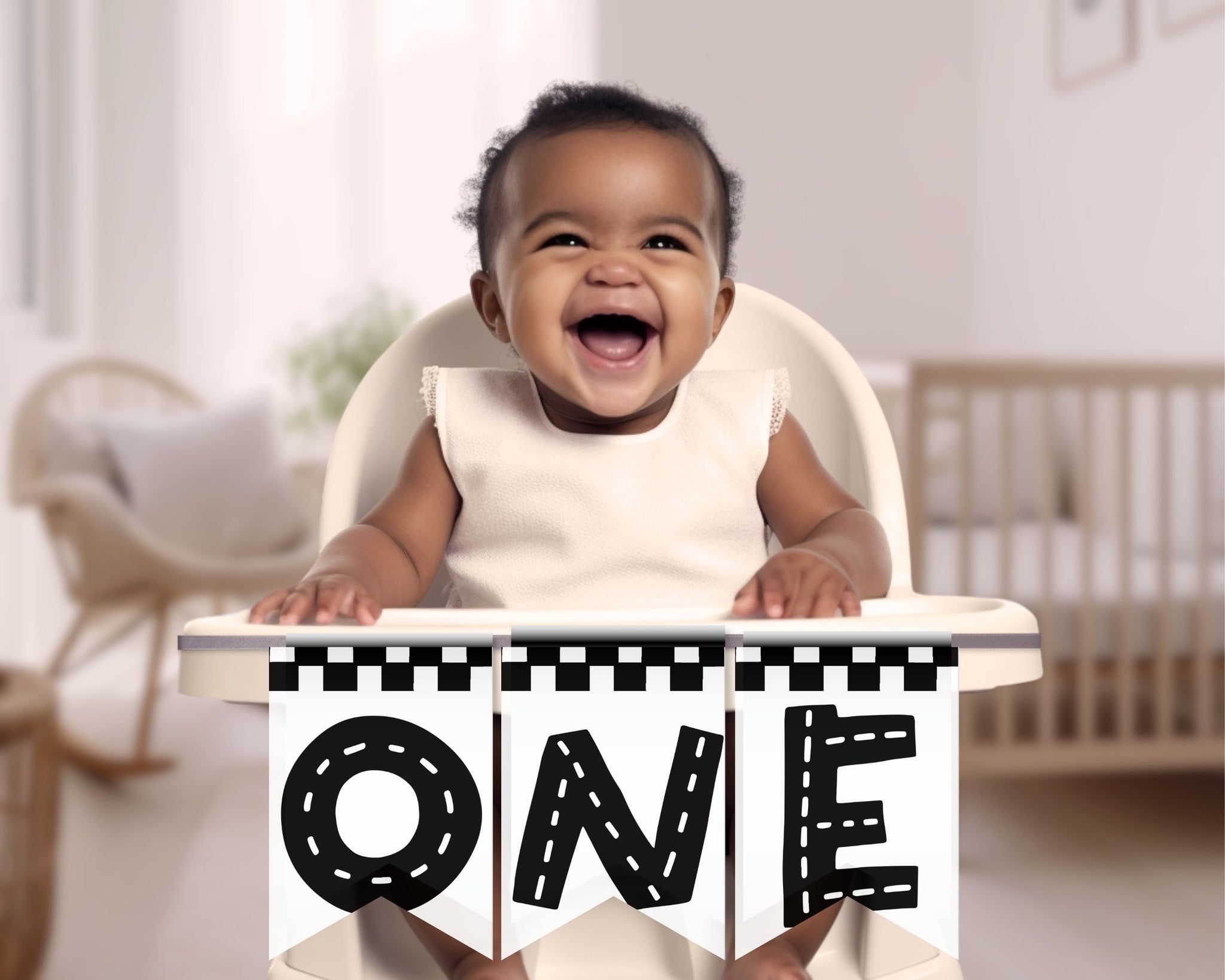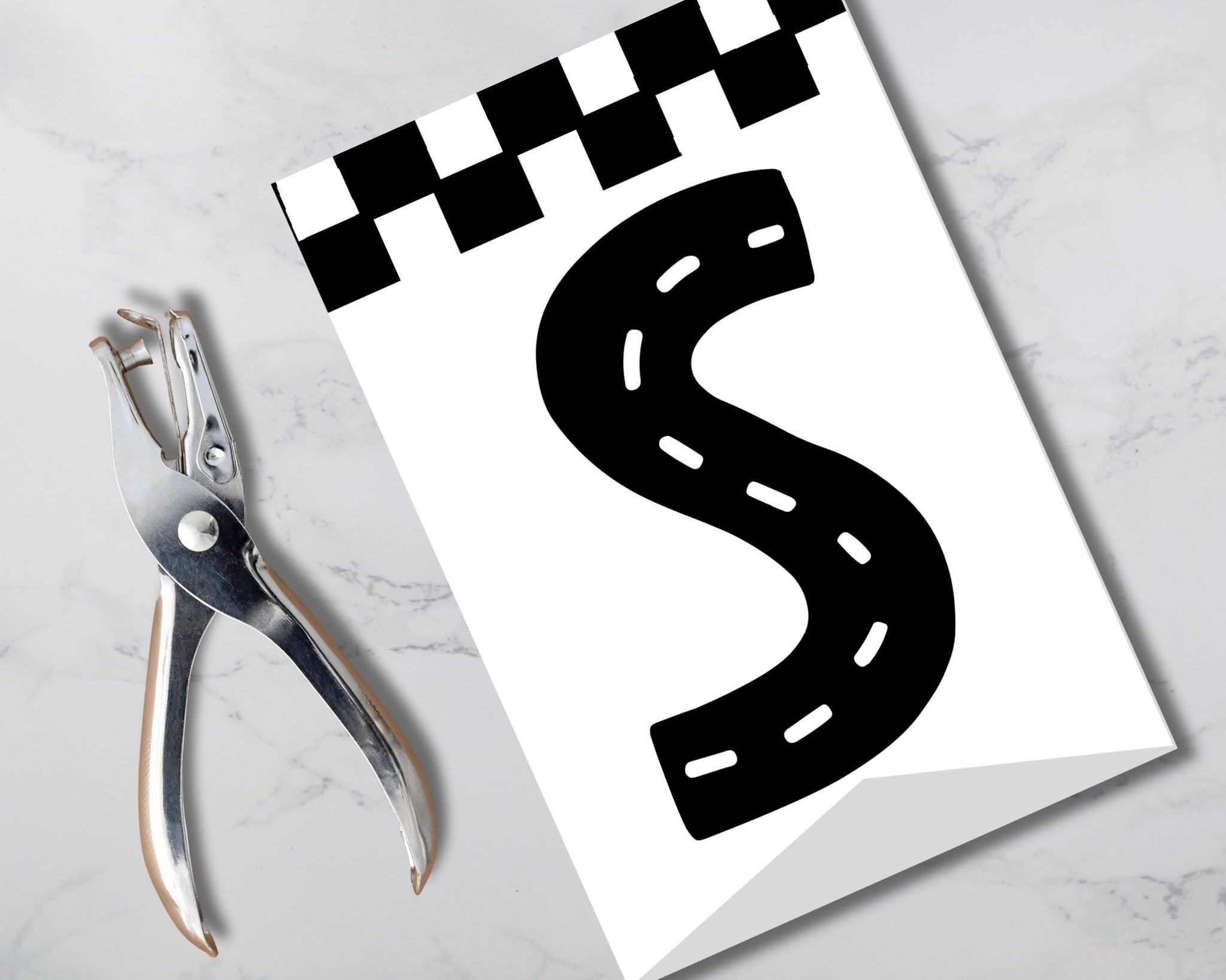 Fun racing theme with bold black and white checkered flag race lines & road-style letters