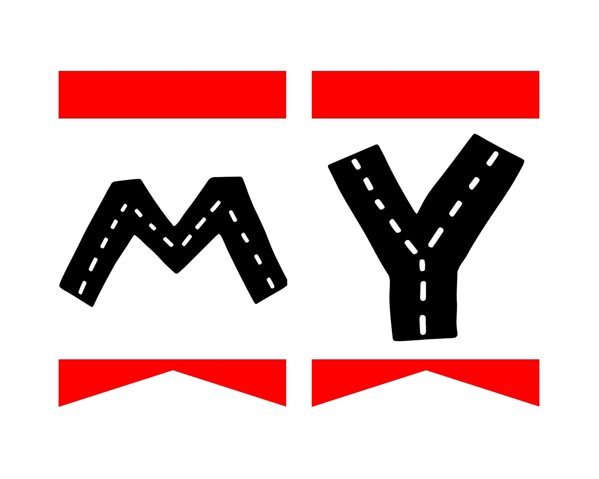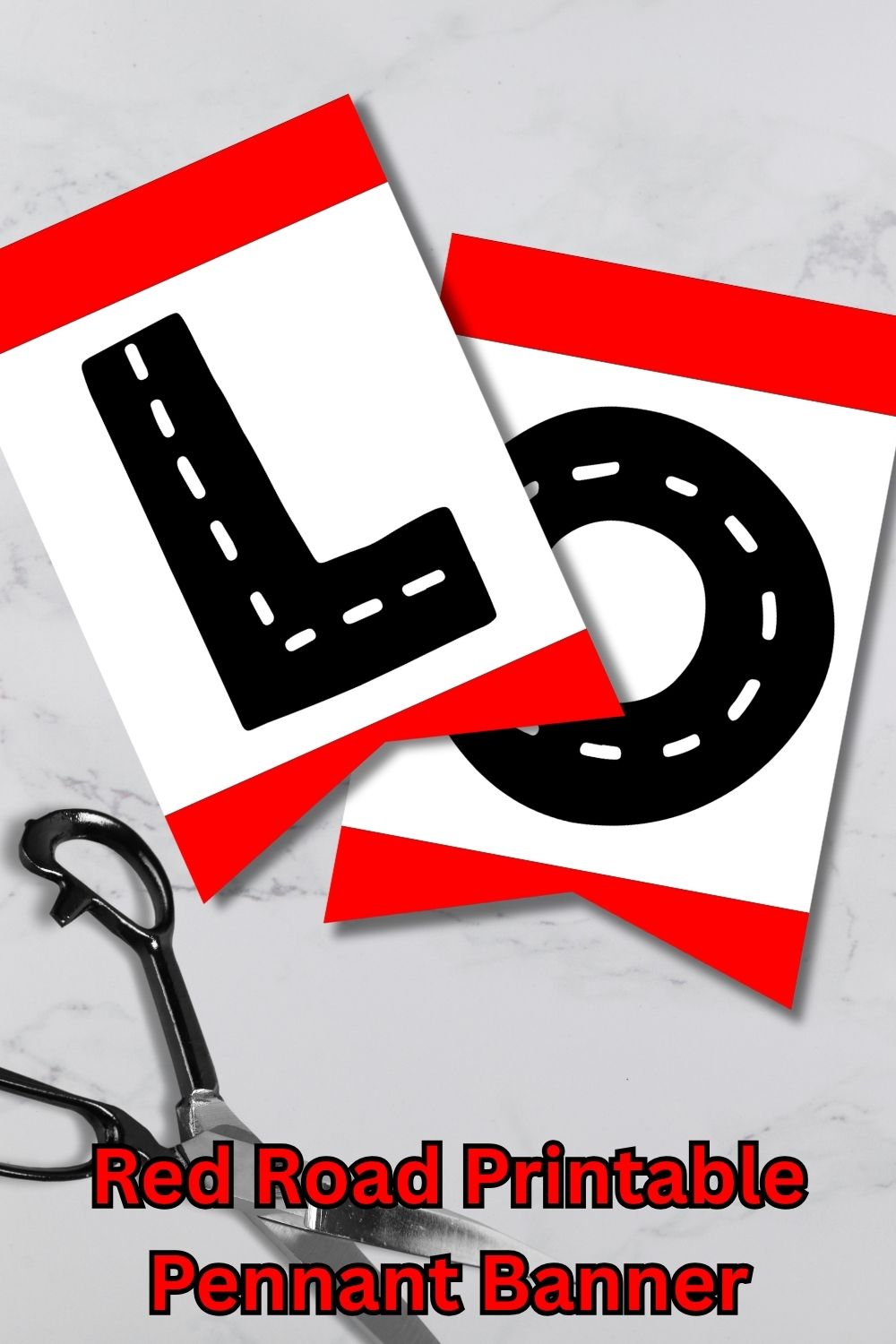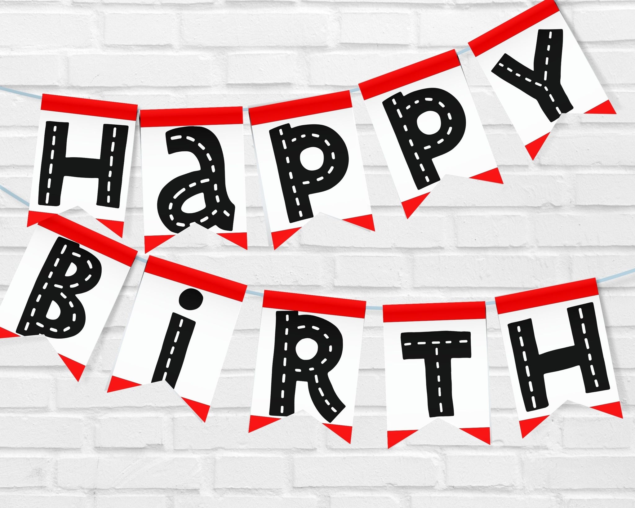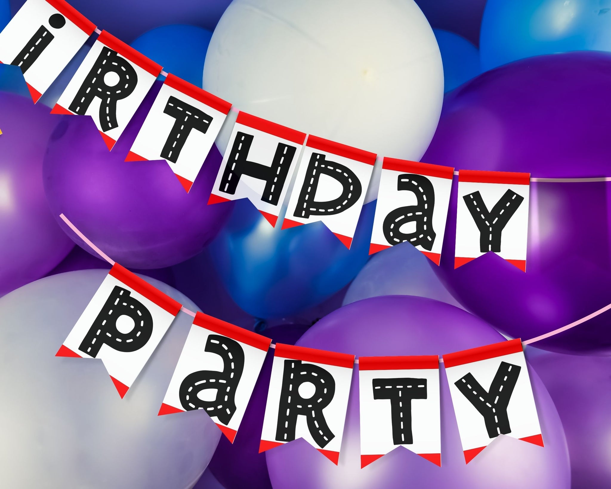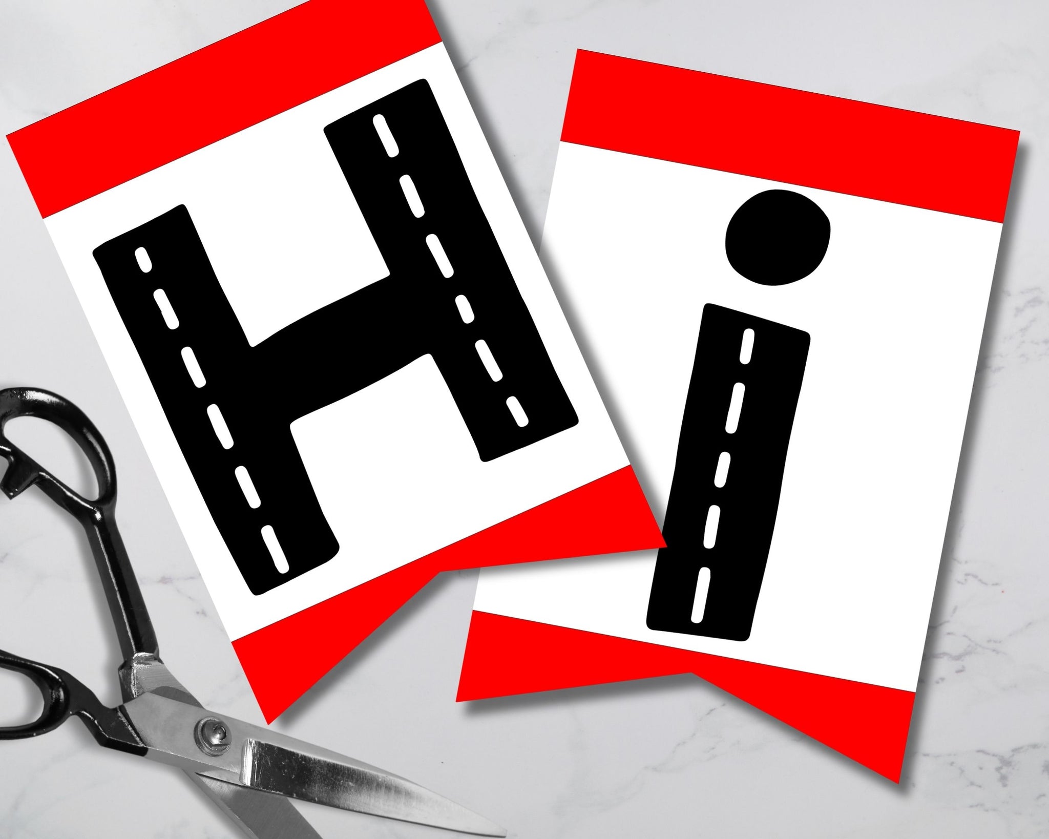Rev up the fun with this race car party pennant banner! Designed with a crisp white background, bold red racing stripes, and letters that look like roads with white dotted lines, this printable banner is the perfect decoration for truck birthdays, race car parties, Hot Wheels themes, classrooms, and bulletin boards.