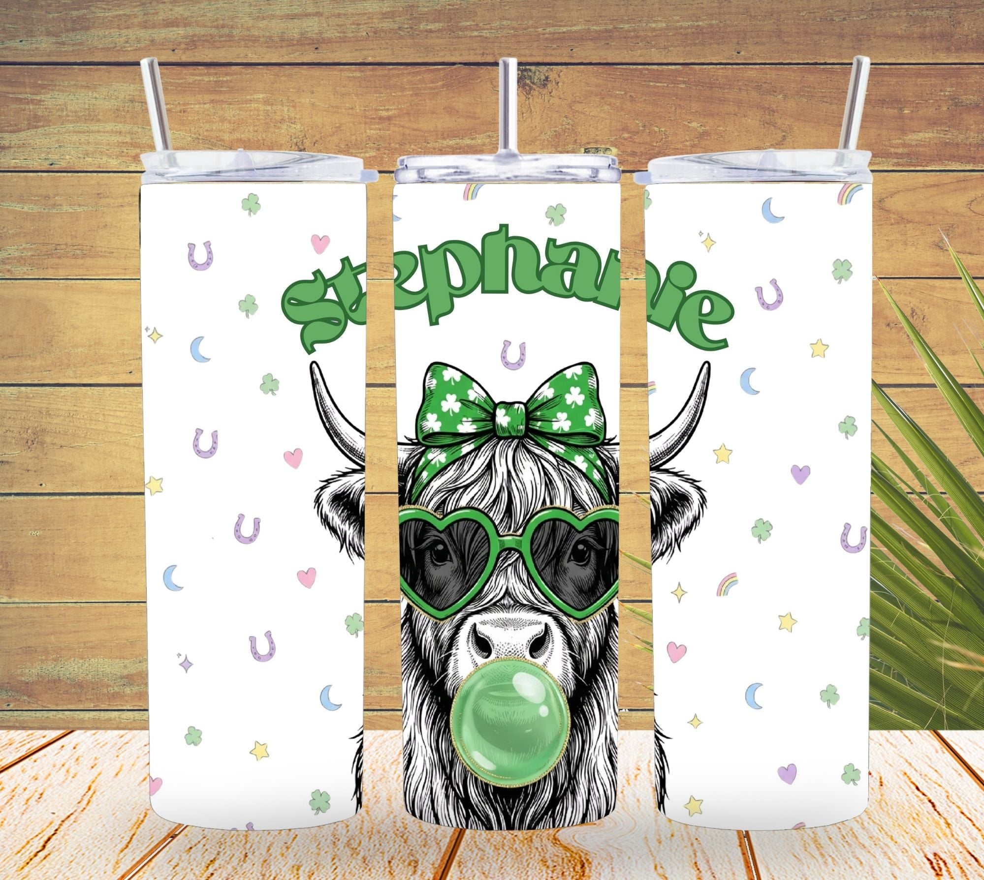 Bring the luck (and the vibes) to your St. Patrick’s Day lineup with this Lucky Highland Cow tumbler design, featuring a vintage black-and-white cow illustration paired with green heart sunglasses, a shamrock bow, and a playful bubblegum pop. This trendy coquette-inspired design blends retro charm with festive Irish flair—perfect for March gifts, seasonal drops, and personalized drinkware.