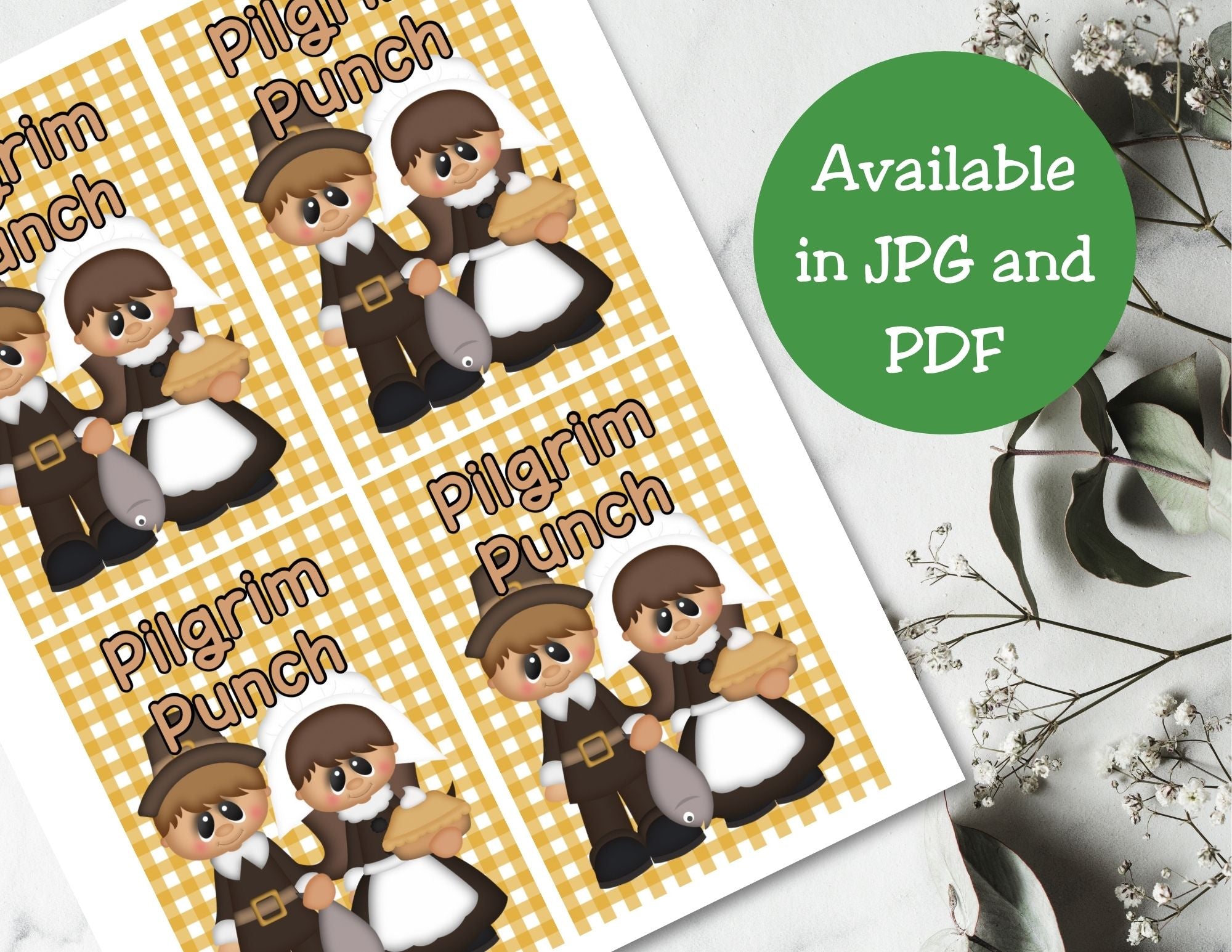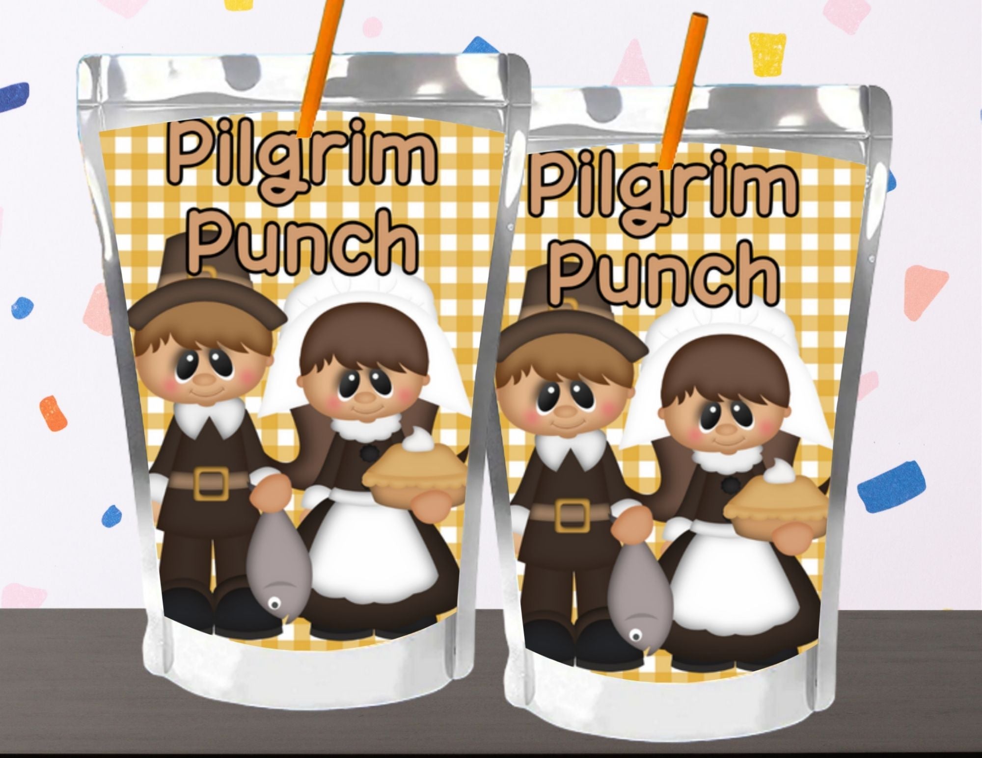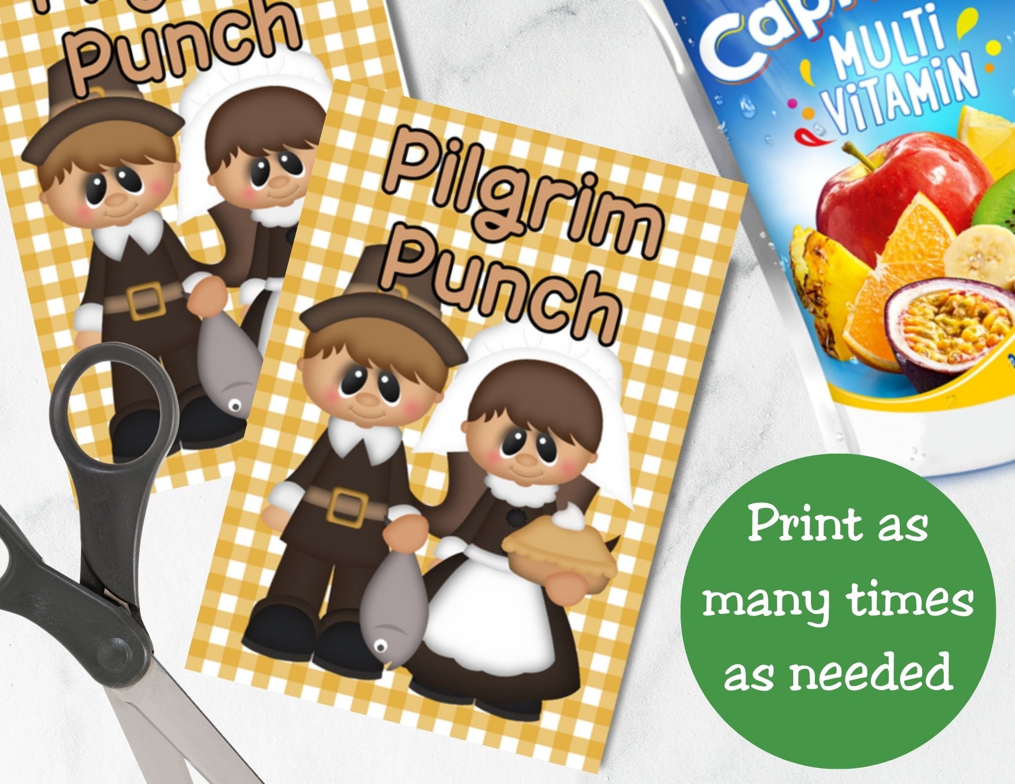 Add a touch of Thanksgiving charm to your drinks with this adorable Pilgrim Punch Capri Sun label printable! Perfect for Thanksgiving dinner, Friendsgiving gatherings, or a classroom party, this cute printable features a Pilgrim boy and girl dressed for the feast — holding a pie and fish against a warm gingham background. A sweet and classic way to make your holiday drinks stand out! 🎉