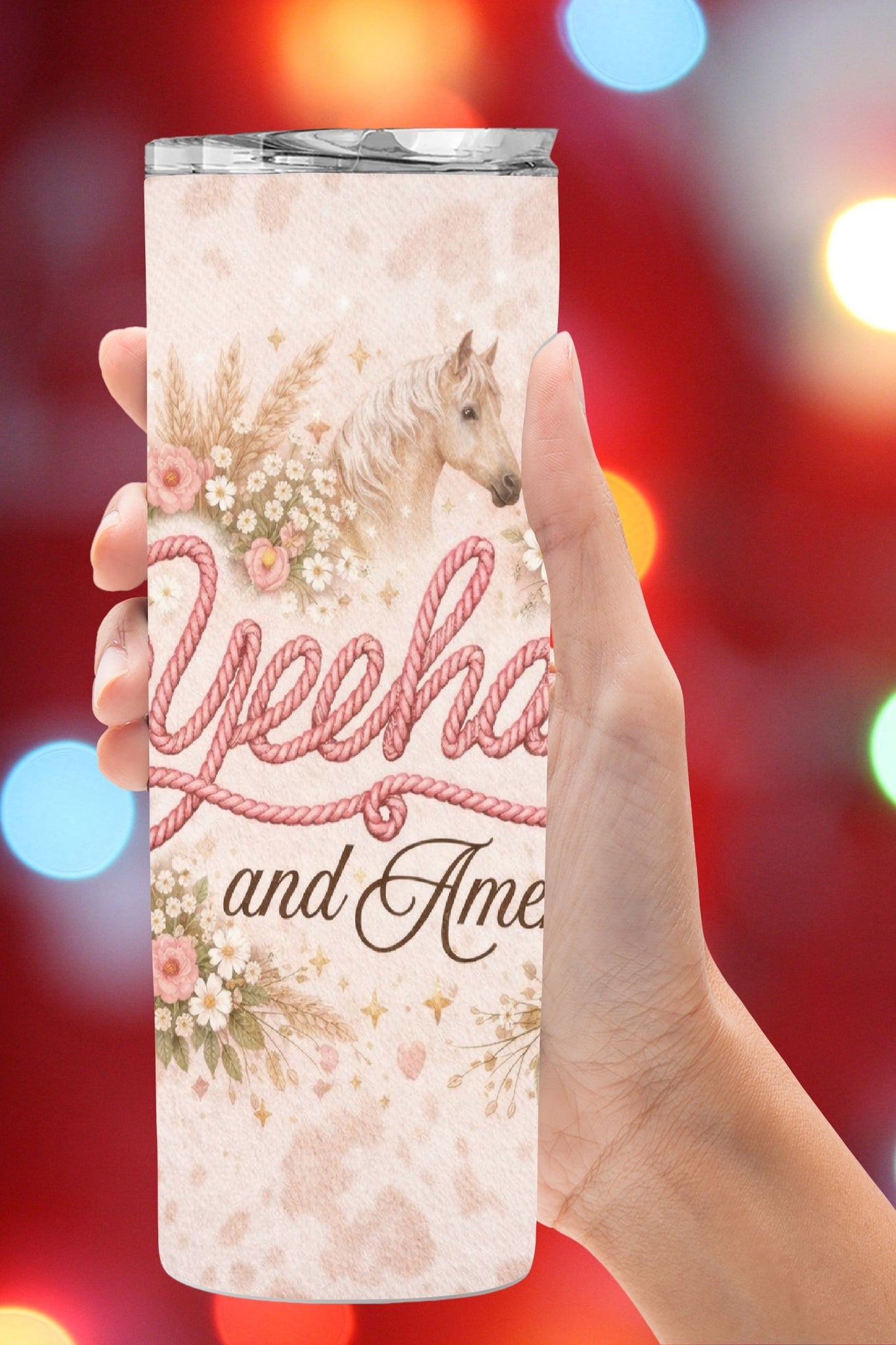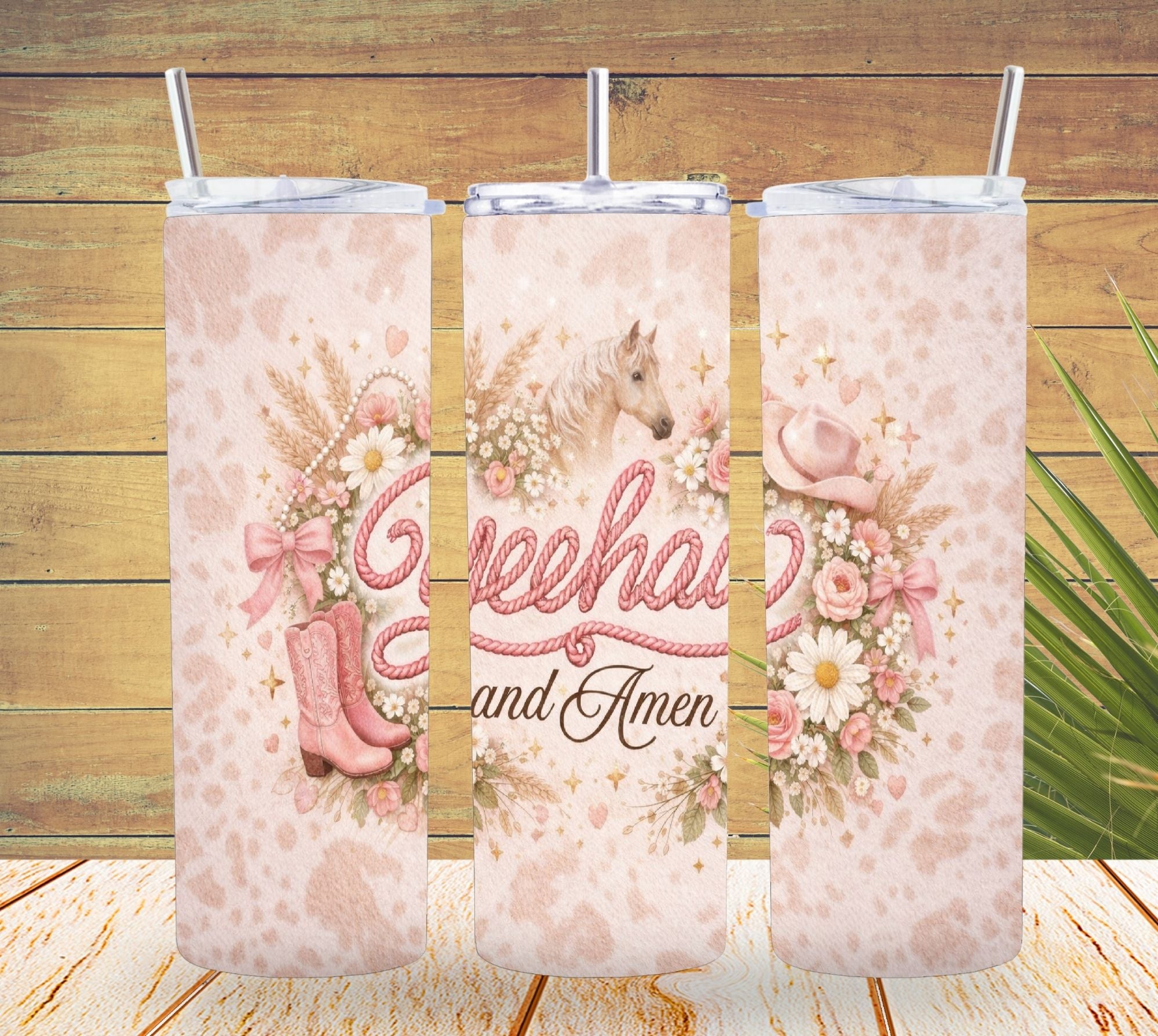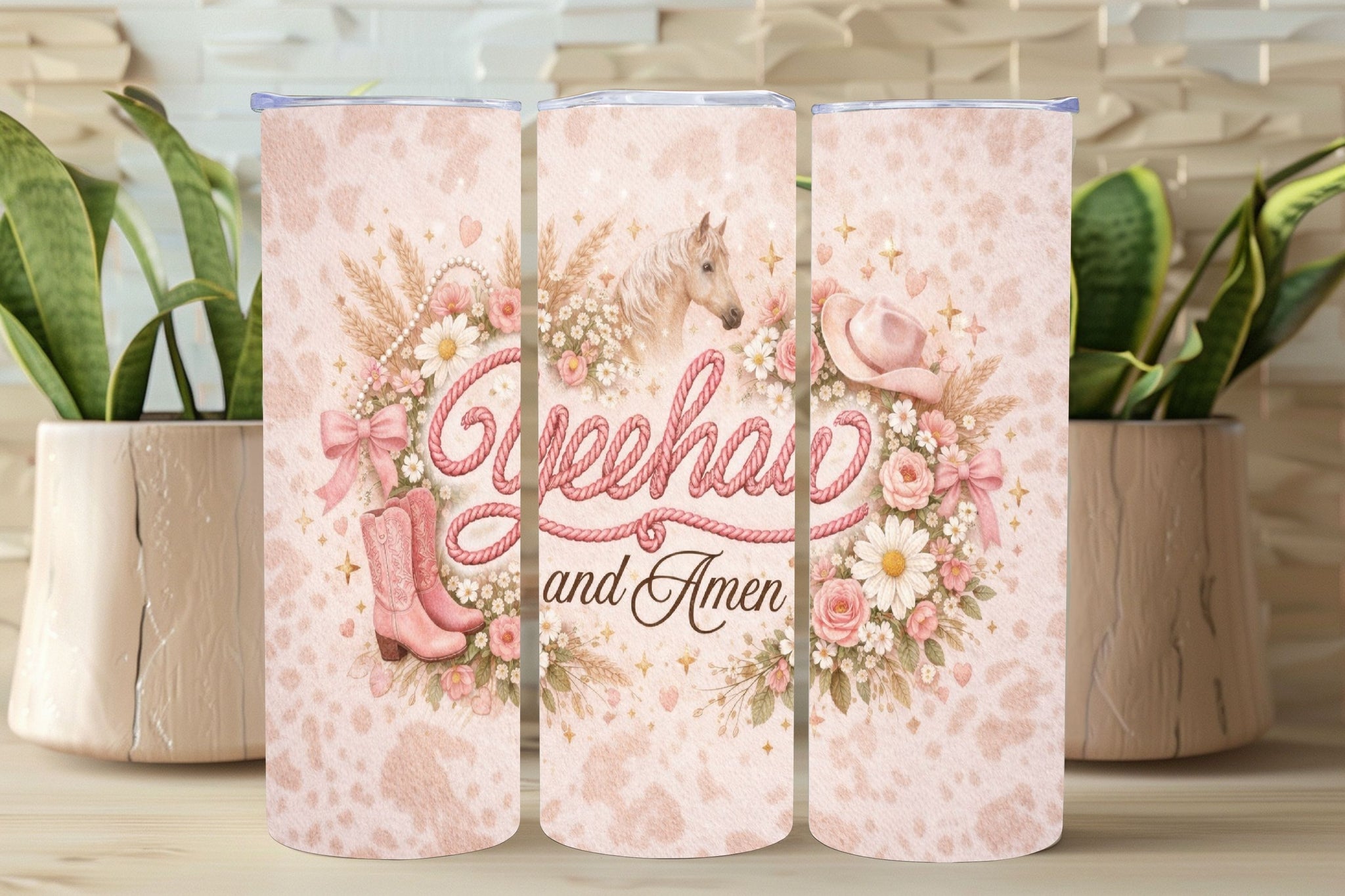 Celebrate western faith with a soft, feminine twist. This Coquette Yeehaw and Amen tumbler design features pink rope lettering, romantic florals, bows, pearls, cowgirl boots, and delicate western accents. Blending coquette charm with Christian inspiration, this design is perfect for cowgirls who love faith, florals, and a little western flair.