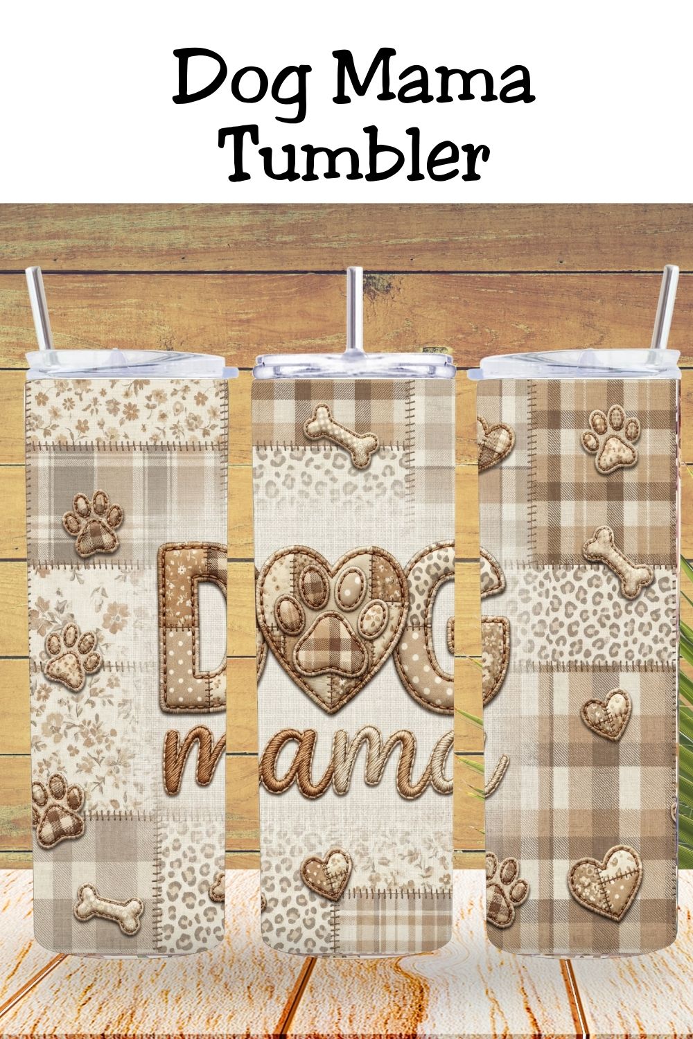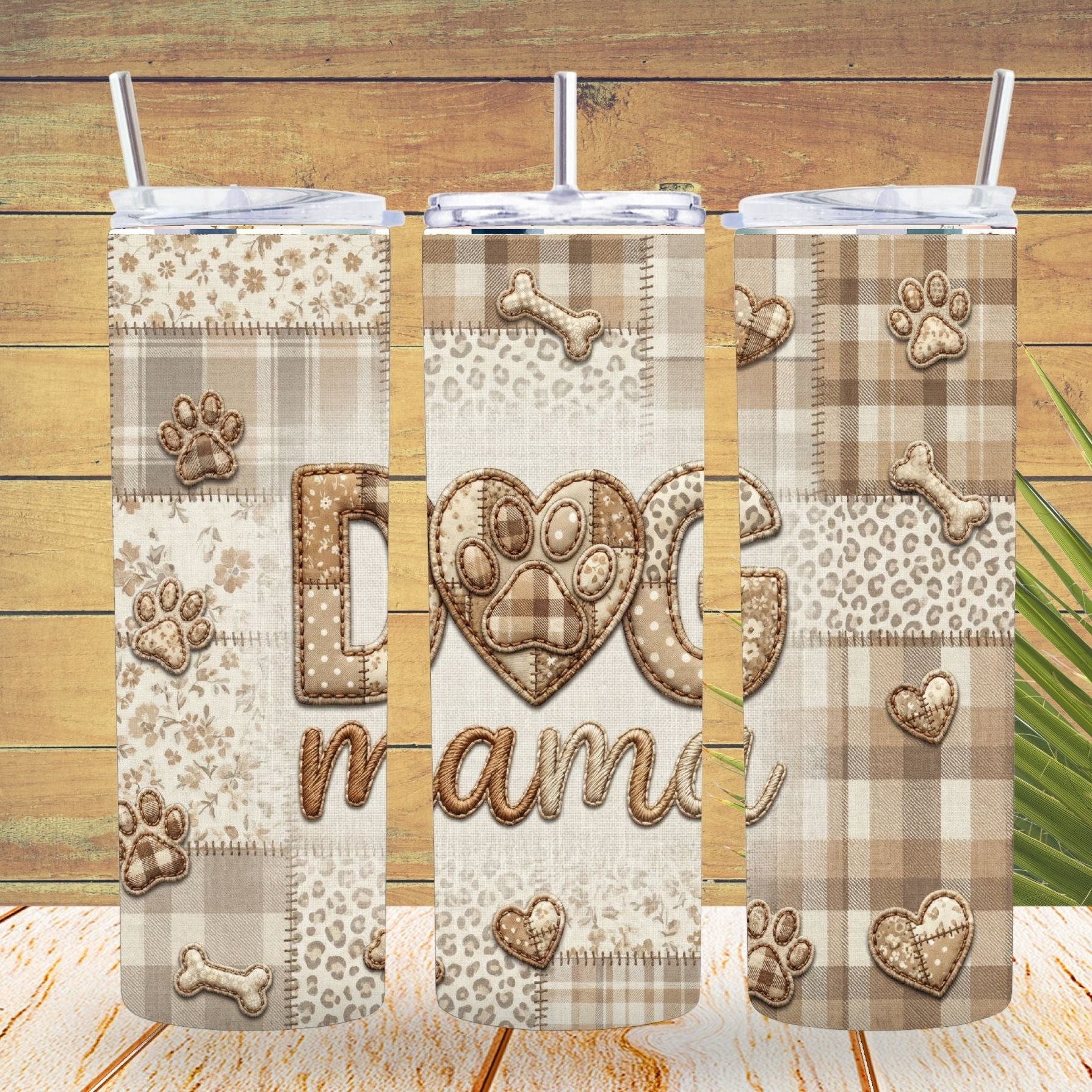 This design features patchwork applique typography reading “DOG mama,” with a stitched paw print heart replacing the “O.” Mixed plaid, floral, polka dot, and subtle leopard textures in warm browns and creams give it that boutique, handmade aesthetic dog mom vibe that’s trending right now.