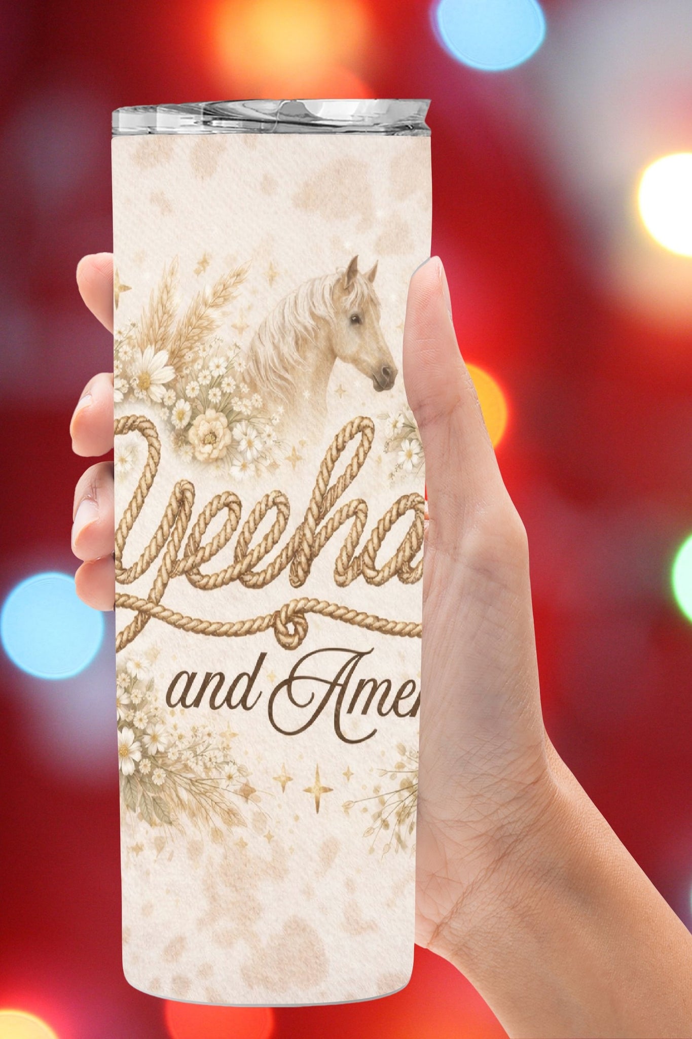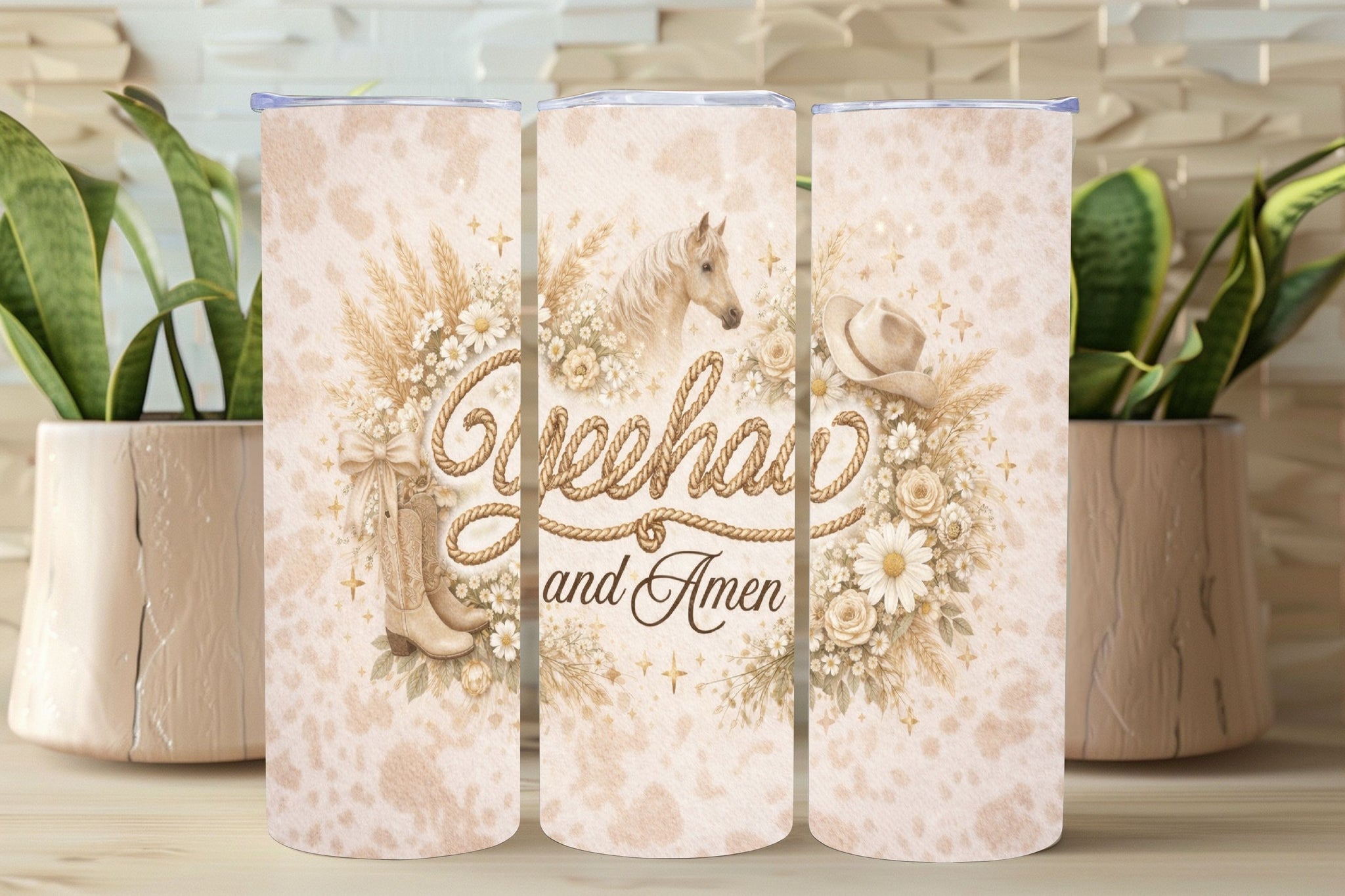 Bring calm western charm and faith-filled style to your drinkware with this Neutral Boho Yeehaw and Amen tumbler design. Featuring rope lettering, soft dried florals, wheat accents, and classic western elements in warm neutral tones, this design blends boho simplicity with meaningful Christian inspiration.