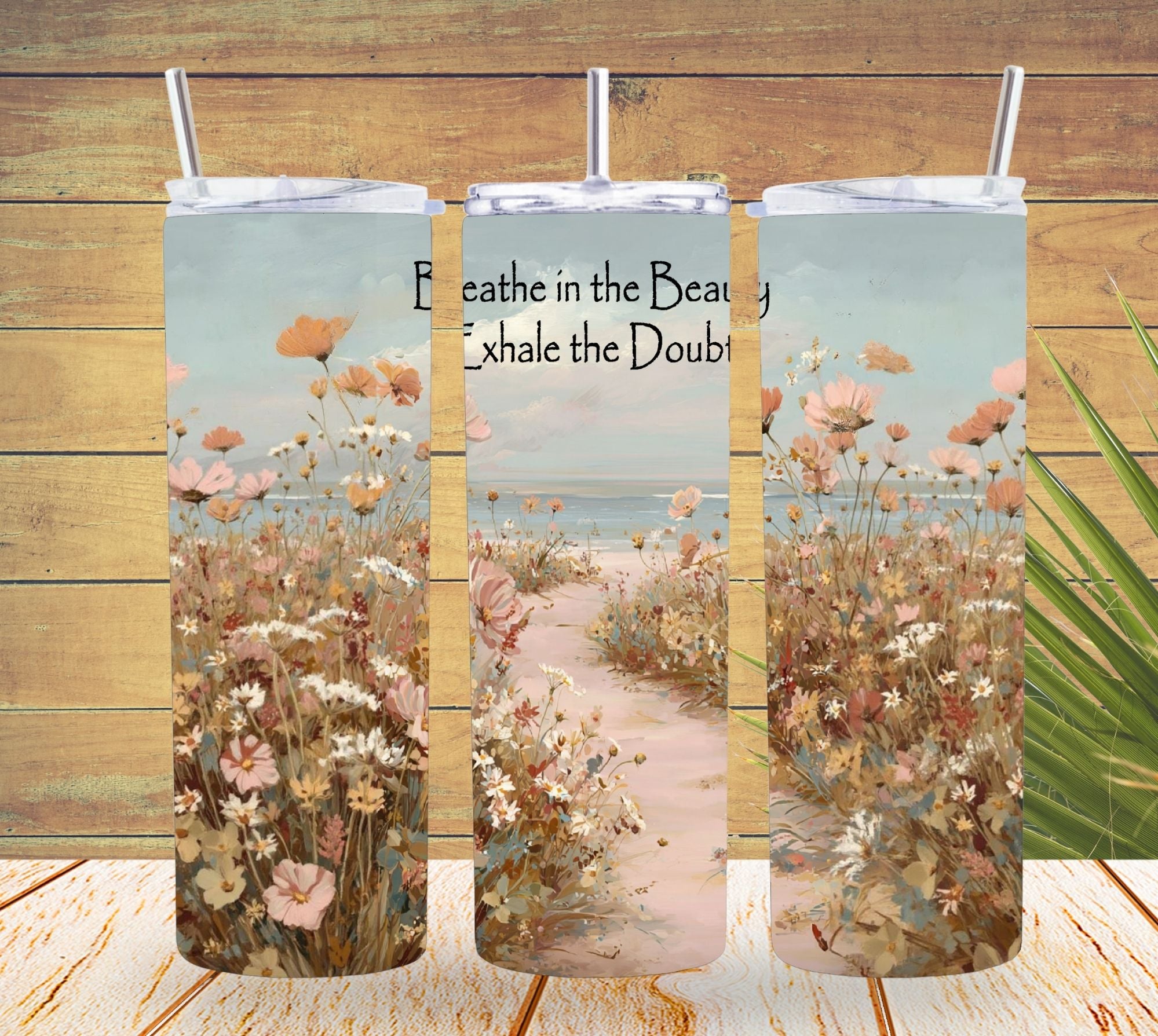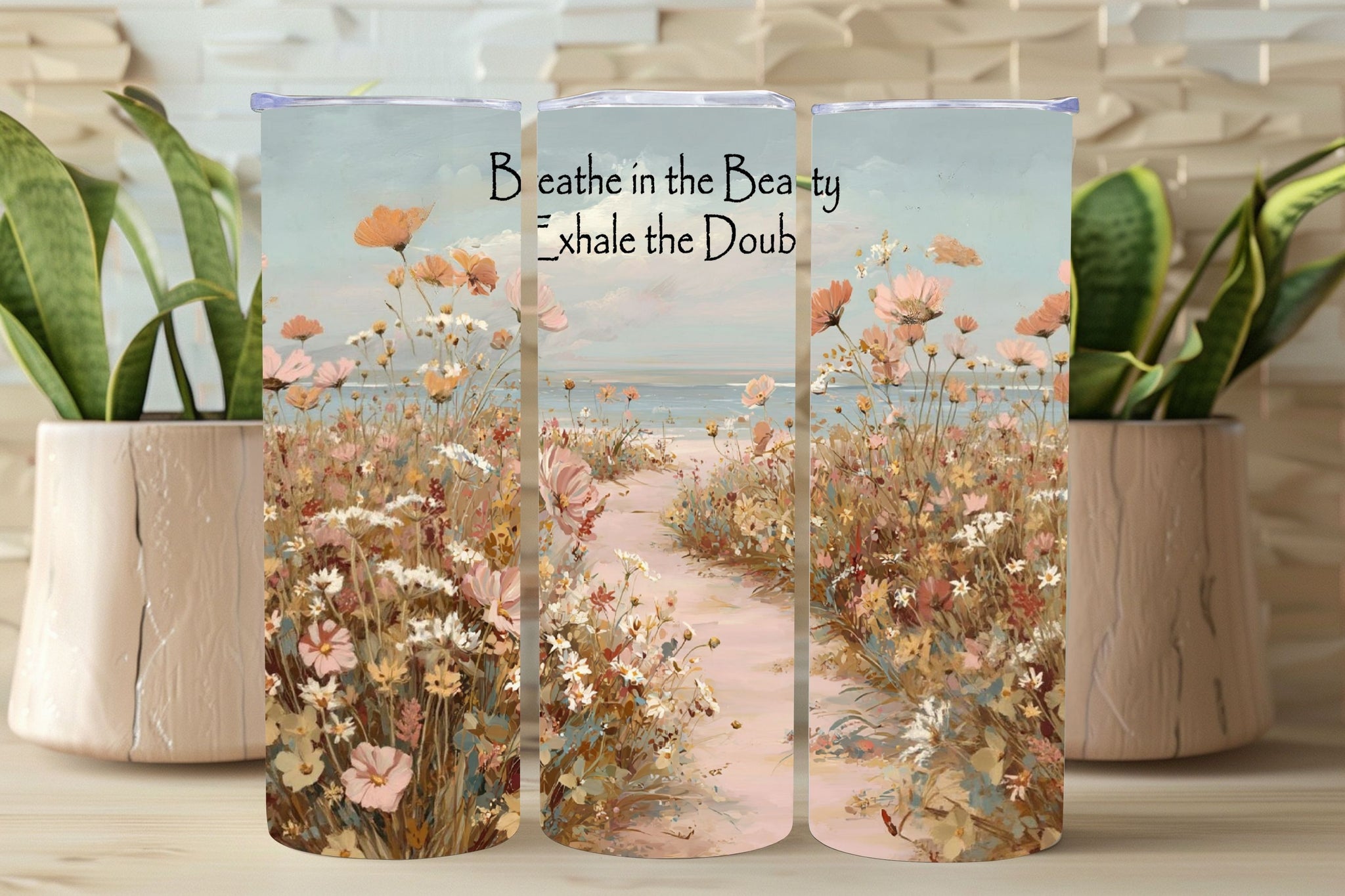 Bring calm coastal charm to your daily routine with this pink coastal floral tumbler design, inspired by soft spring wildflowers, a winding beach path, and a peaceful ocean horizon under a pastel sky. This design blends blush pinks, warm neutrals, and airy seaside tones for a soothing, feminine look that feels both elegant and timeless.