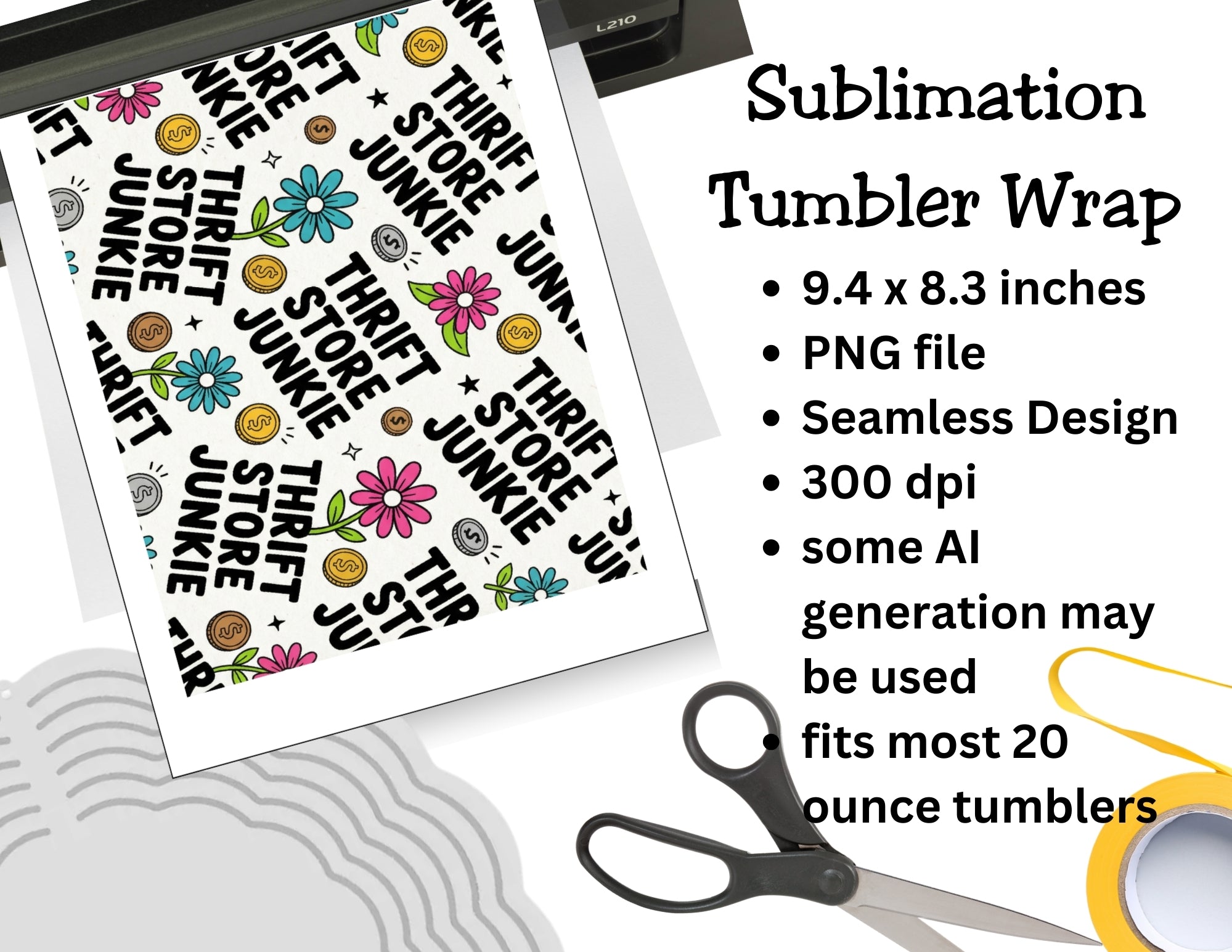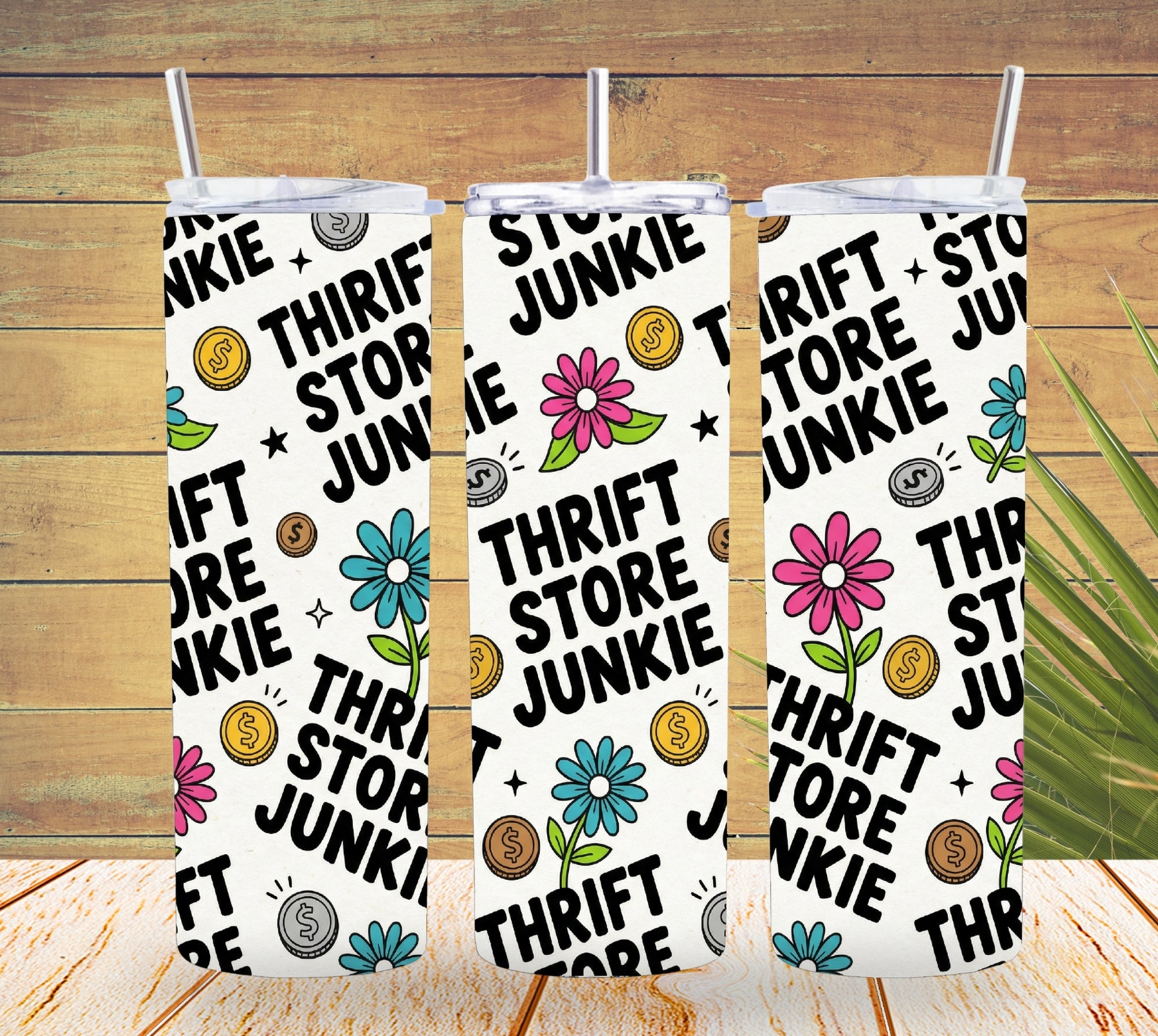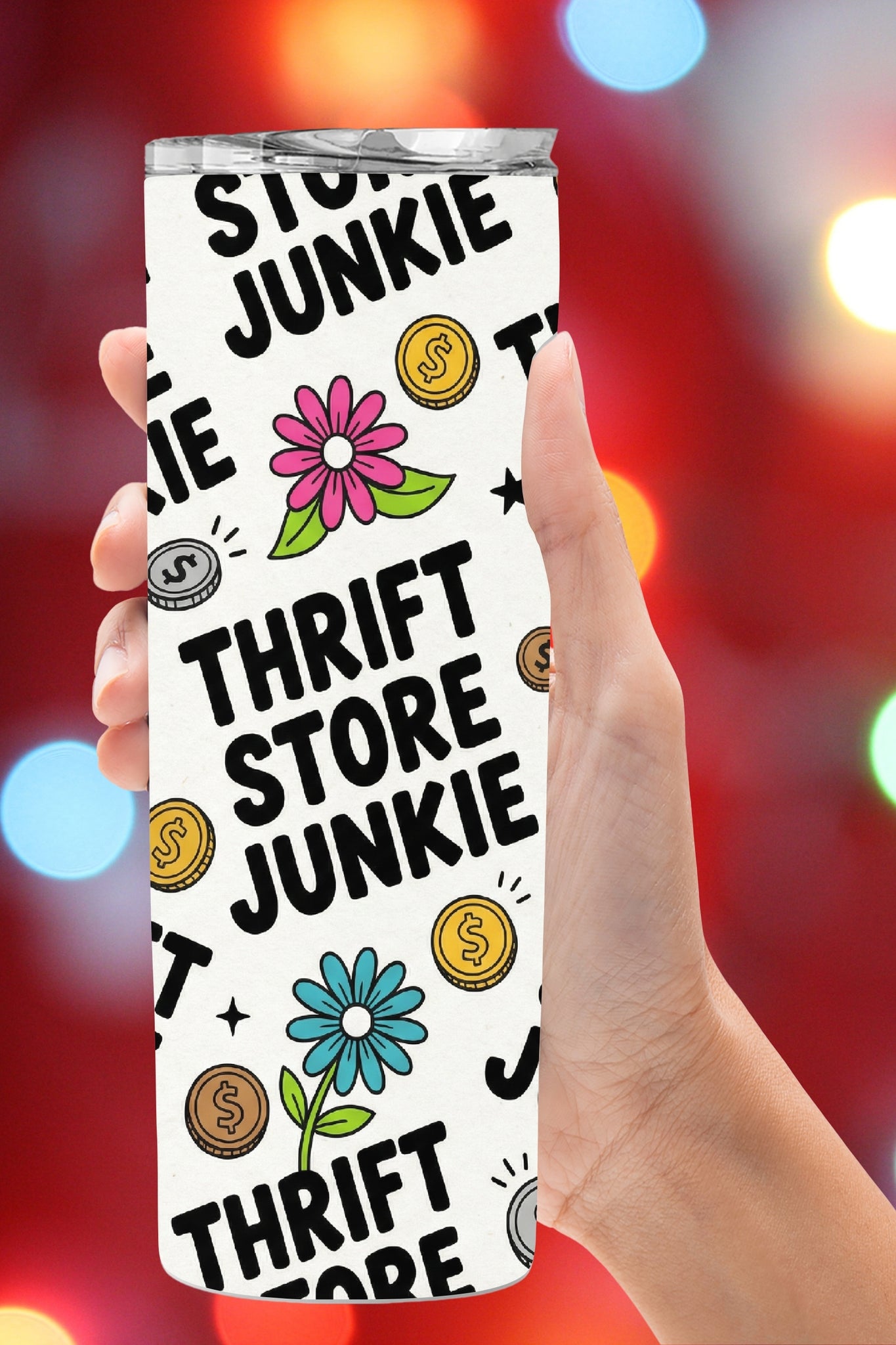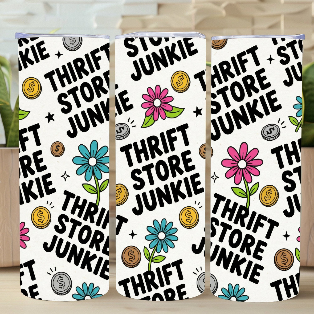 This design features bold “Thrift Store Junkie” lettering repeated across the wrap, paired with playful retro florals, dollar-sign coins, and fun doodle accents. Bright pink and teal flowers pop against a neutral background, giving this tumbler a cheerful, eye-catching look from every angle.