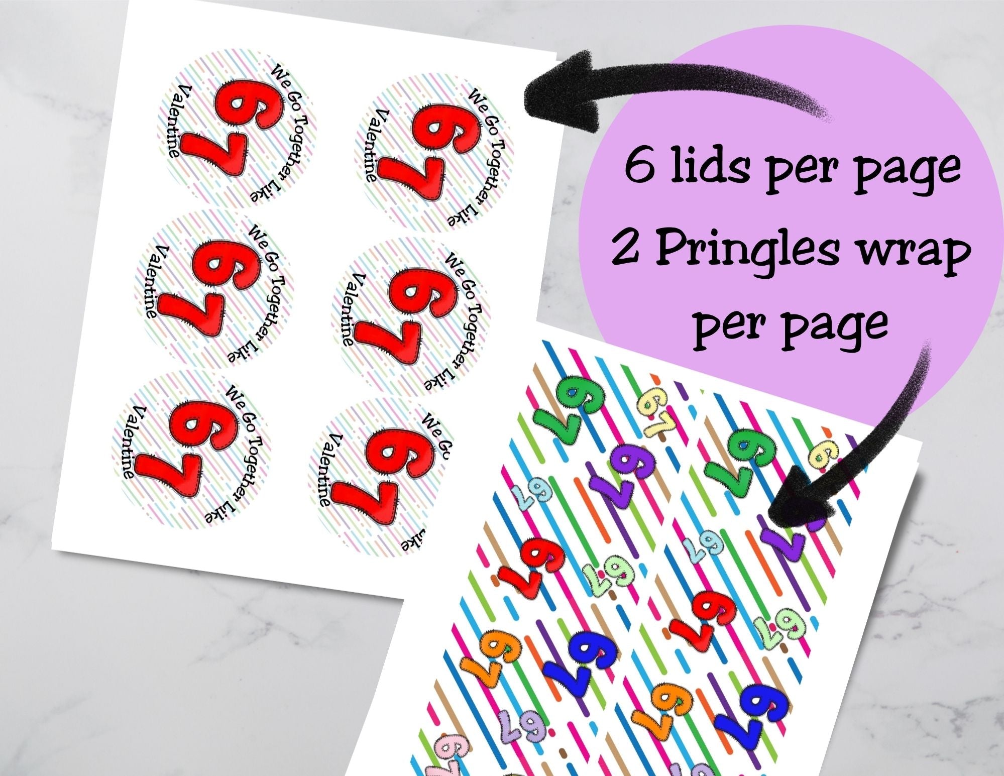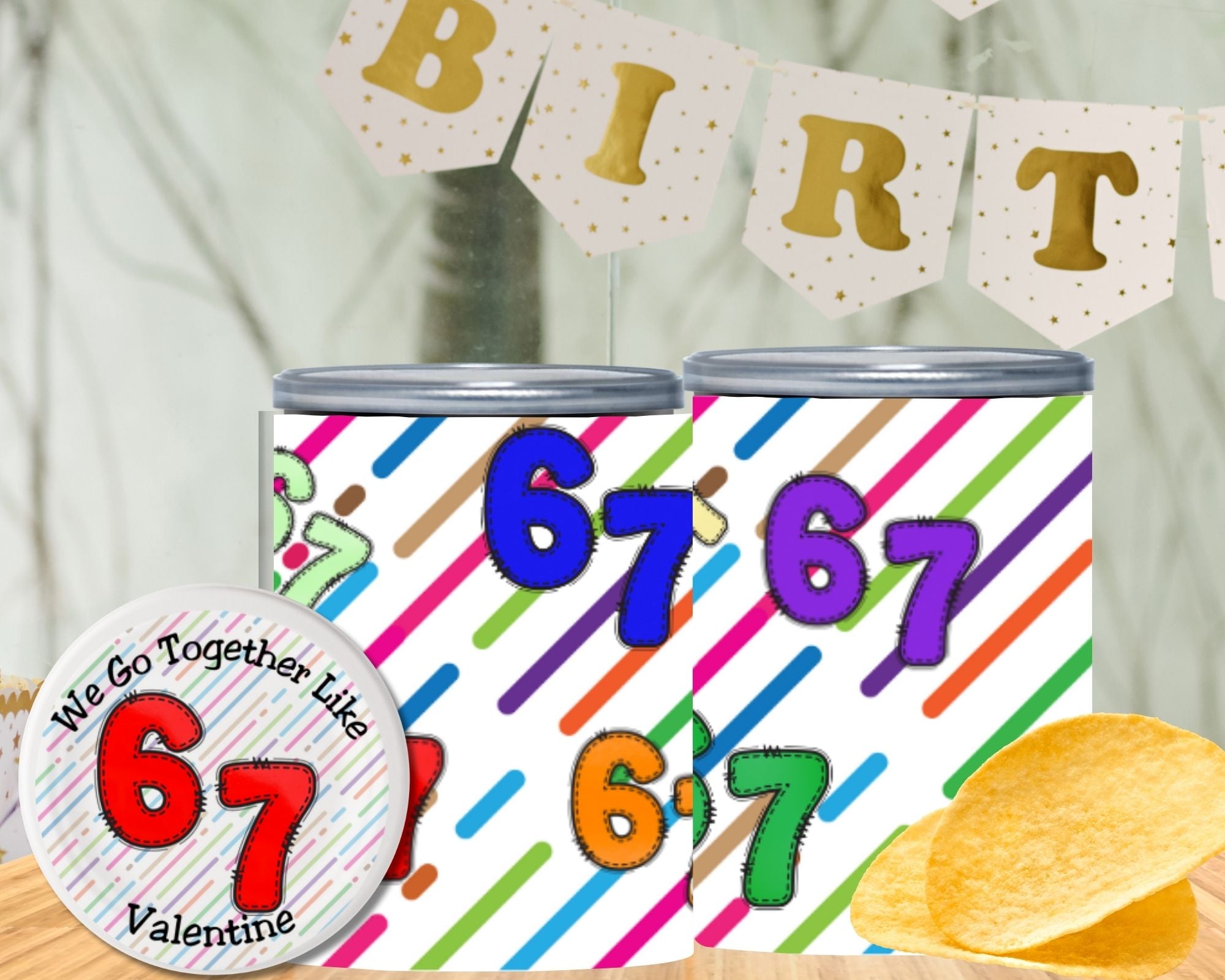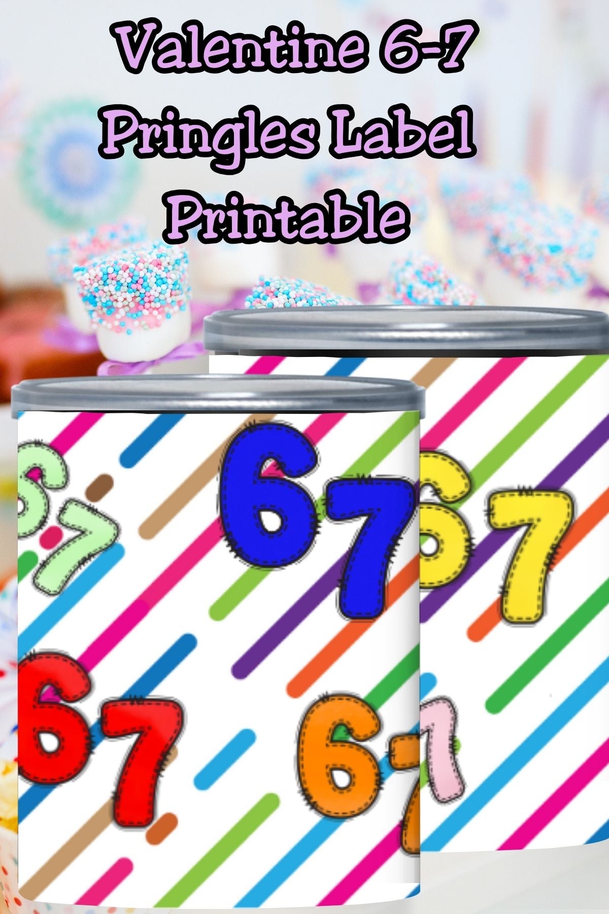 Make classroom Valentines easy and on-trend with these 6 & 7 Valentine Pringles can labels and lids, inspired by the viral “We Go Together Like 6 and 7” trend kids love right now.