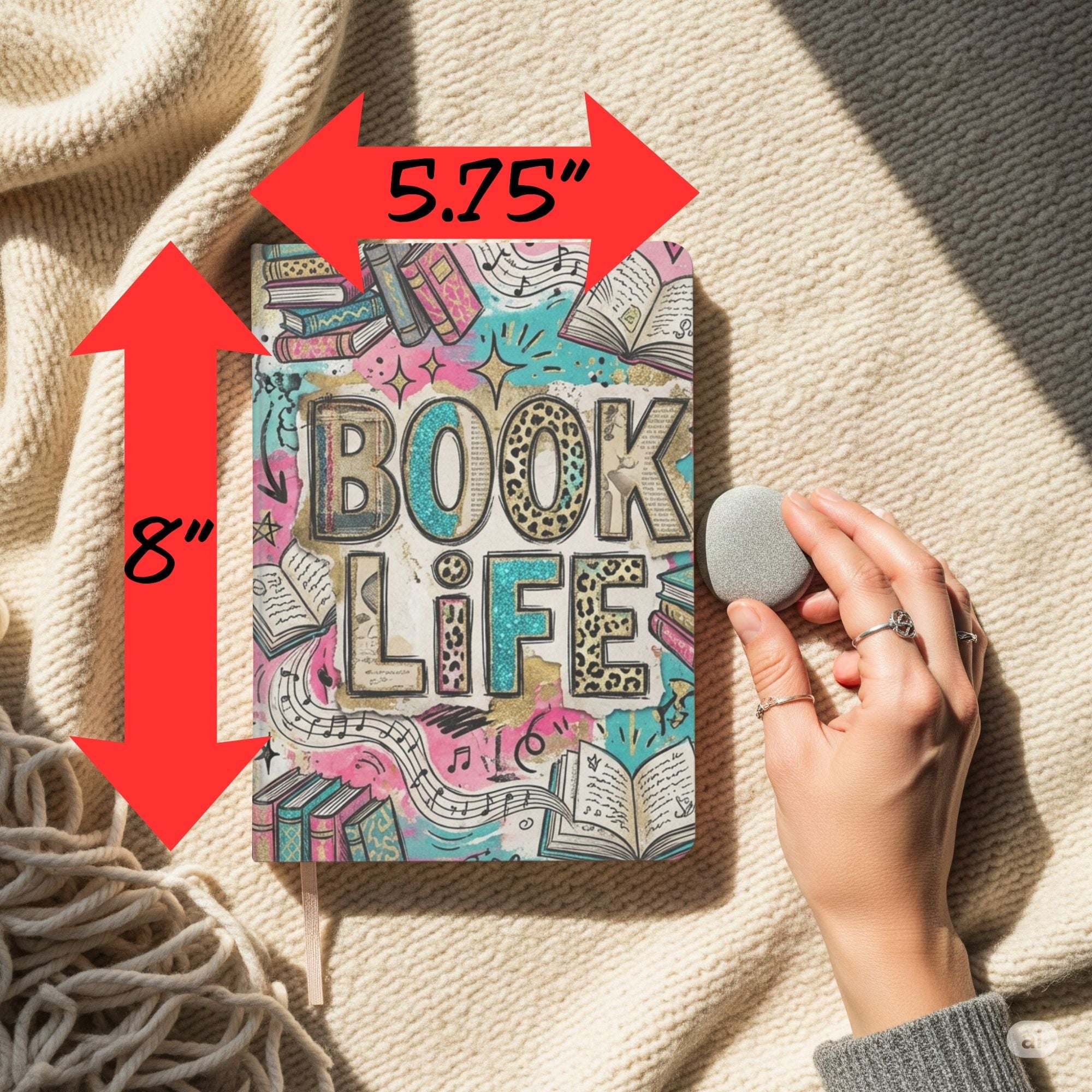With its bold retro mixed-media aesthetic, layered textures, and playful book illustrations, this notebook is the perfect everyday companion for anyone who loves reading, writing, and getting lost in stories. Inspired by trending BookTok and modern reader aesthetics, this journal features a vibrant, artistic cover filled with stacked books, open pages, music notes, and expressive brush strokes.