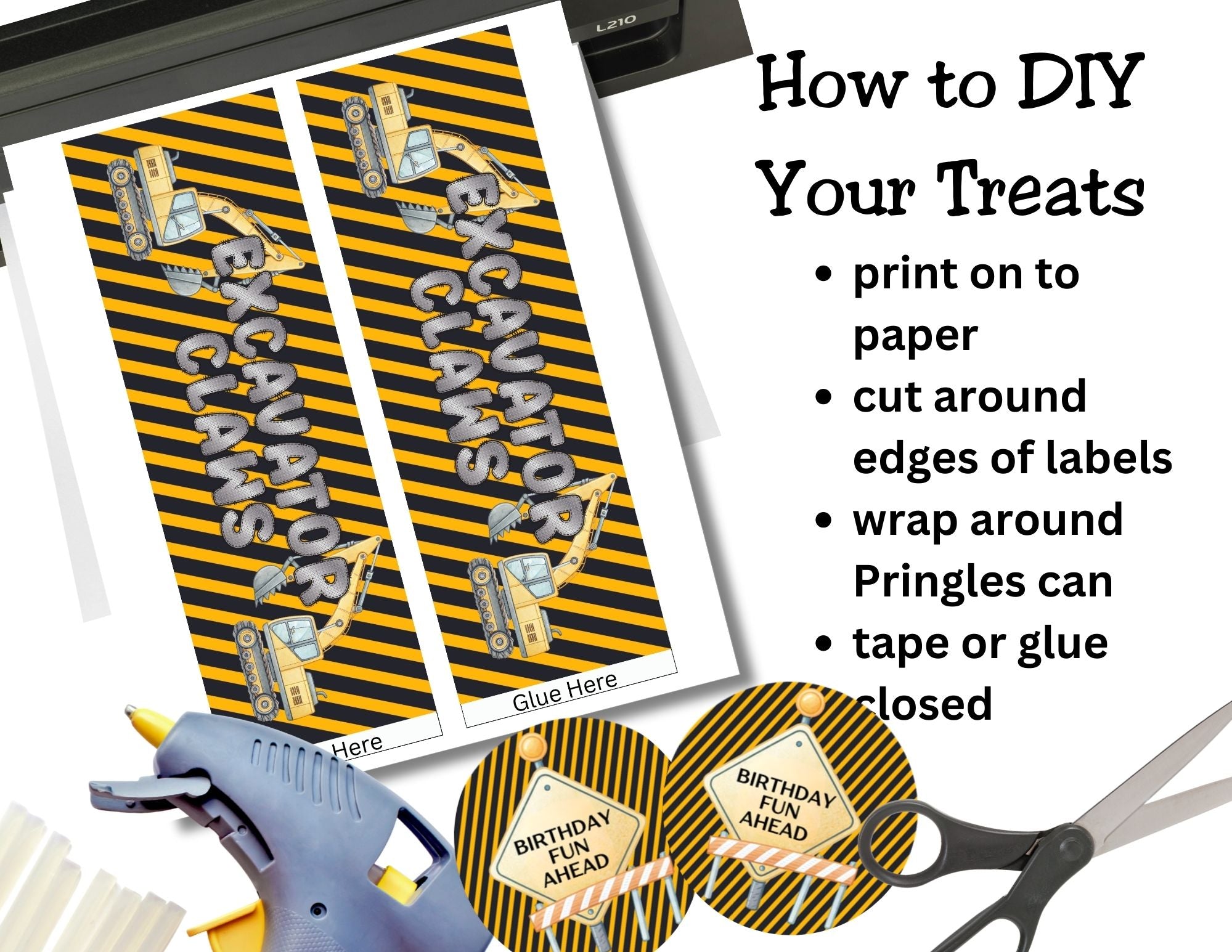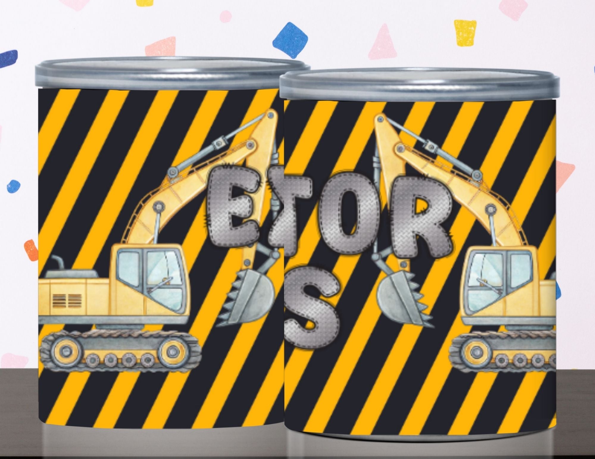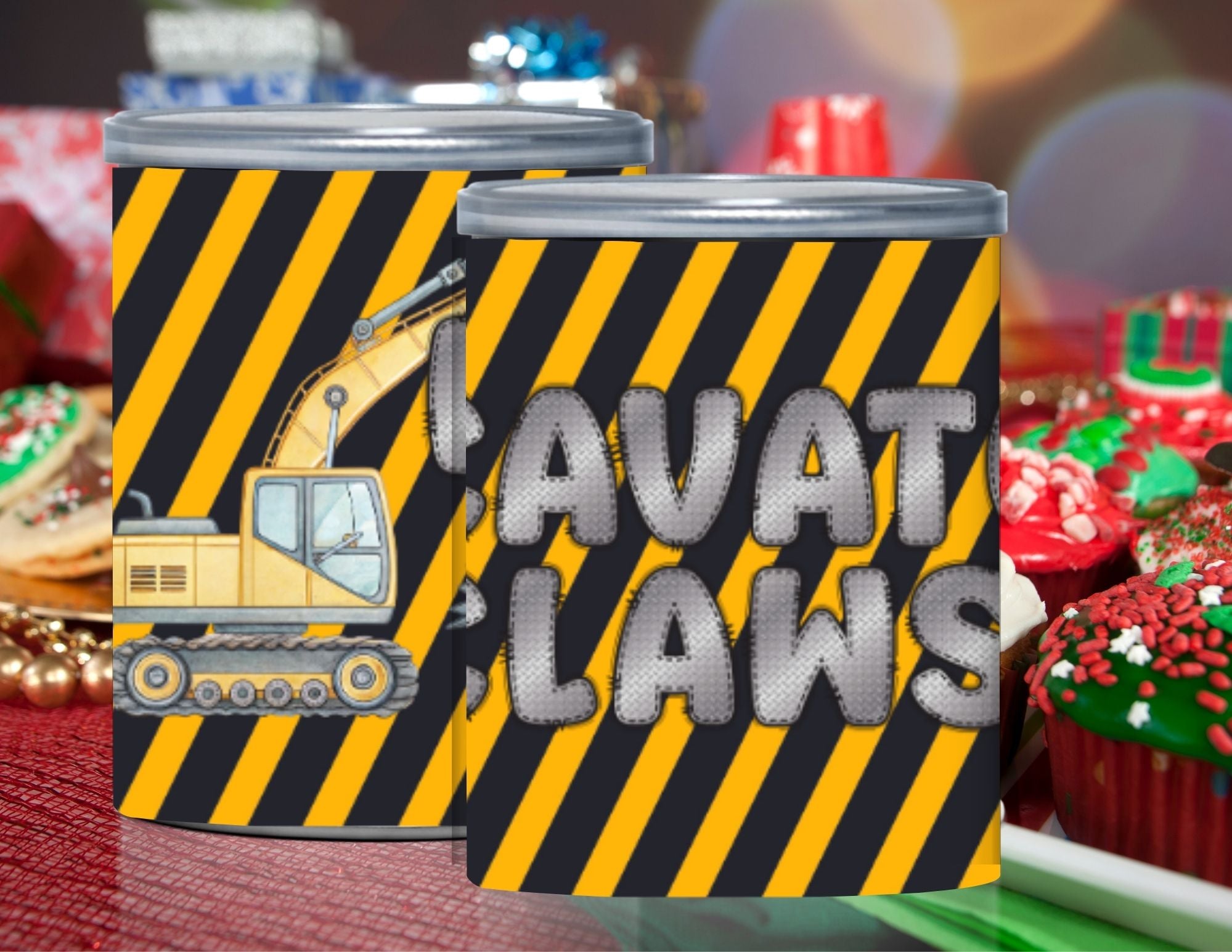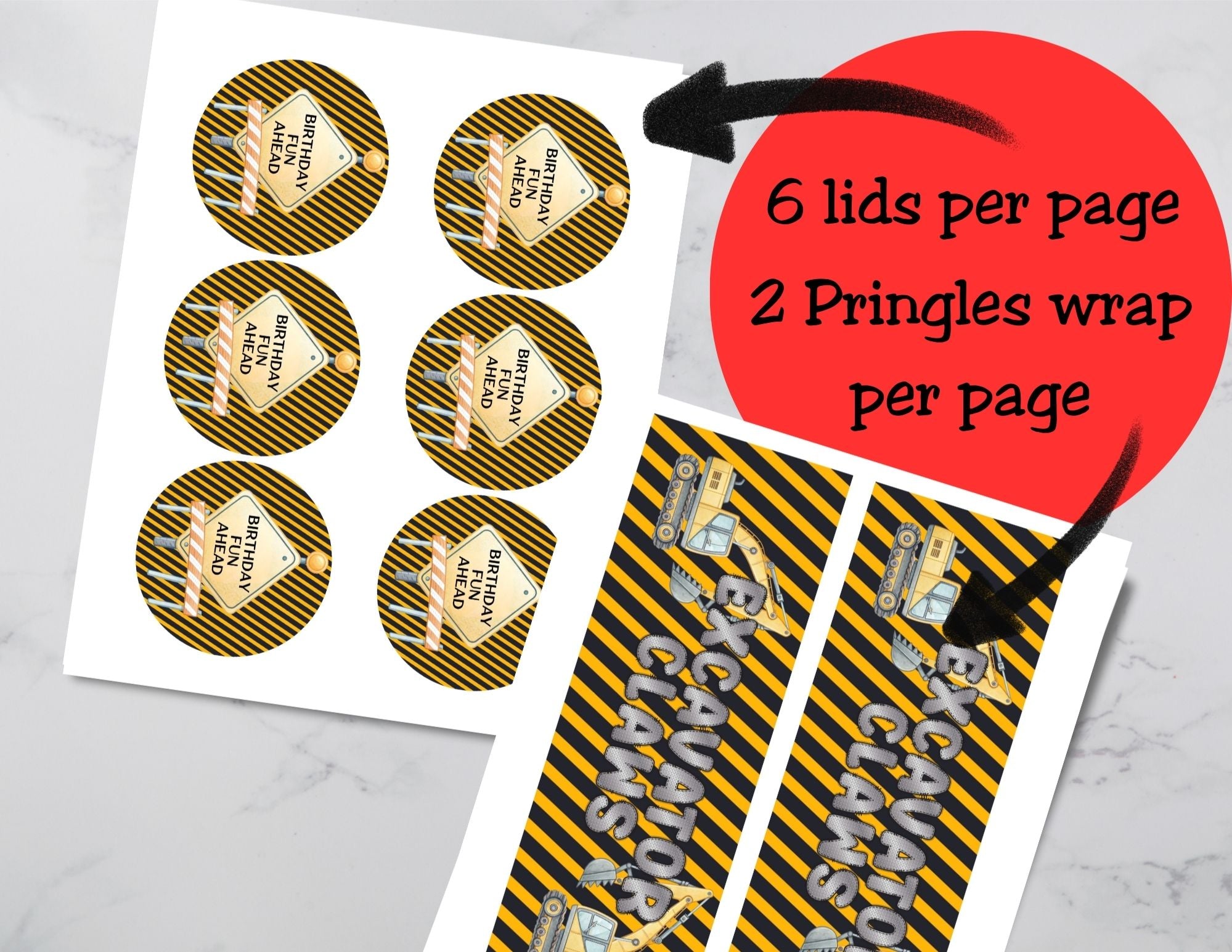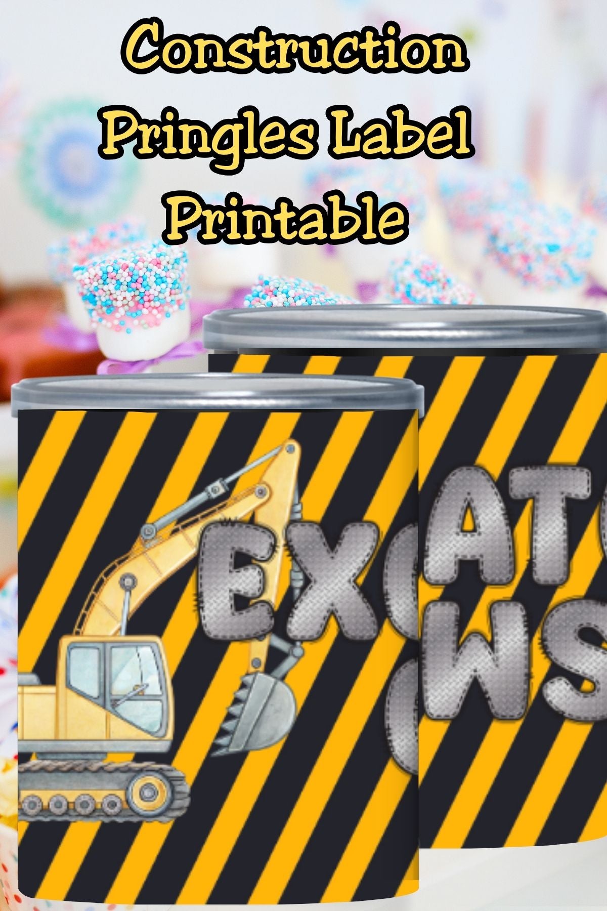 Make your snack table look under construction and totally party-ready with this Construction Pringles Can Label and Lid set. Designed with bold black and yellow work-zone stripes, playful excavators, and the fun phrase “Excavator Claws,” this set instantly transforms mini Pringles cans into eye-catching construction party favors.