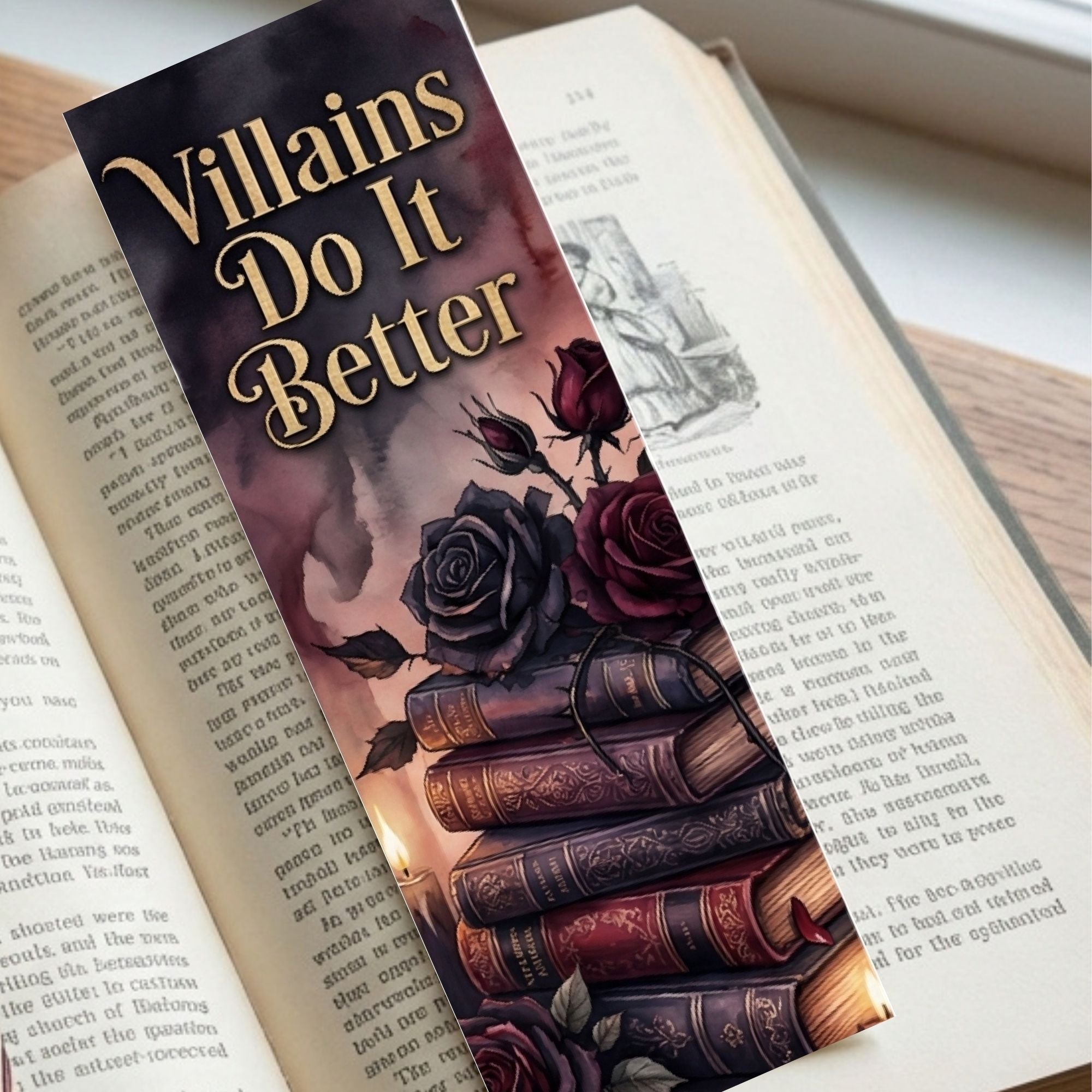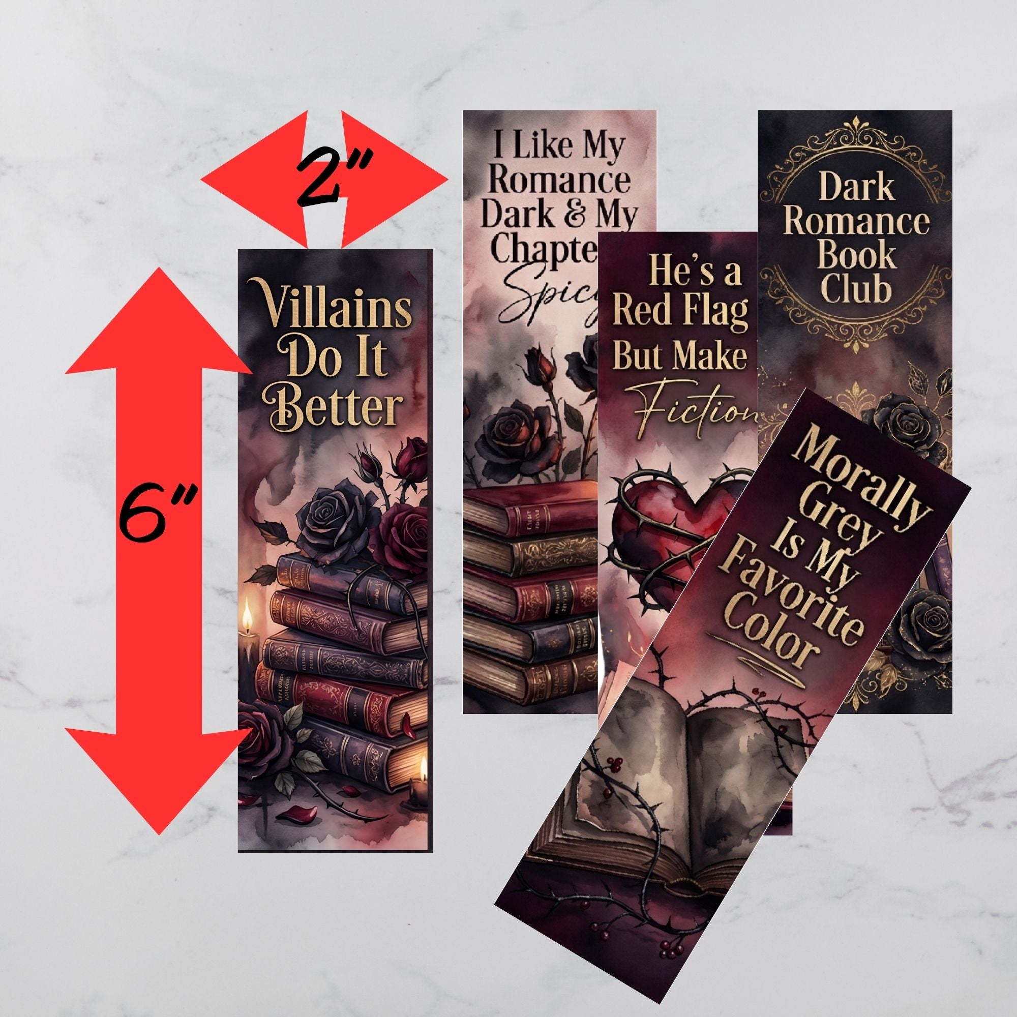 This set includes five 2 x 6 inch bookmarks featuring moody artwork, deep crimson tones, black roses, candlelight, and vintage book stacks. Quotes like I Like My Romance Dark & My Chapters Spicy, Morally Grey Is My Favorite Color, Villains Do It Better, and He’s a Red Flag — But Make It Fiction capture everything dark romance readers love in one cohesive collection.