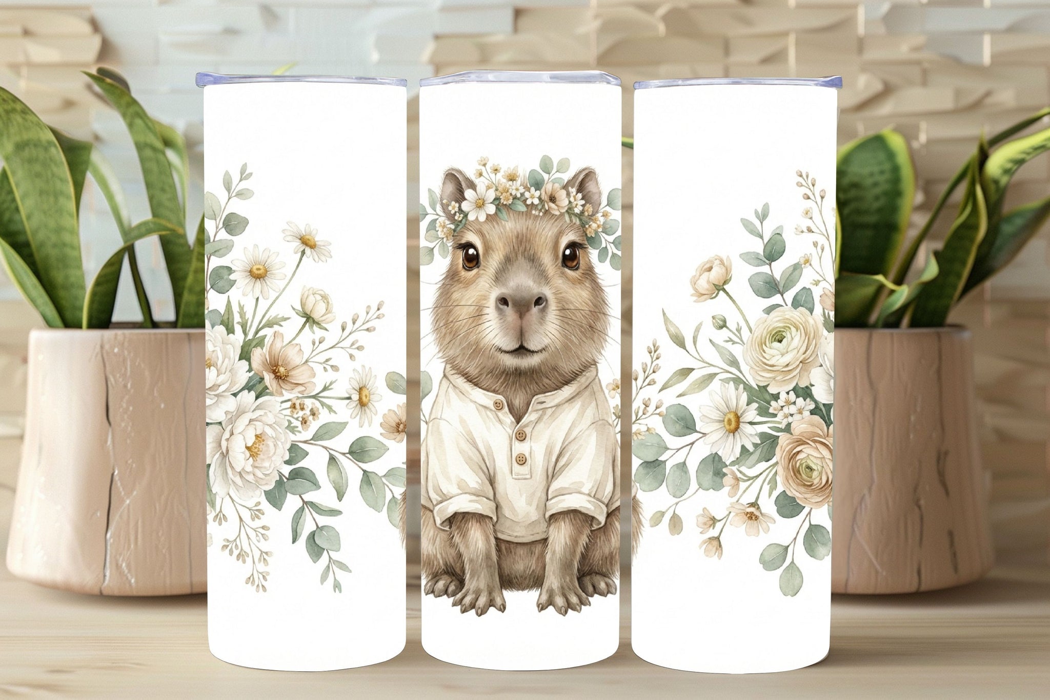 This Floral Capybara design features an adorable capybara dressed in a neutral outfit, crowned with delicate florals and surrounded by elegant boho greenery. With its calming earth tones and gentle cottage-inspired style, this tumbler is perfect for animal lovers, nursery-inspired aesthetics, and anyone who loves cute, peaceful designs.