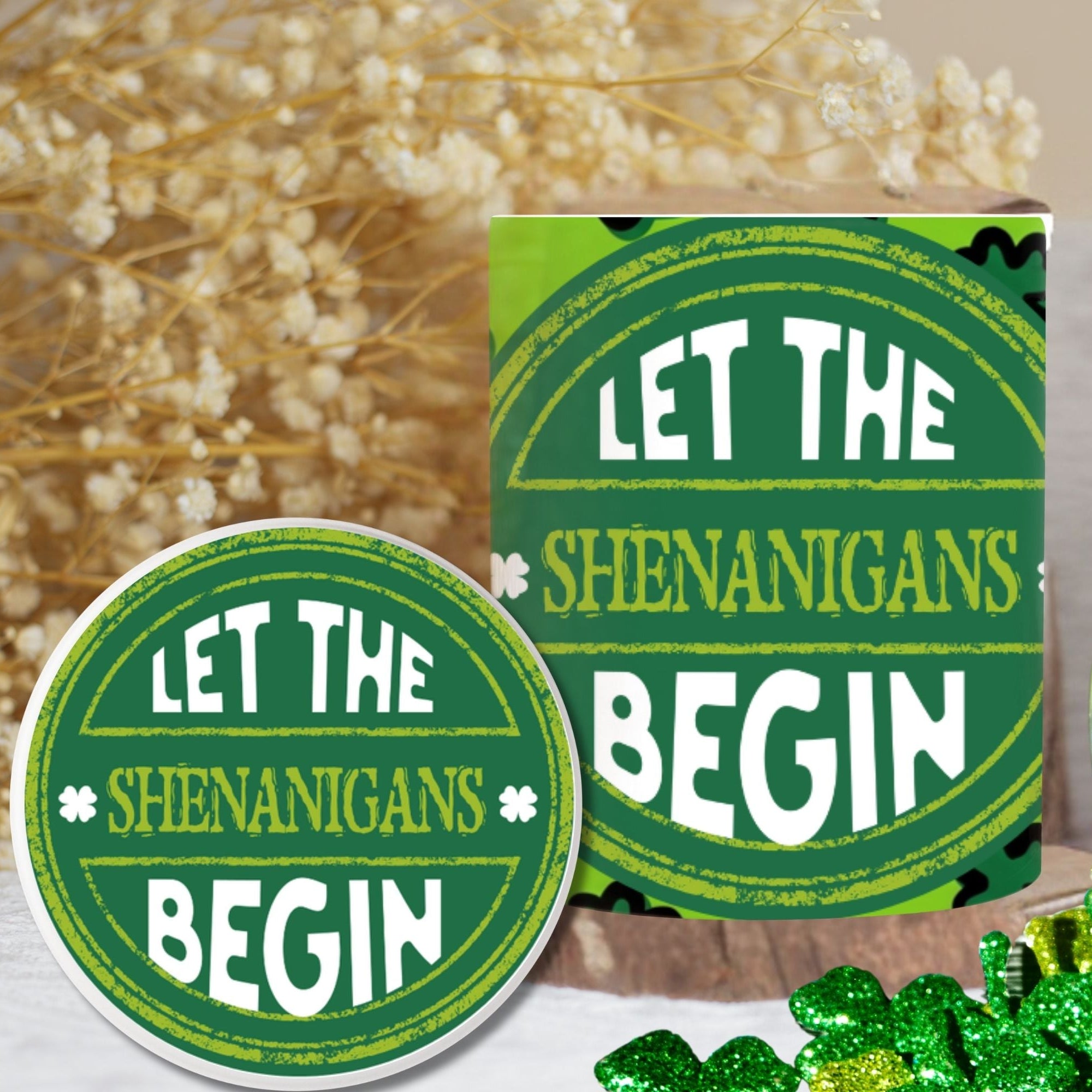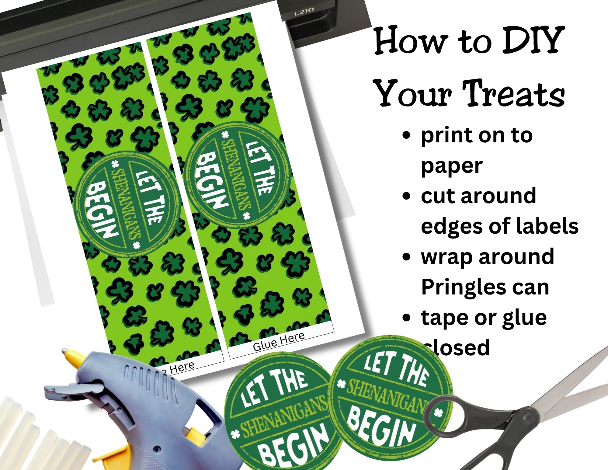 This “Let The Shenanigans Begin” Pringles can label printable features a bold green shamrock leopard background with a vintage-style badge design that instantly makes your snack table look custom and coordinated.