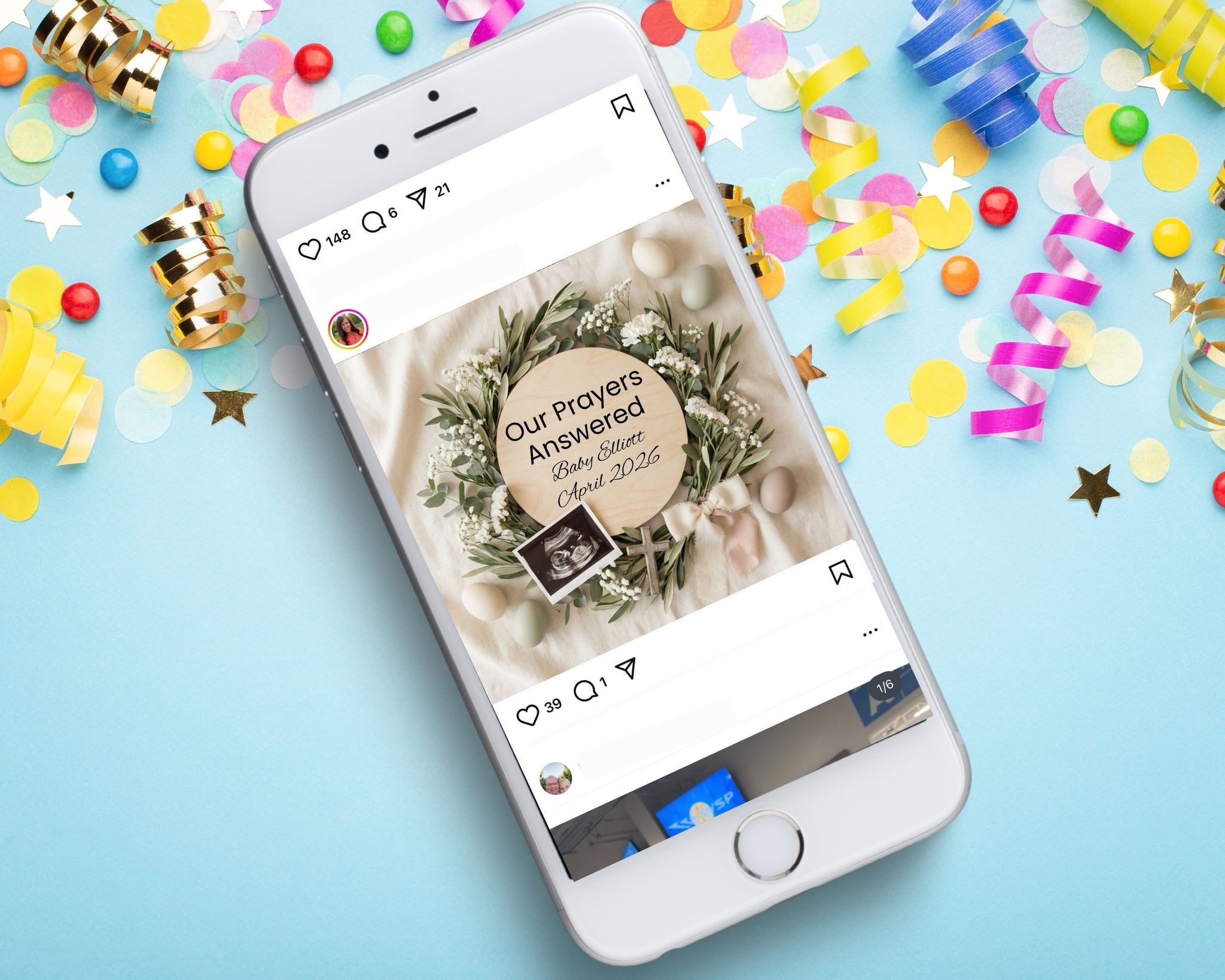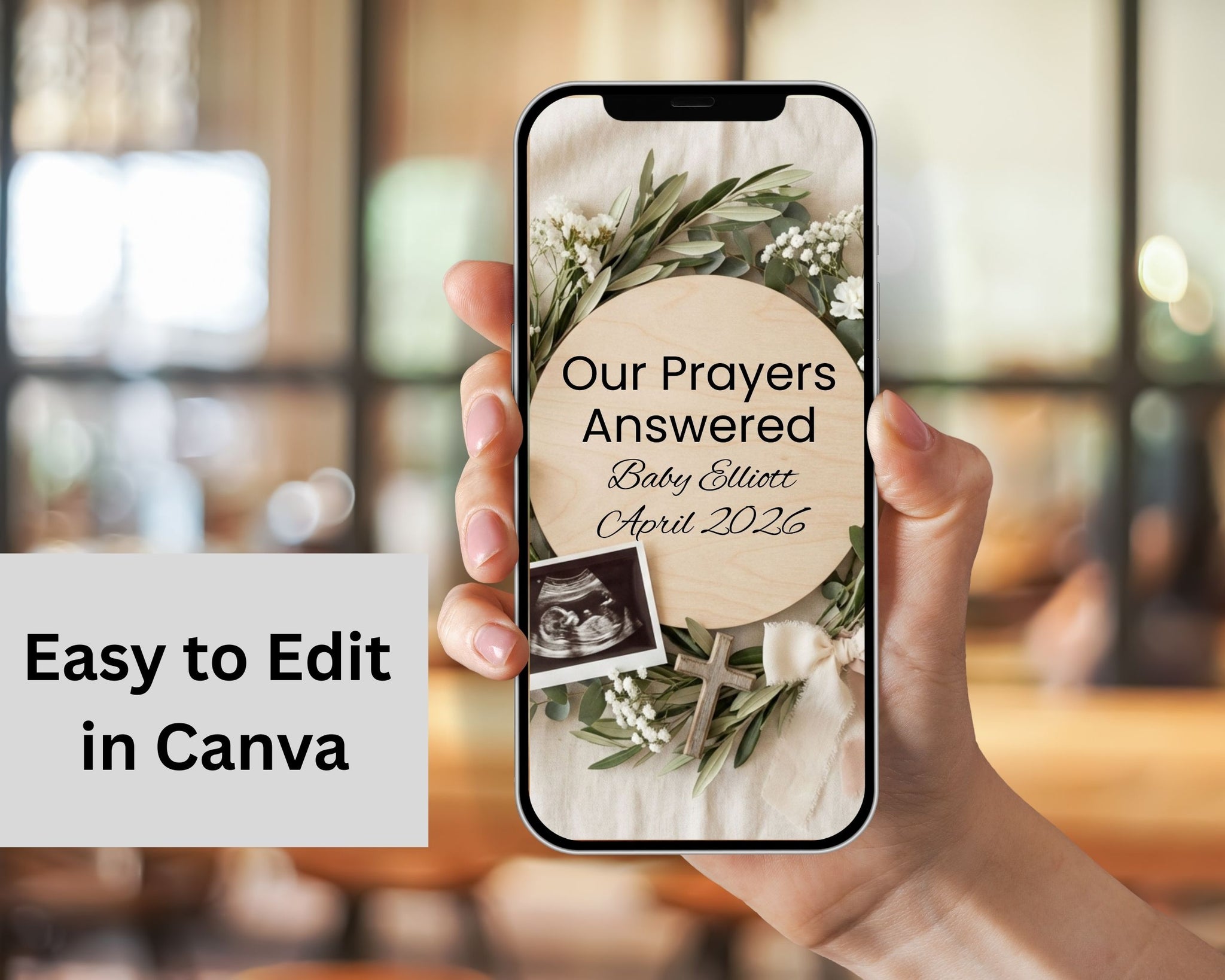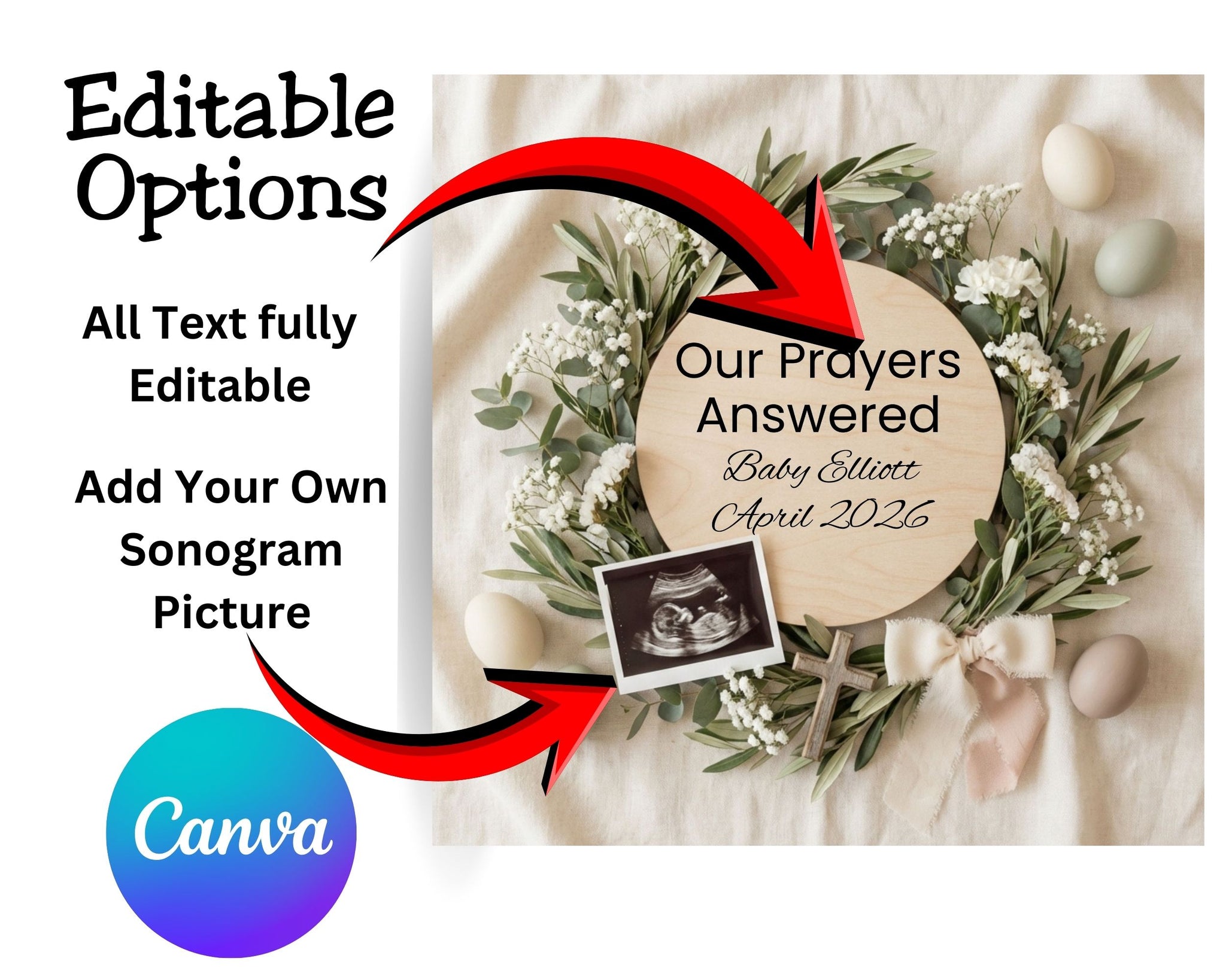 Our Prayers Answered Easter Christian Pregnancy Announcement Canva Template