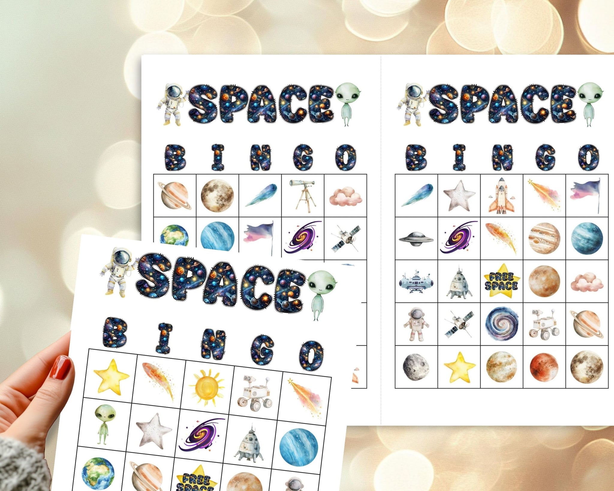 Whether you’re a mom planning a memorable party or a teacher looking for a fun, low-prep reward game, this space bingo set makes it easy to keep kids engaged, focused, and excited. The colorful space-themed images—planets, rockets, astronauts, aliens, and UFOs—are easy for kids to recognize and fun for all ages.