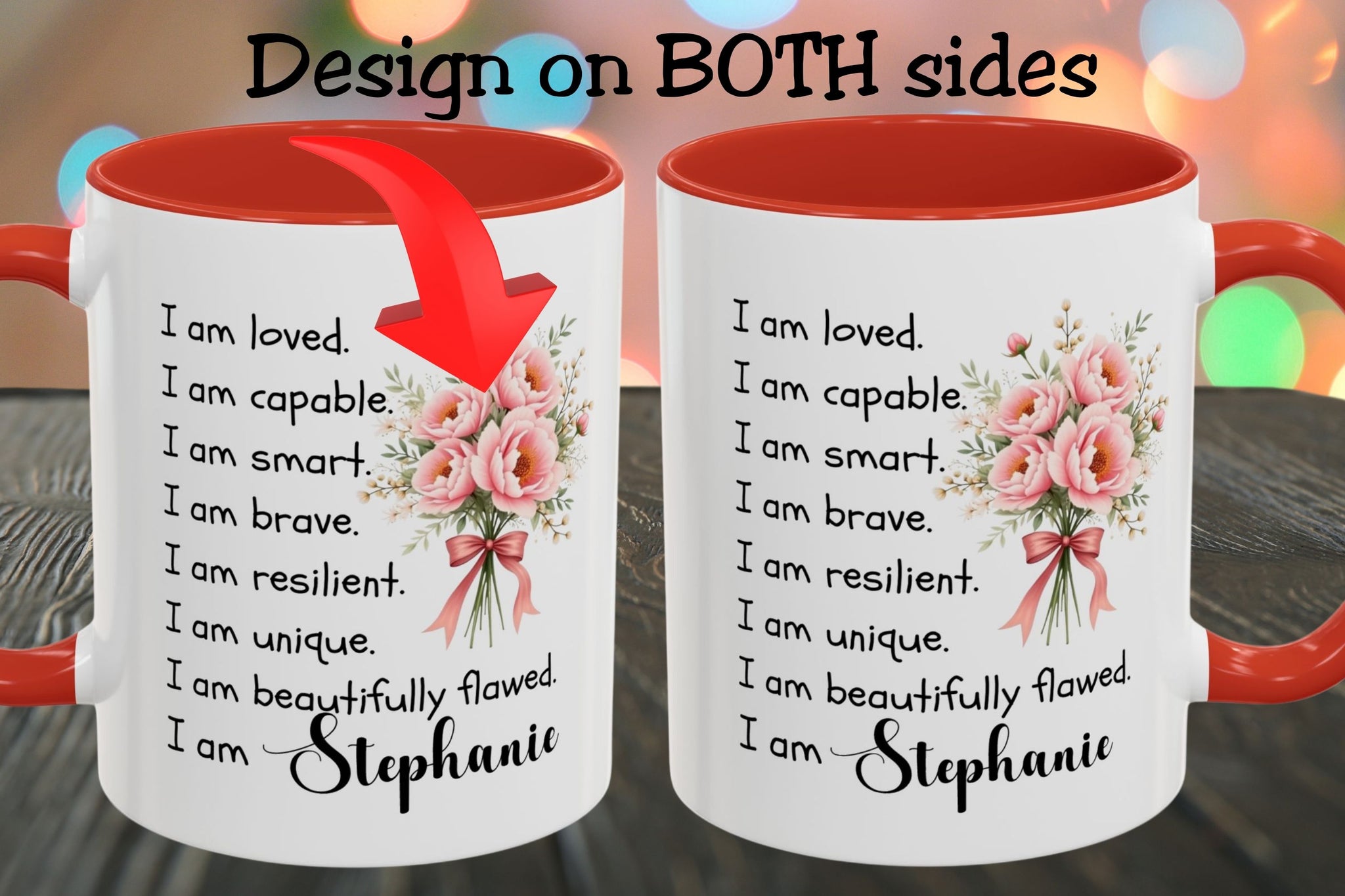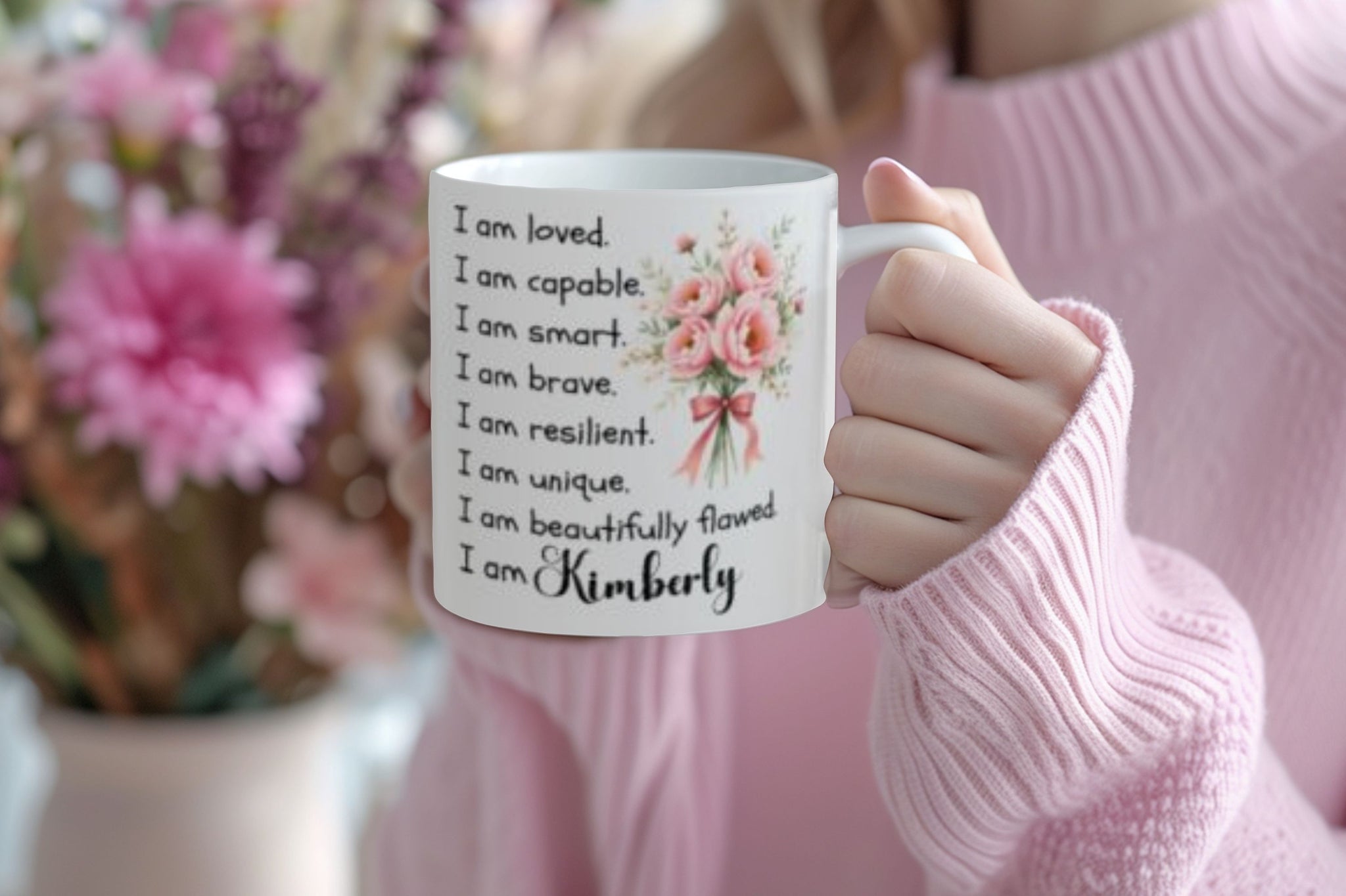 Featuring a soft floral design, uplifting “I am” affirmations, and your chosen name, this mug turns your morning coffee, tea, or hot chocolate into a meaningful ritual. Whether it’s your first sip before a busy day or a quiet moment in the evening, this mug helps create a calm, comforting pause that feels personal and intentional.
