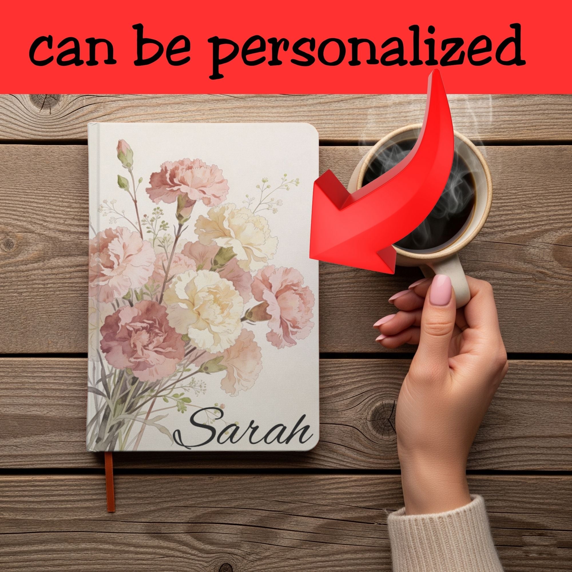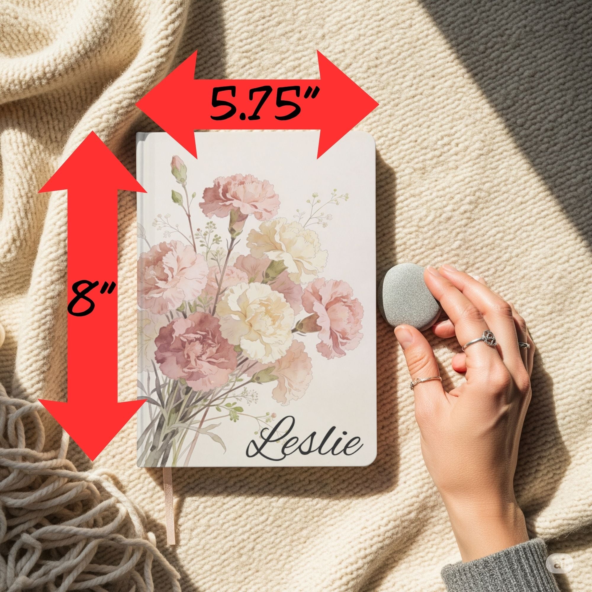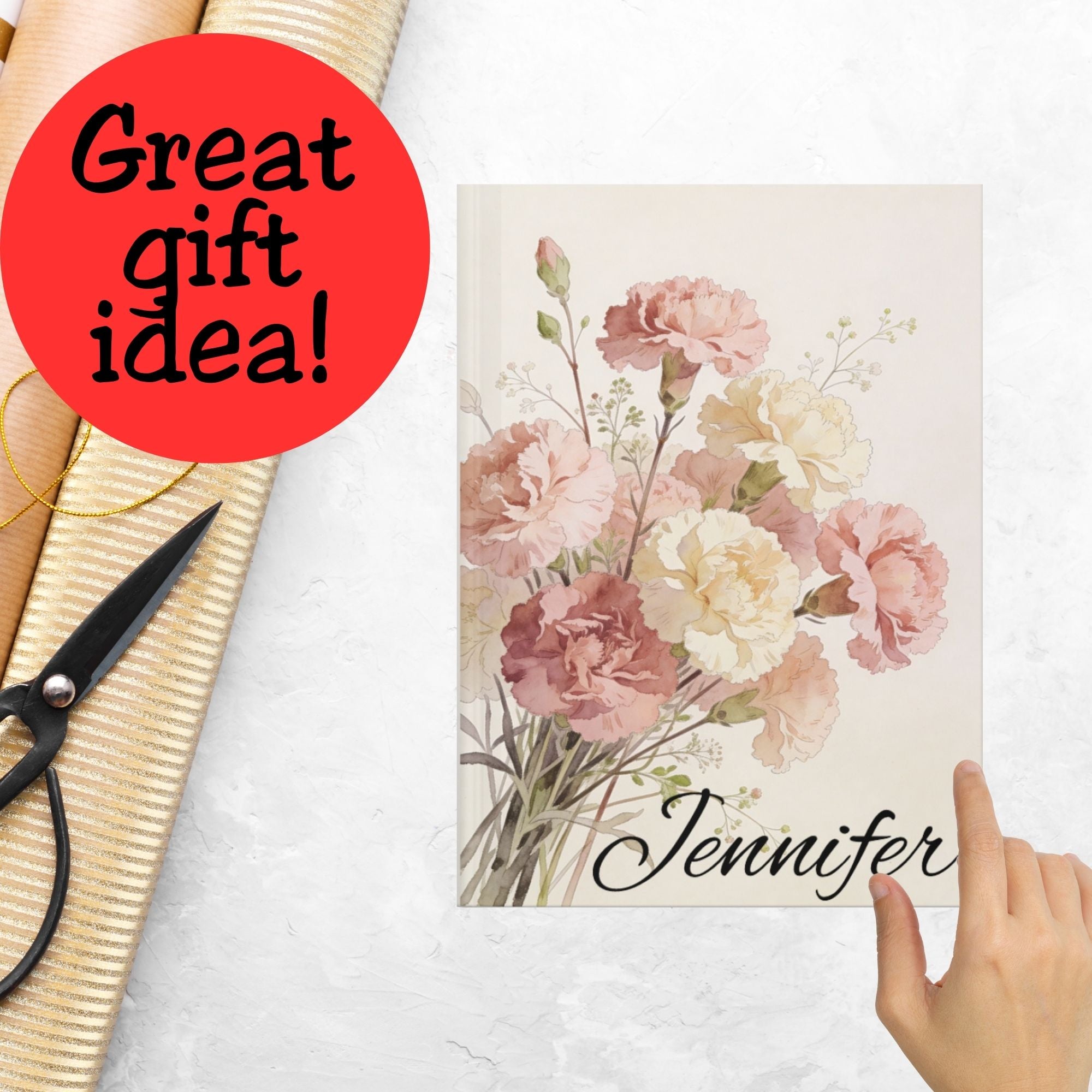 The January carnation design symbolizes love, admiration, and strength, making this birth flower notebook especially meaningful as a gift. Adding a personalized name transforms it into something uniquely hers — perfect for encouraging consistency, creativity, and mindfulness through journaling.