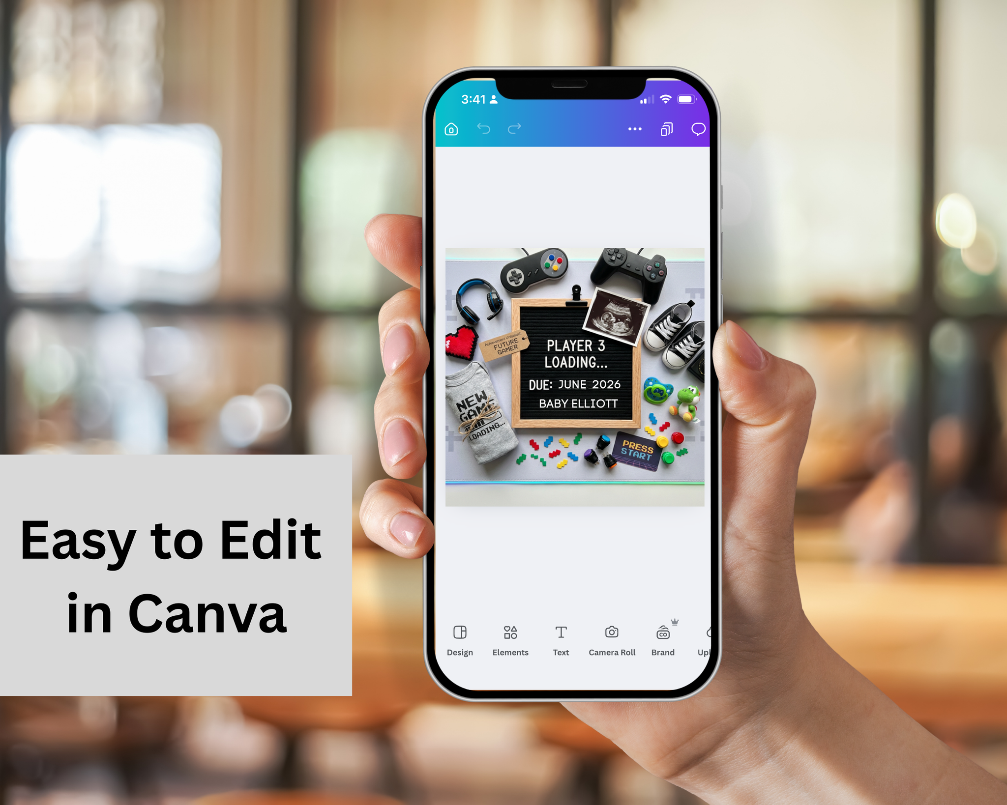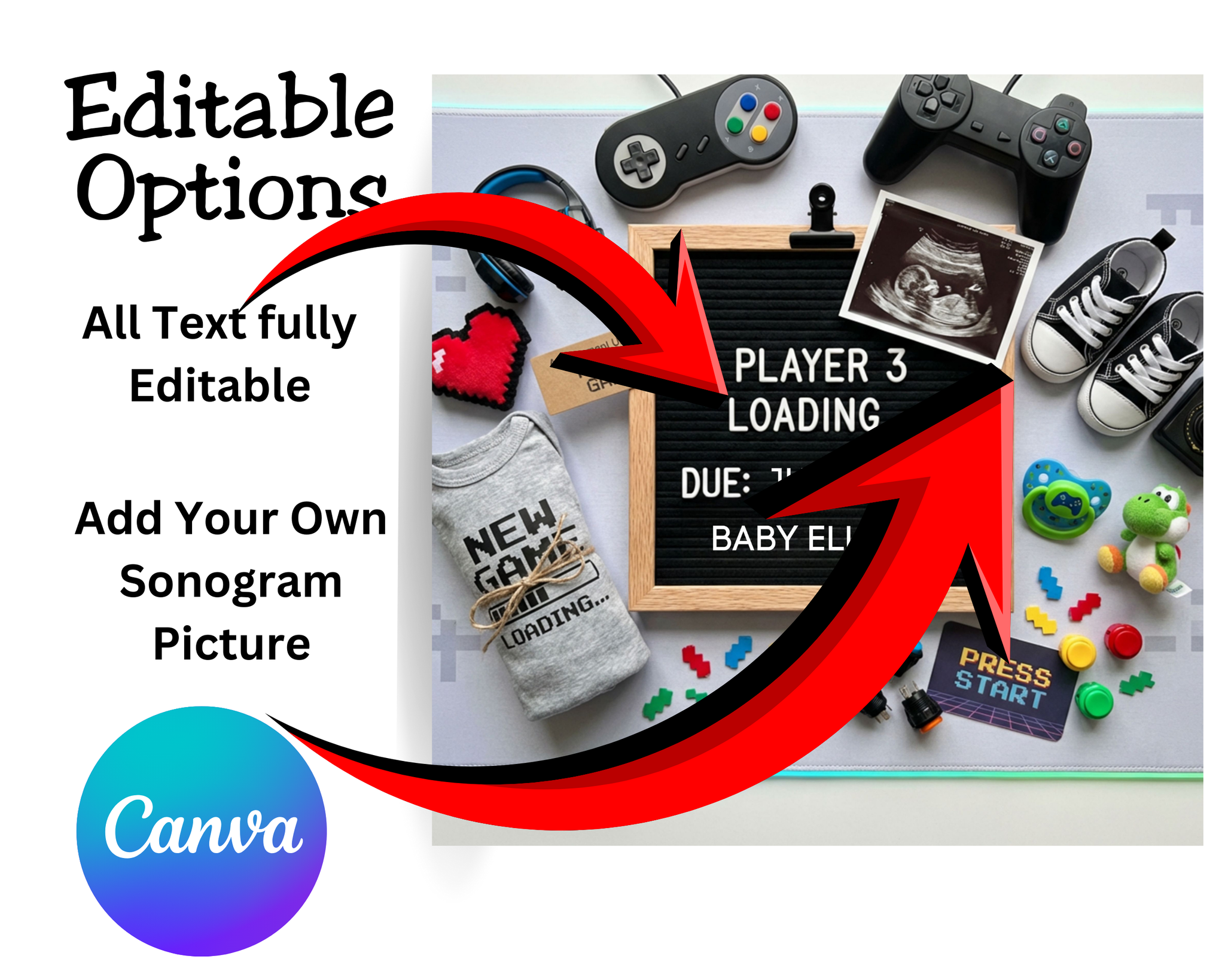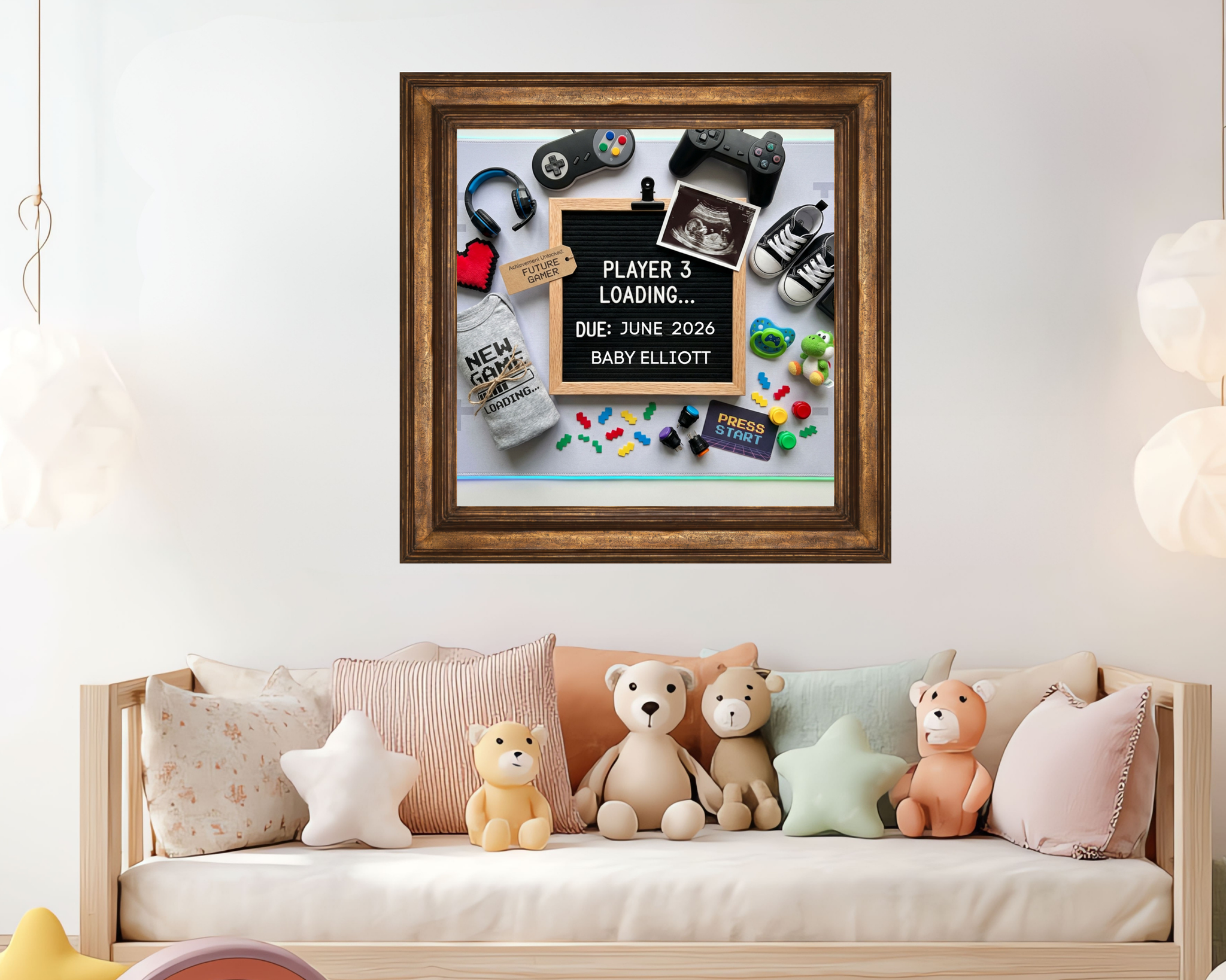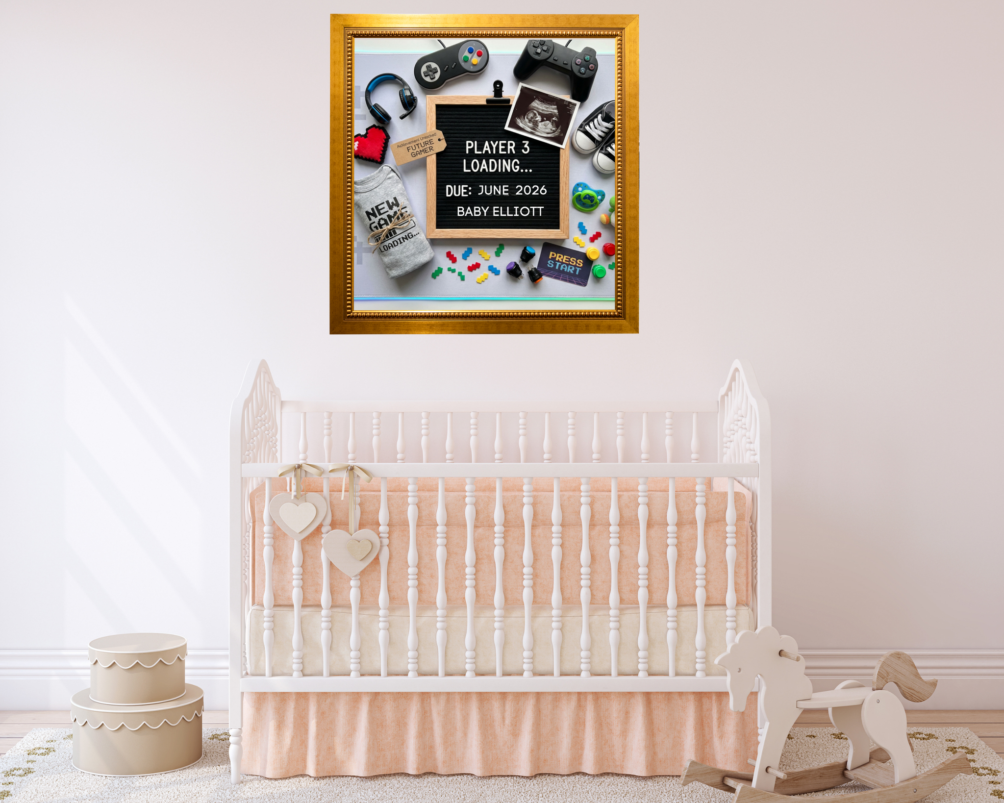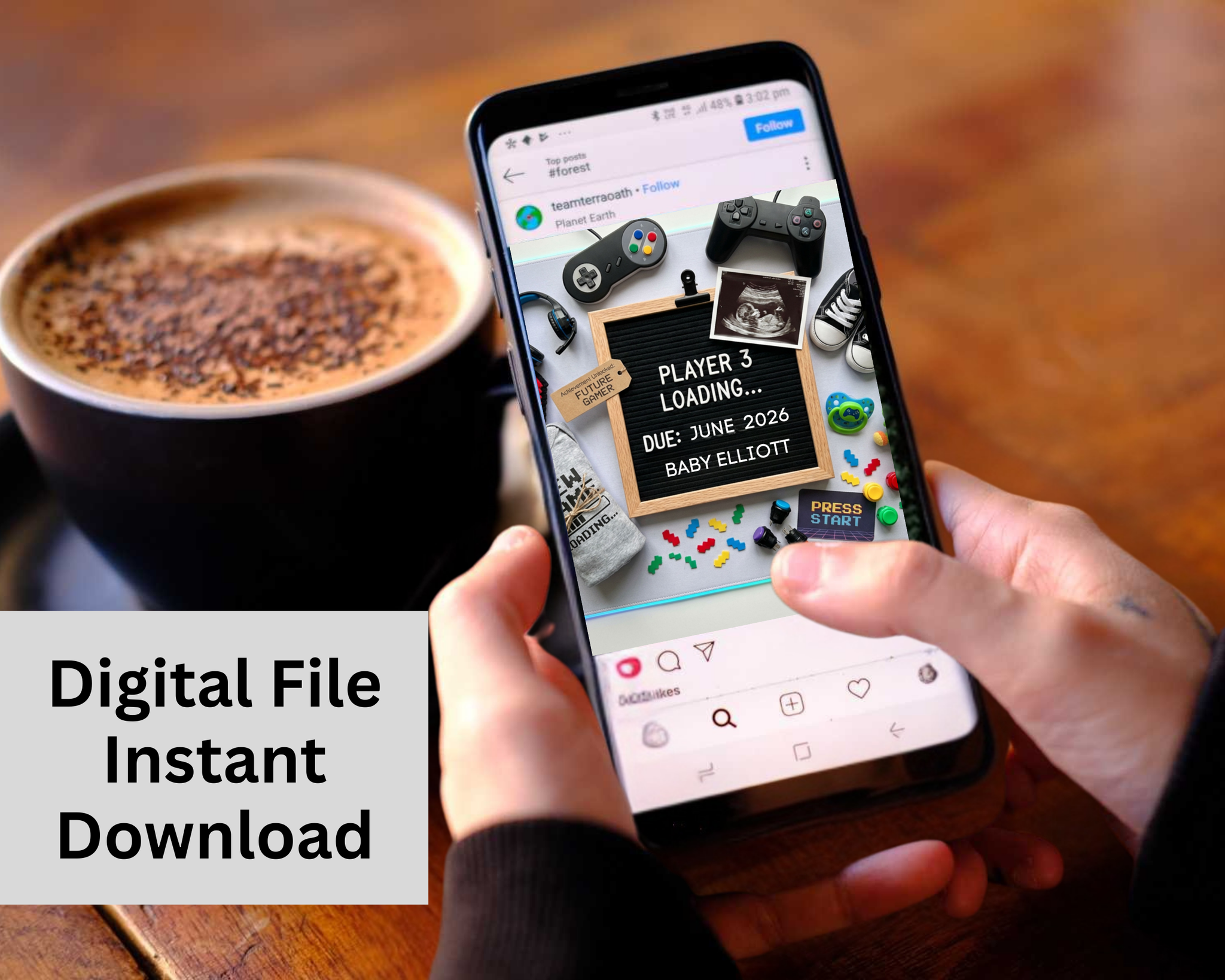 Announce your newest player with this gaming-themed pregnancy announcement, created for gamer couples and video game lovers who want a fun, modern way to share their big news. Inspired by the popular “Player 3 Loading” trend, this announcement turns your pregnancy reveal into an exciting achievement moment.