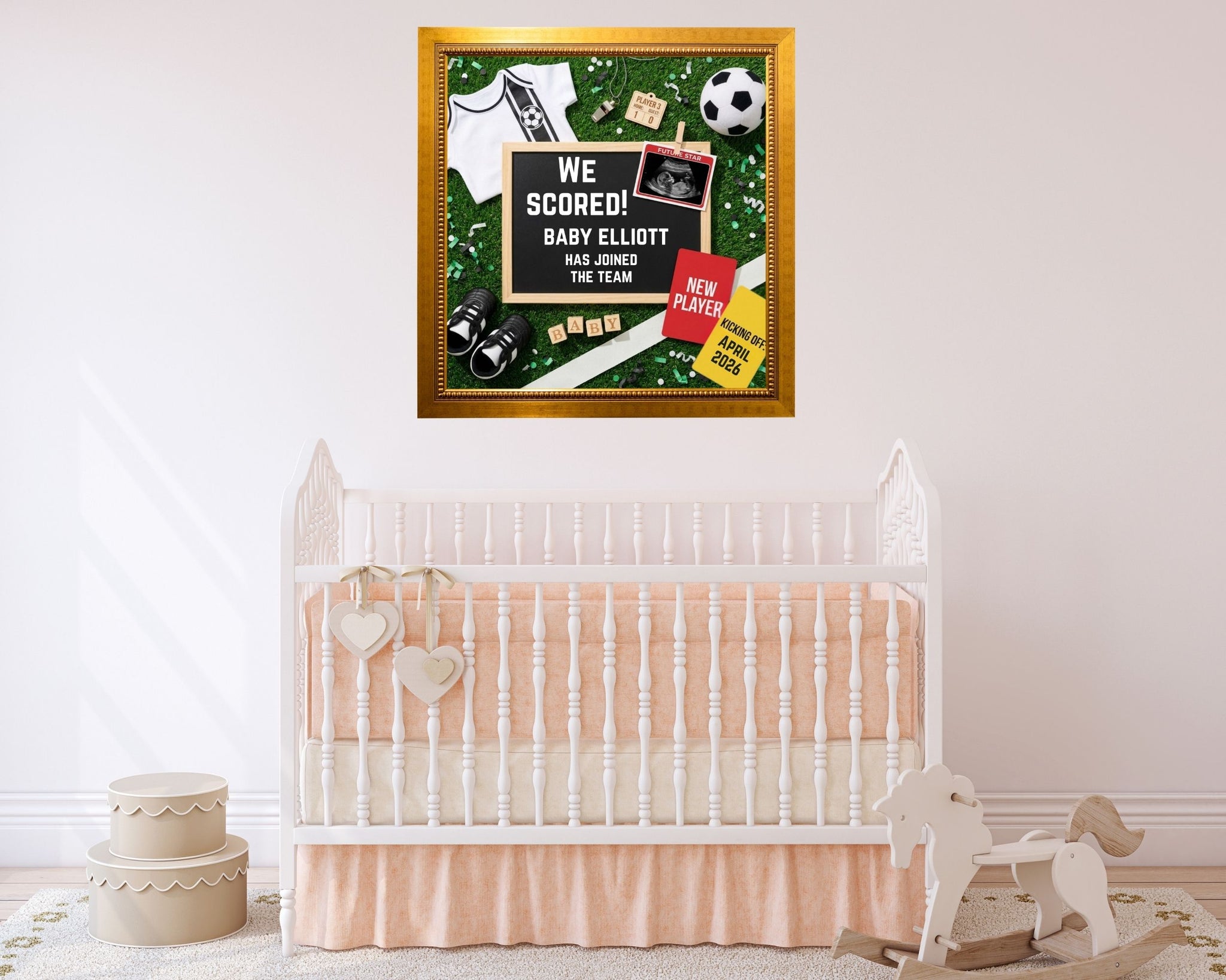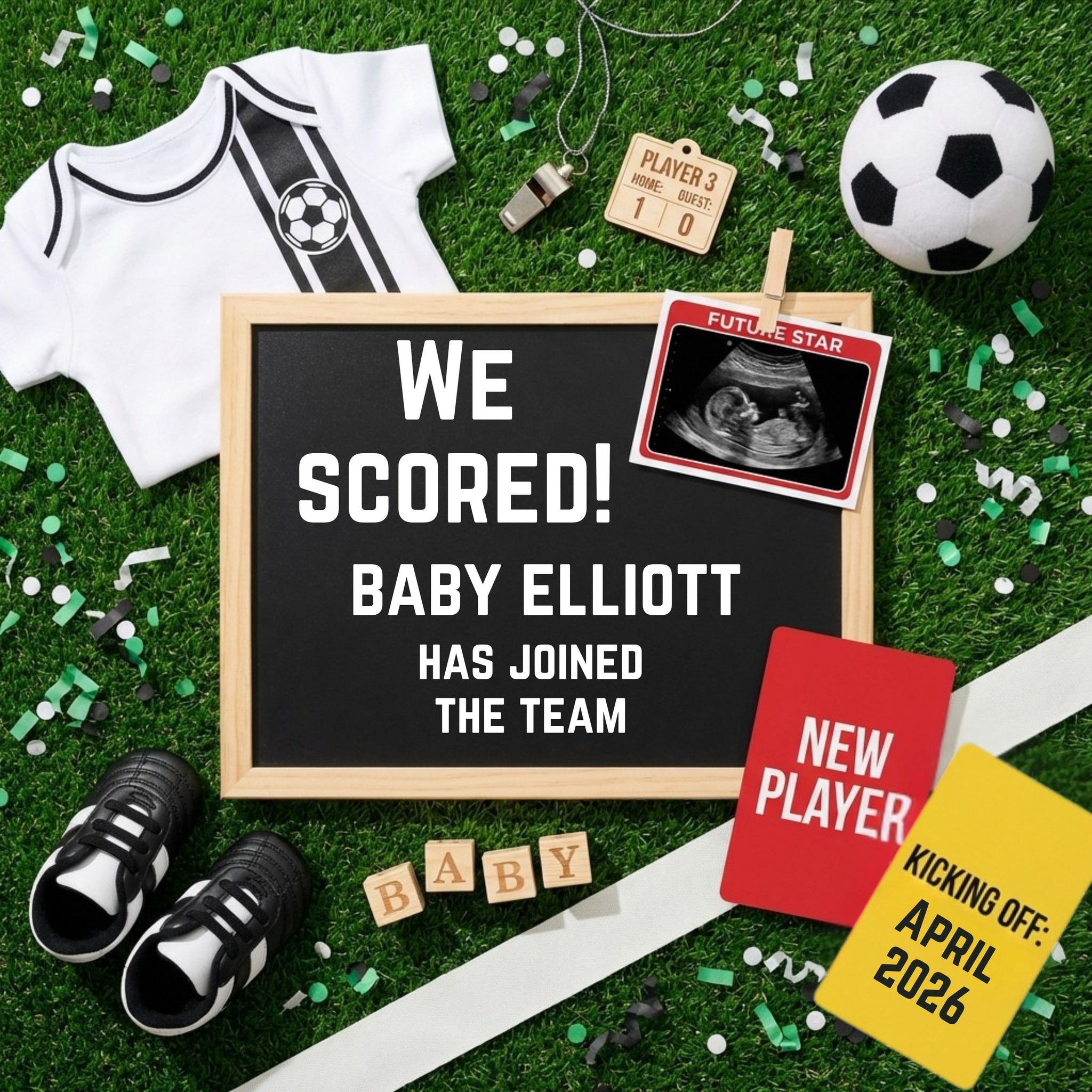This We Scored Baby announcement features a bold scoreboard-style design, soccer-inspired details, and space to add your own wording and ultrasound photo. Whether you’re sharing online, printing for a keepsake, or surprising grandparents, this sports pregnancy announcement makes your reveal memorable and meaningful.
