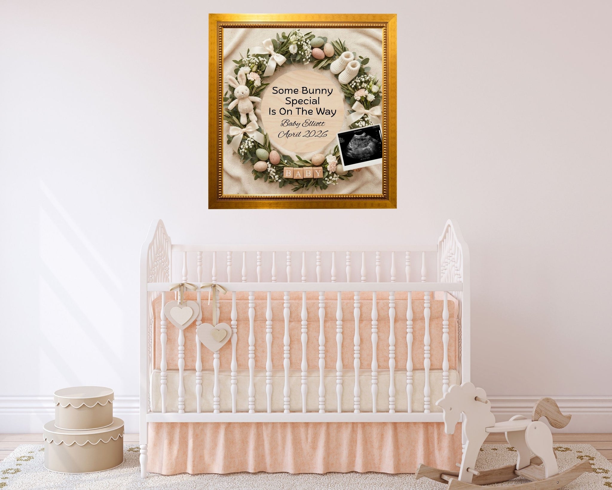 Styled with a soft, heirloom-inspired aesthetic, this design features a neutral spring wreath, subtle Easter elements, and a blank round wooden sign—perfect for creating a heartfelt and polished baby reveal for social media, text messages, or printed keepsakes.