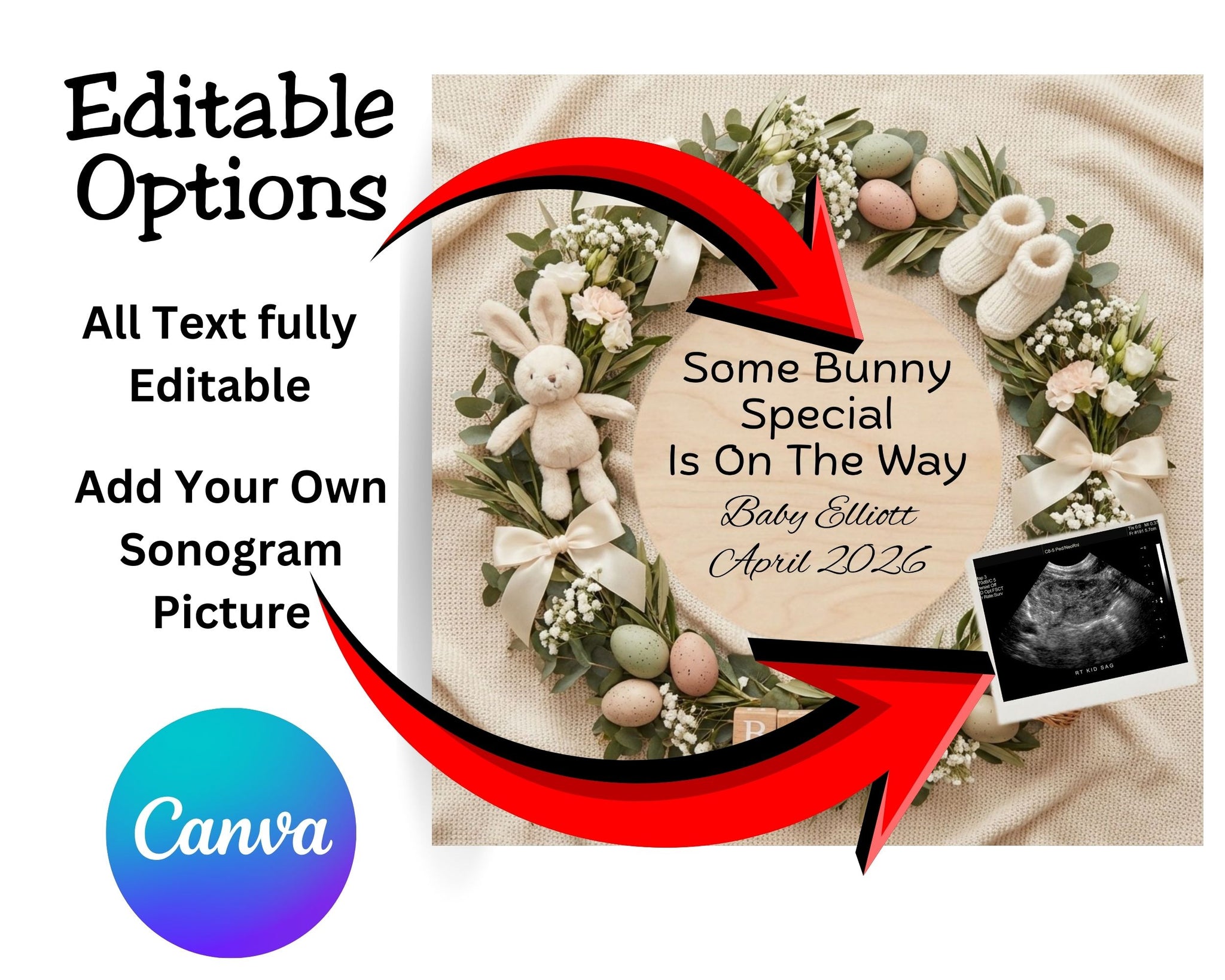 Announce your pregnancy this Easter with a timeless, cozy, and elegant digital pregnancy announcement designed for modern families who love neutral tones and meaningful details. This editable Easter pregnancy announcement template is created for easy customization in Canva, allowing you to personalize the text and add your own ultrasound photo in minutes.
