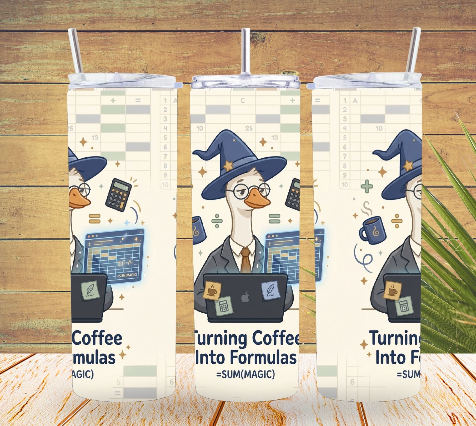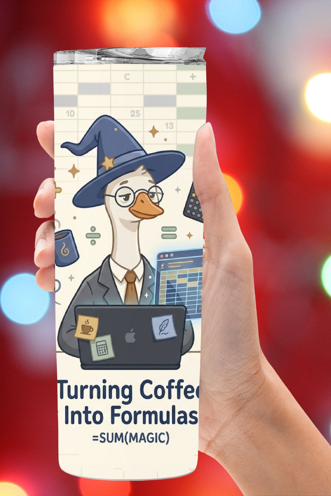 This Spreadsheet Wizard design is made for the Excel pros who magically transform caffeine into calculations. Featuring a clever goose wizard surrounded by spreadsheets, formulas, and office essentials, this tumbler brings smart humor and cozy office vibes together in one standout design.