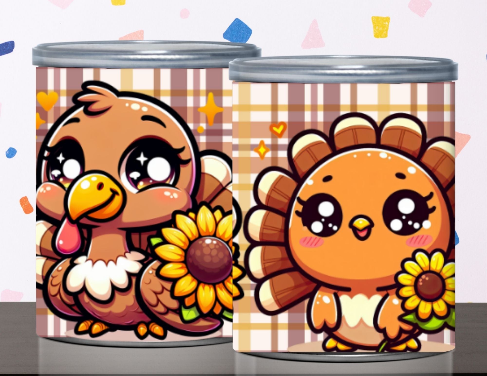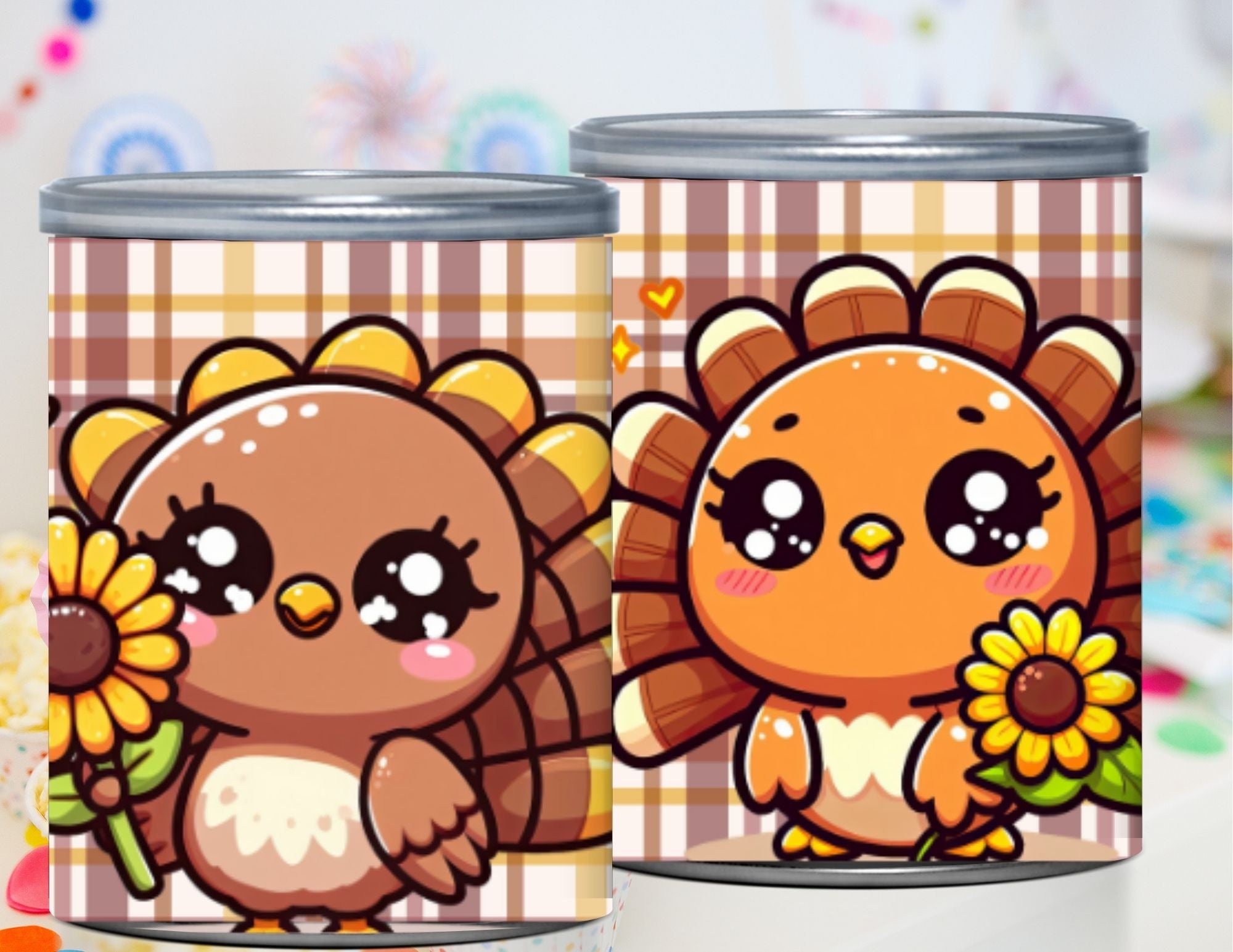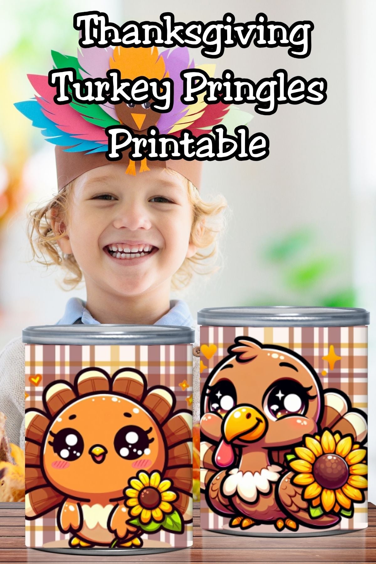Add a touch of Thanksgiving cuteness to your kids’ table with these adorable Pringles can label printables! Each design features sweet cartoon turkeys holding cheerful sunflowers on a warm plaid background — the perfect way to dress up your snacks for the holiday. 🍁