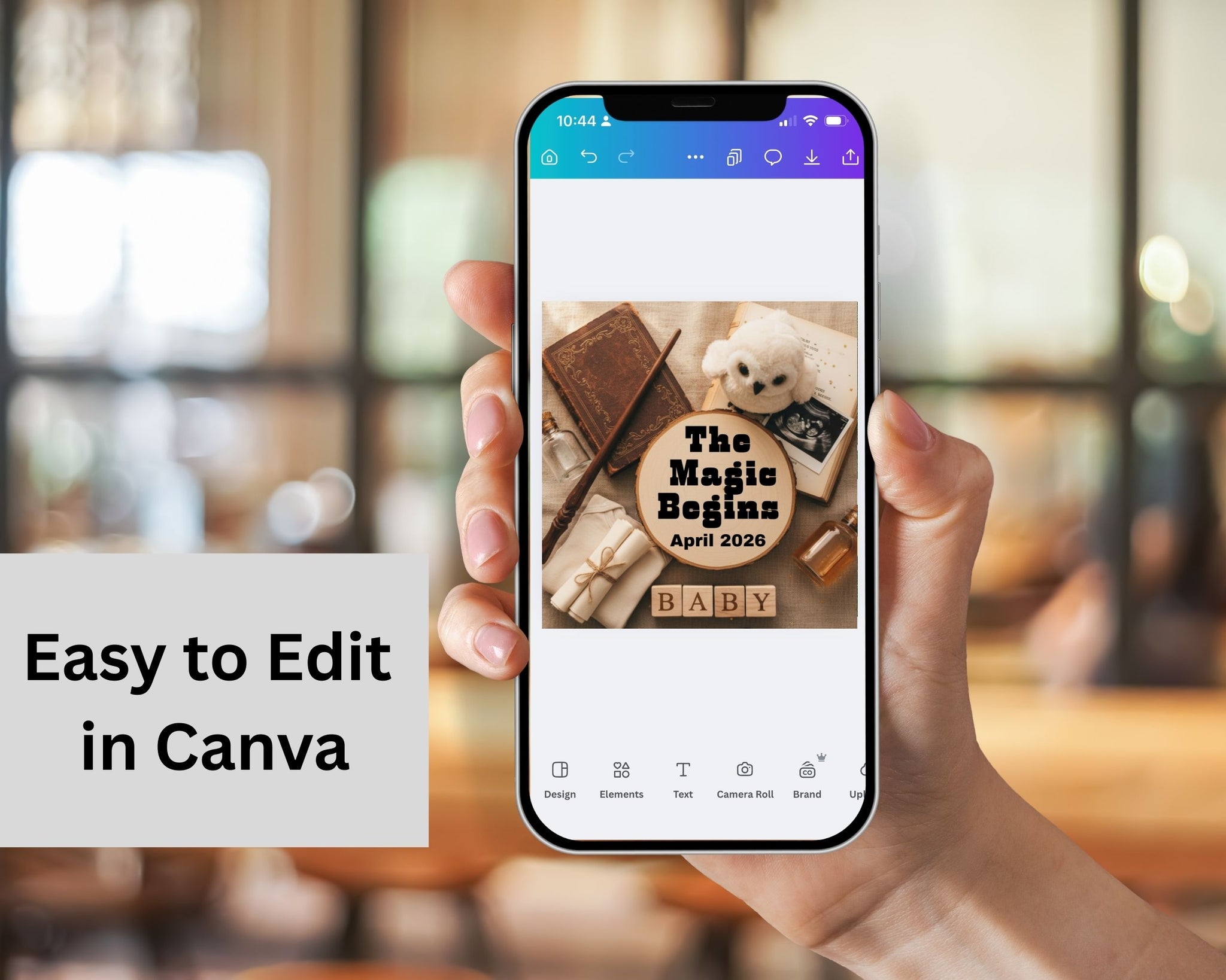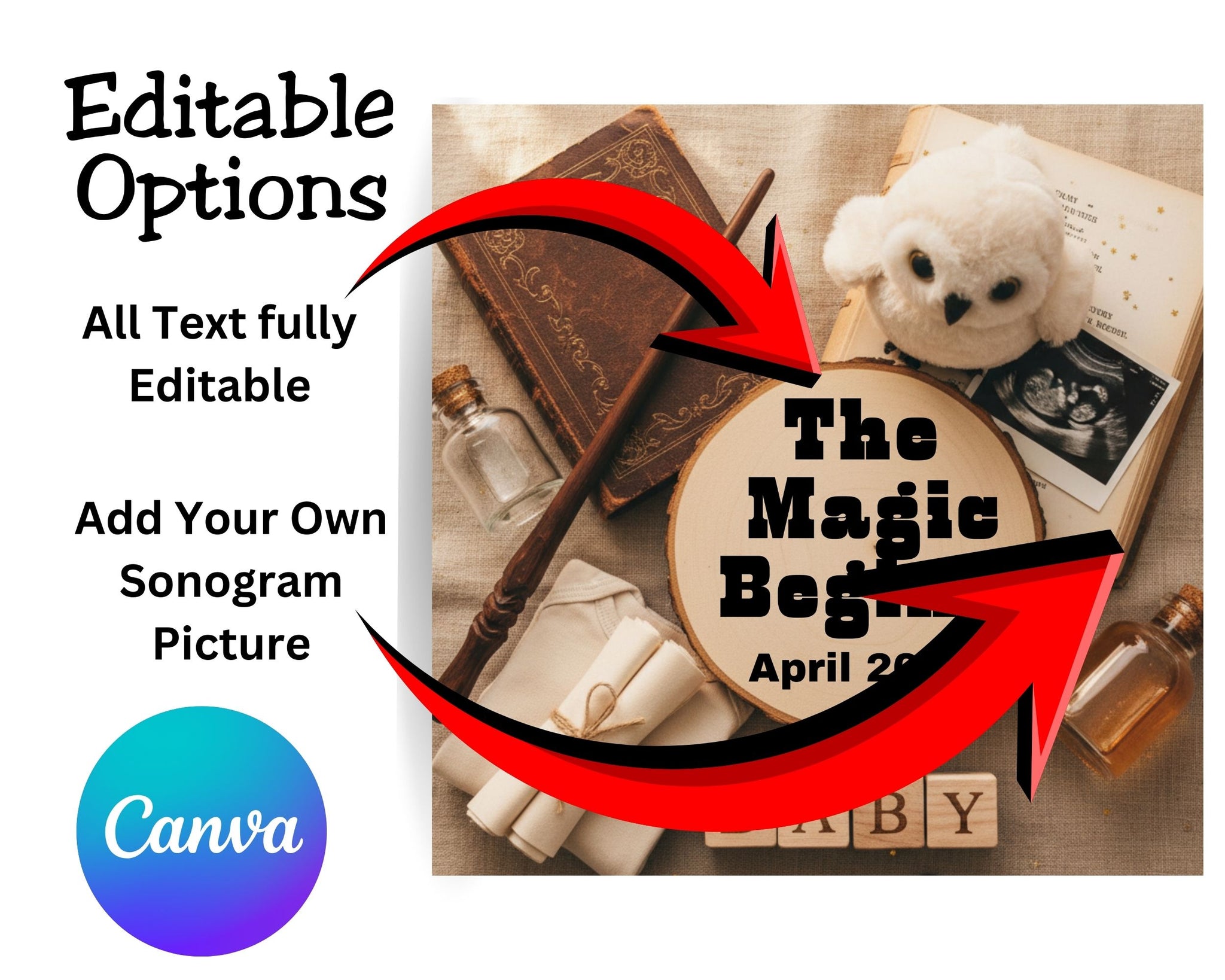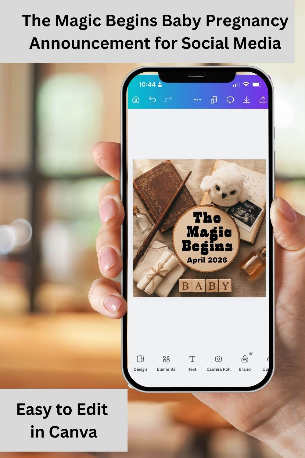 The template is fully editable in Canva, allowing you to personalize the text with your due date, announcement wording, or special details. After sharing your pregnancy reveal, reuse the design as wizard nursery wall art, shelf decor, or a framed keepsake for your baby’s room.