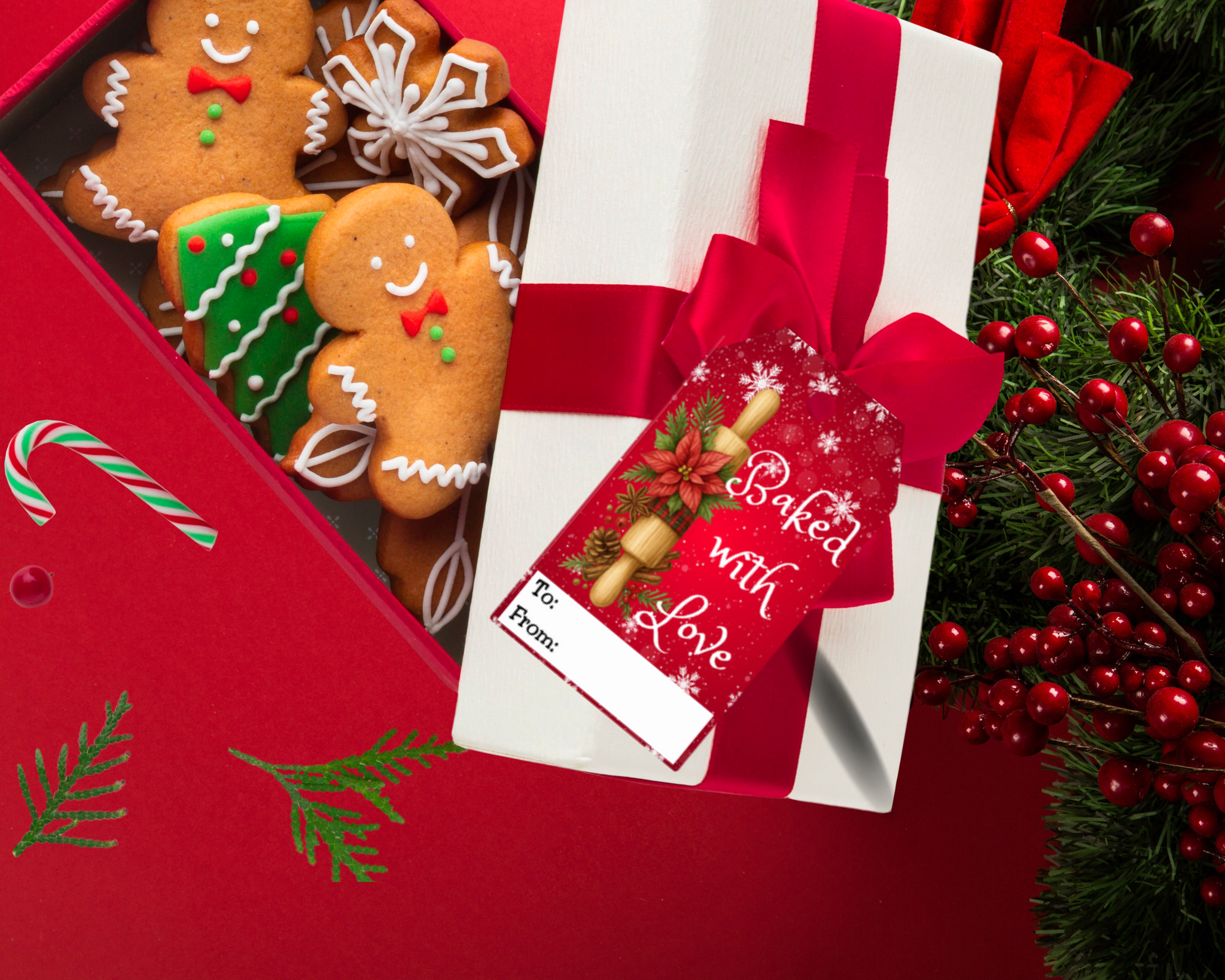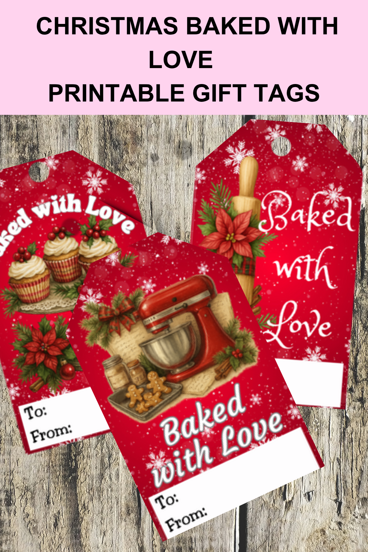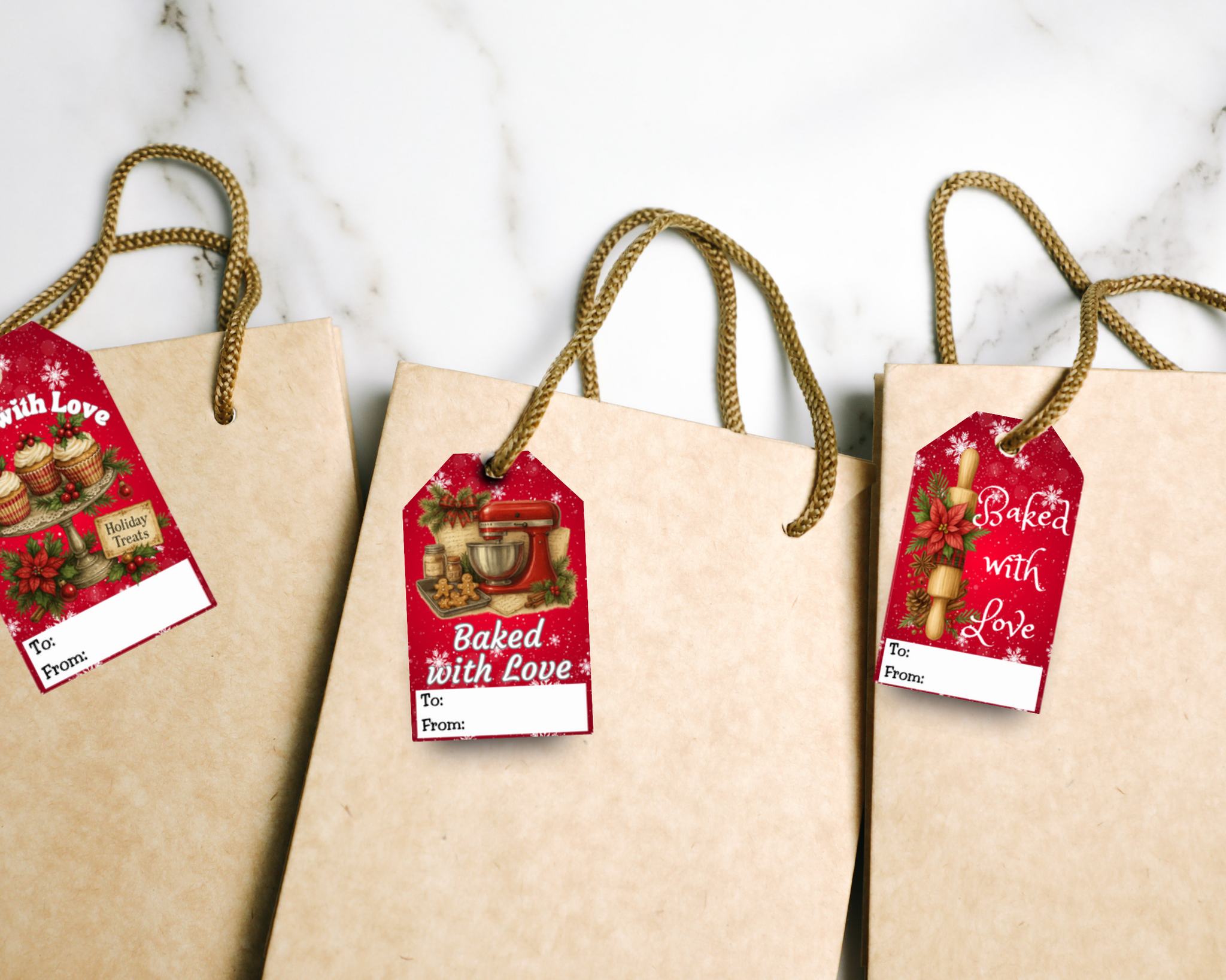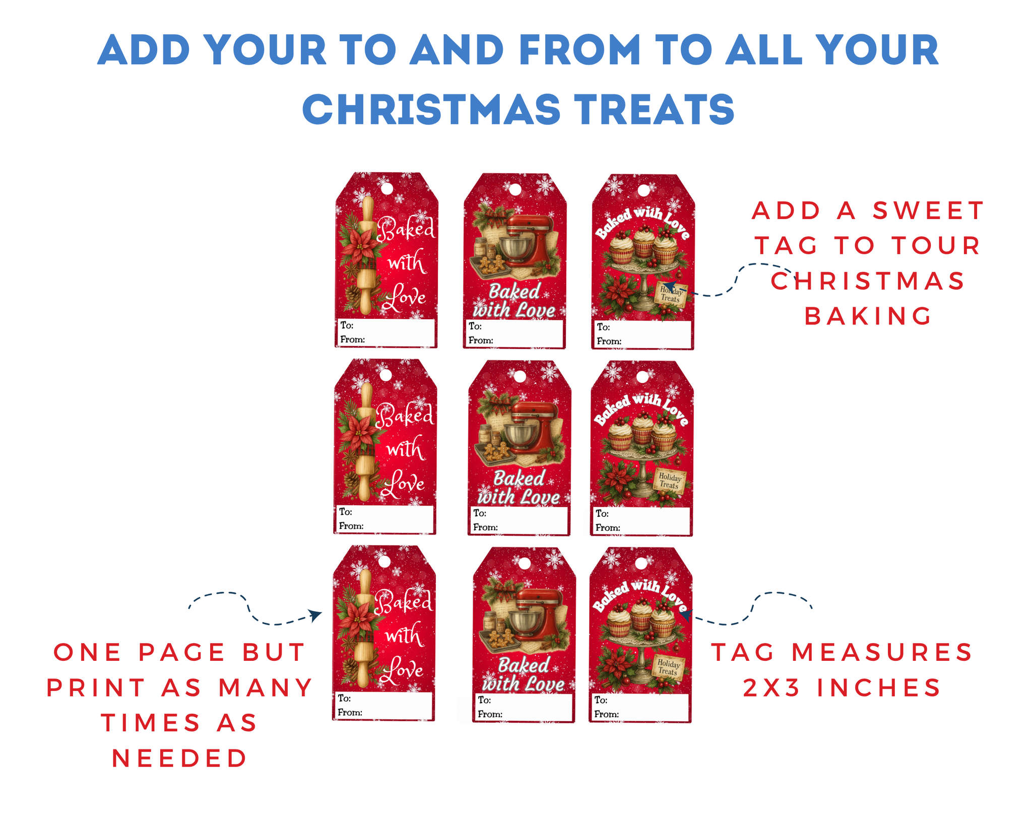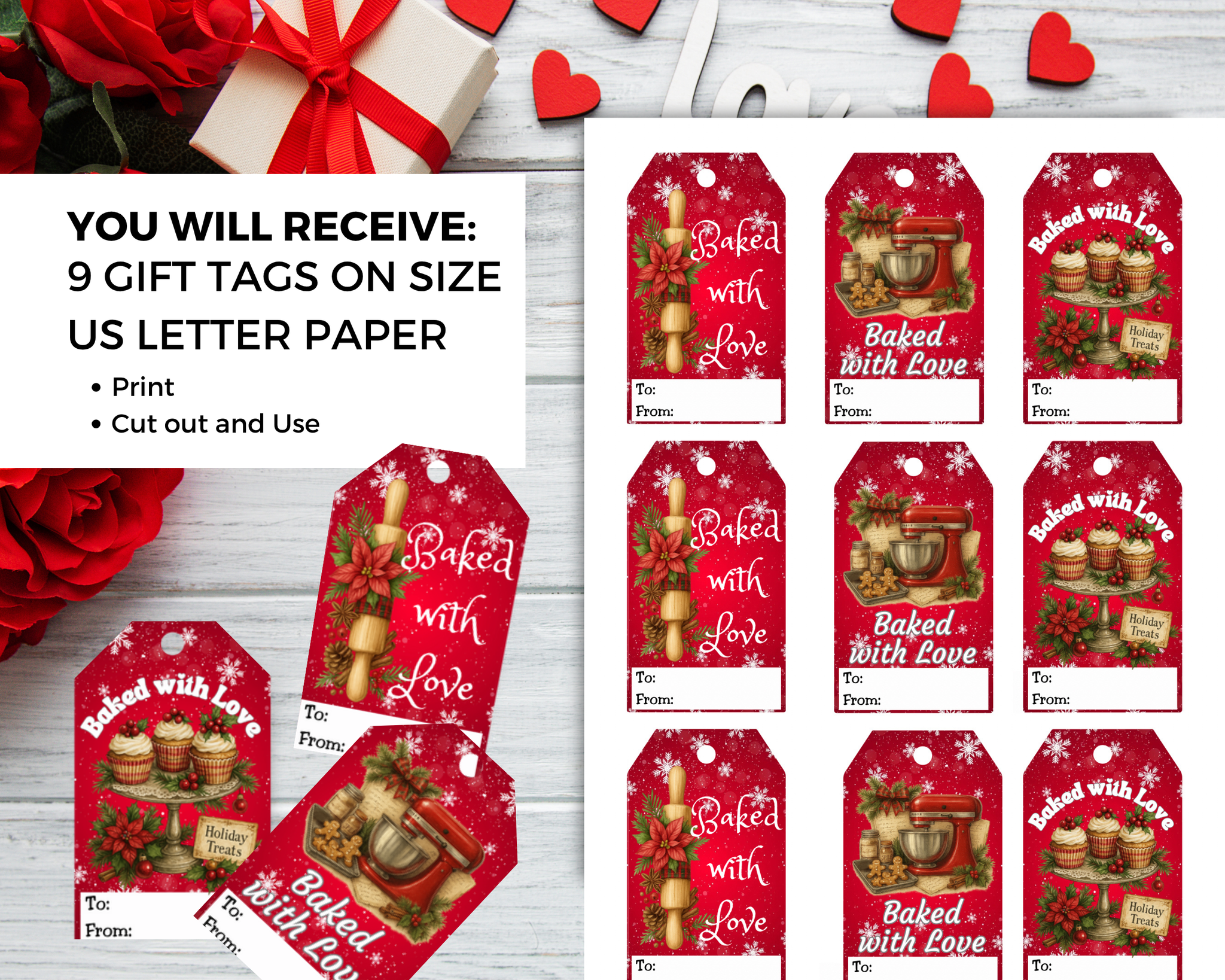Each printable sheet includes 9 tags (2x3.5 inches each) with three different designs—a vintage red mixer with gingerbread cookies, a cupcake stand with holly accents, and a festive rolling pin surrounded by poinsettias and pinecones. Every tag says “Baked With Love” to show your sweet holiday spirit!