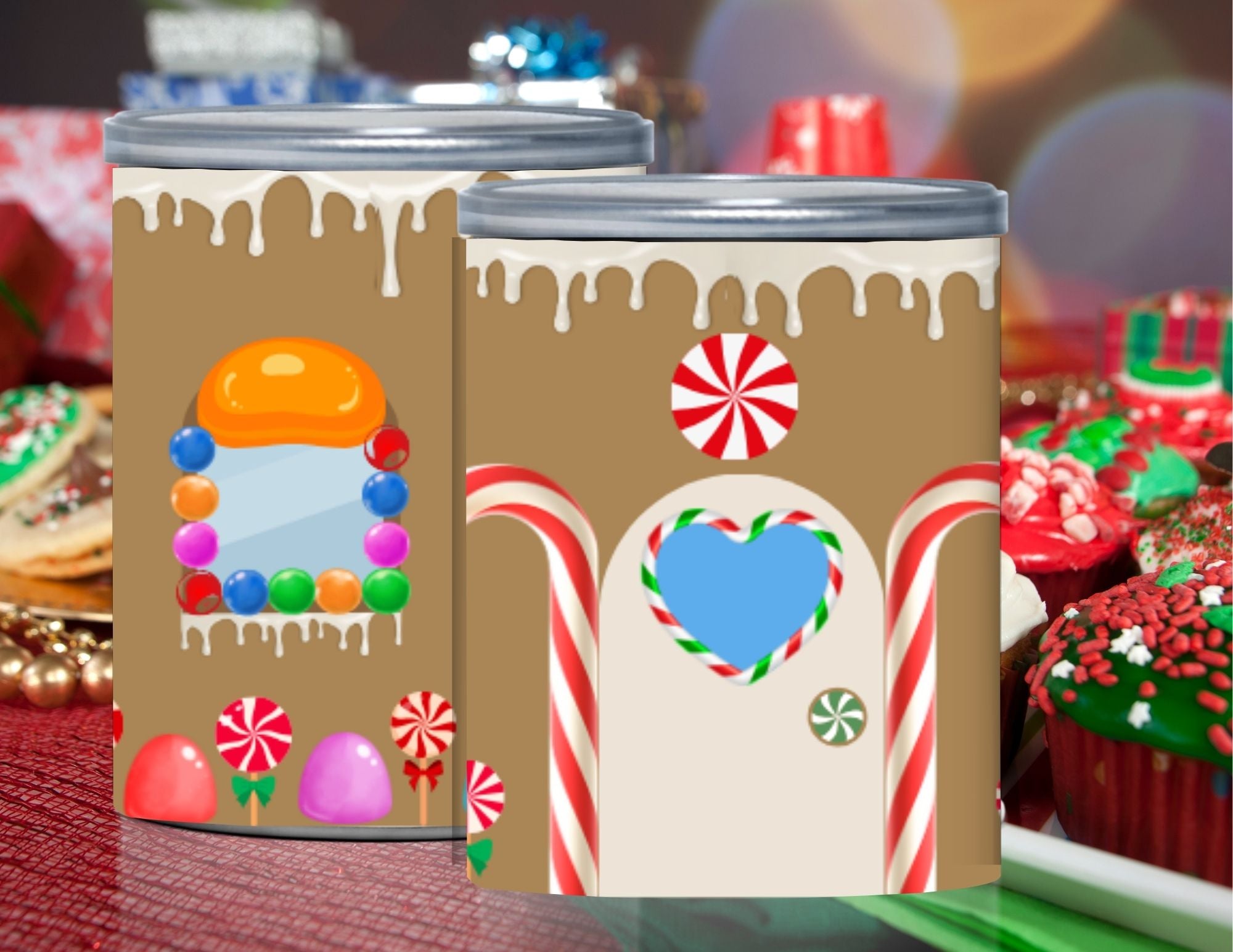 Each wrapper features a brown gingerbread background decorated with white icing drips, candy canes, gumdrops, and peppermint swirls — creating a cozy, sweet gingerbread house look. The matching lid wrapper completes the design with the same background and “Merry Christmas” written in a fun gingerbread-style font for the perfect festive finish.