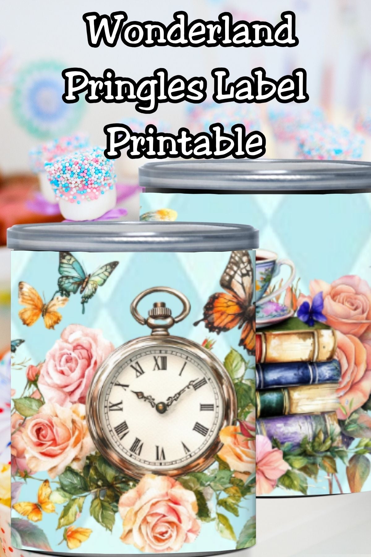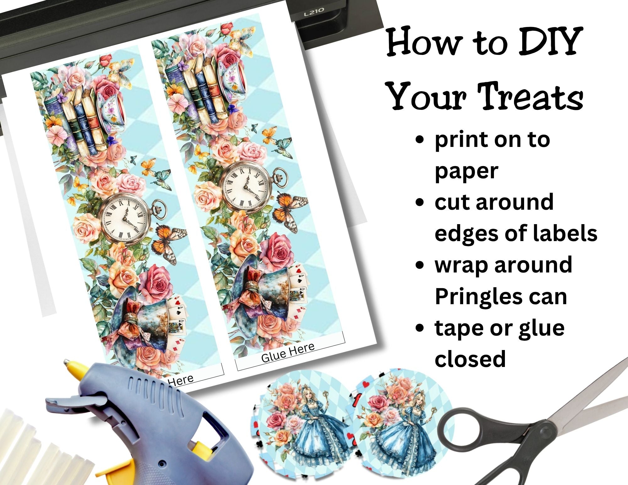 ✨ Add a touch of Wonderland whimsy to your next celebration — your guests will be delighted by these charming Pringles can wrappers!